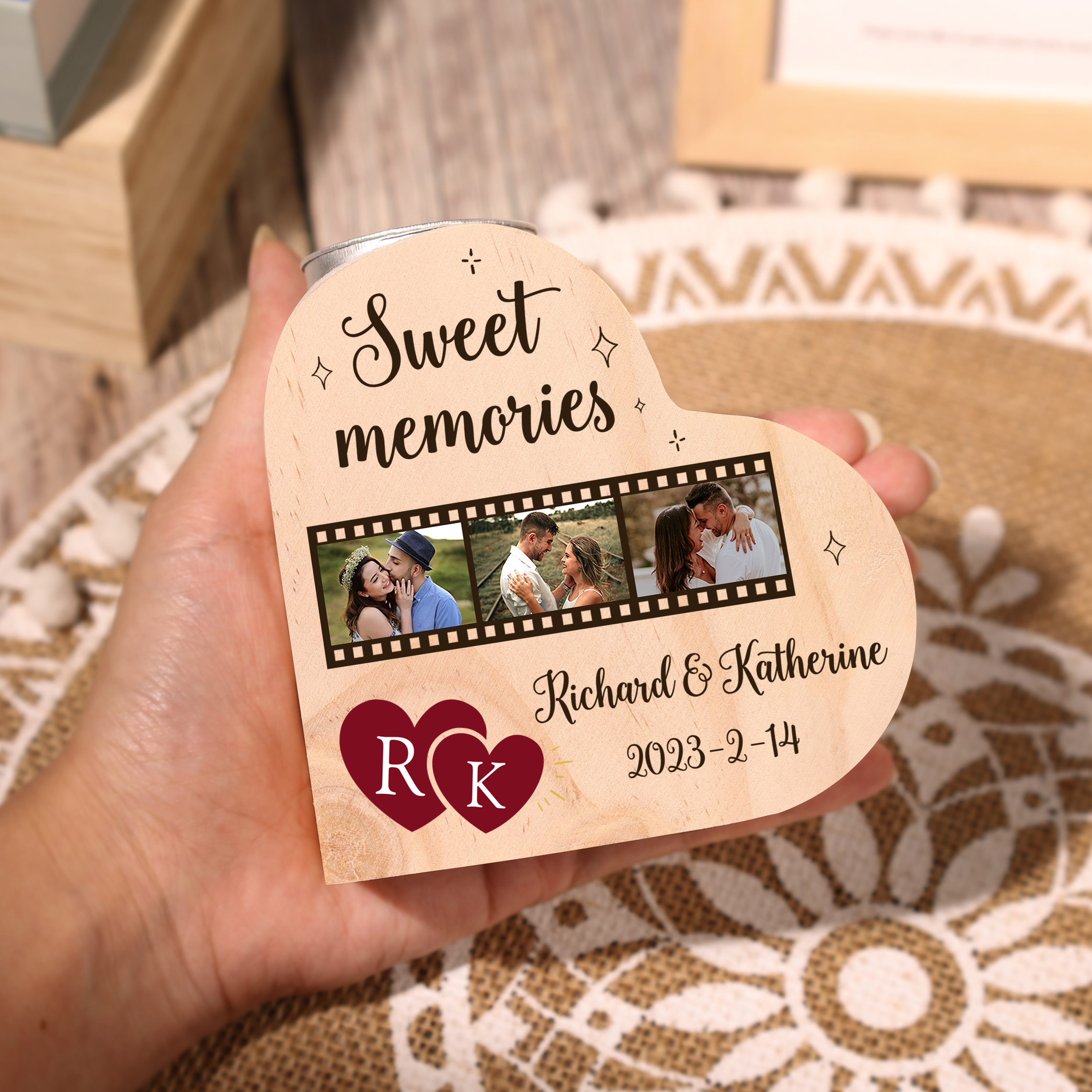 Personalized Love Couple Heart Candle Holder Engrave Photo Wooden Candlesticks Valentines Gift