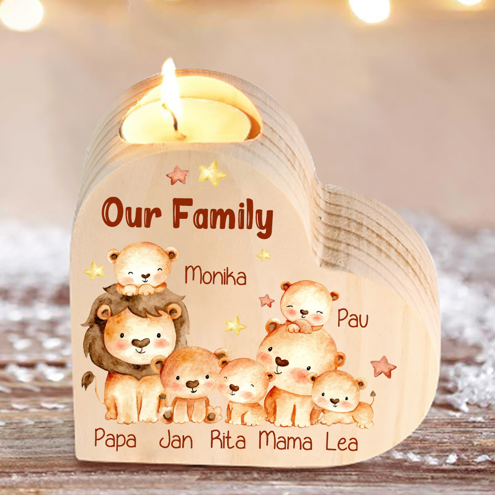 7 Names-Custom Family Lions Wooden Candlestick-Personalized Names Heart Candle Holder Christmas Gift for Family
