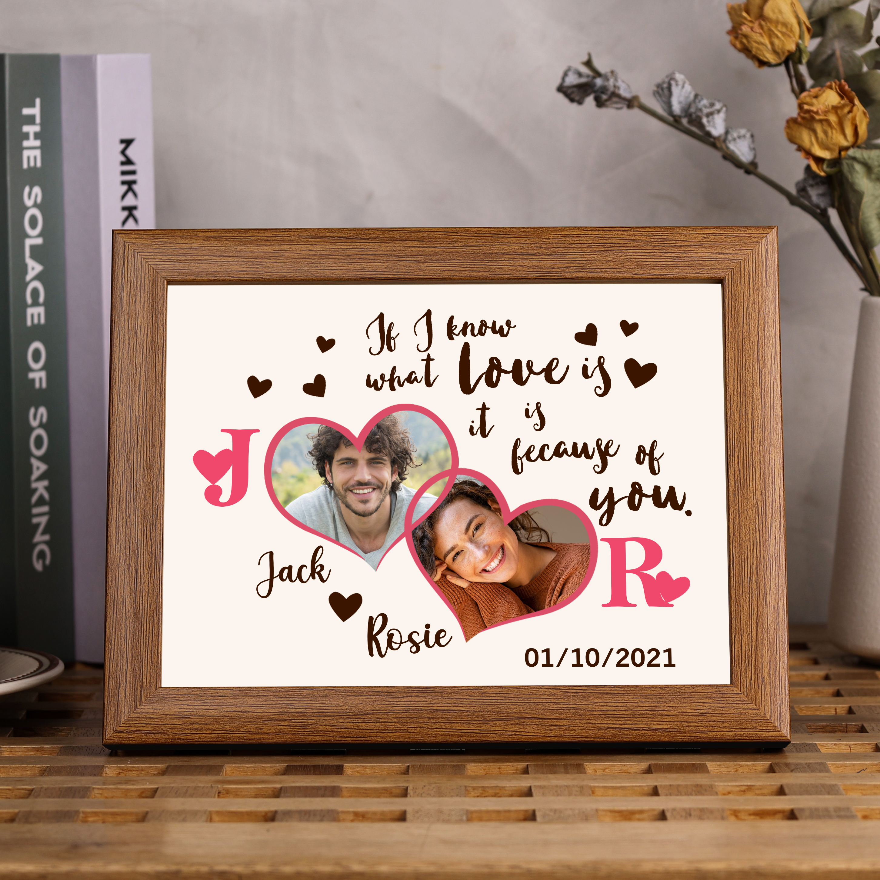 2 Names-Personalized Wooden Frame Custom Names and Date Pink for Couple