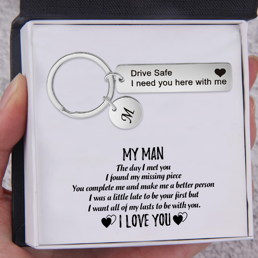 Personalized To My Man Keychain Set with Gift Card Gift Box-Drive Safe,I Need You Here with Me-Custom Name Initials Letter