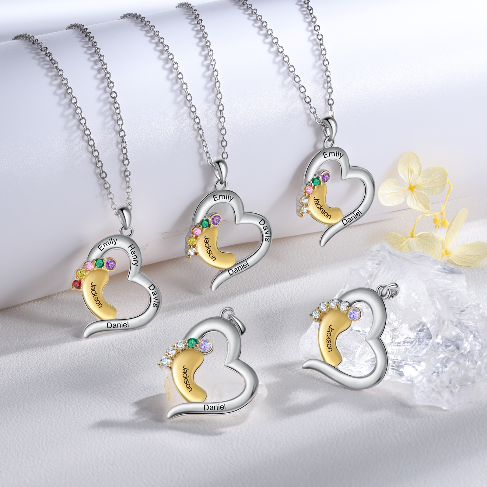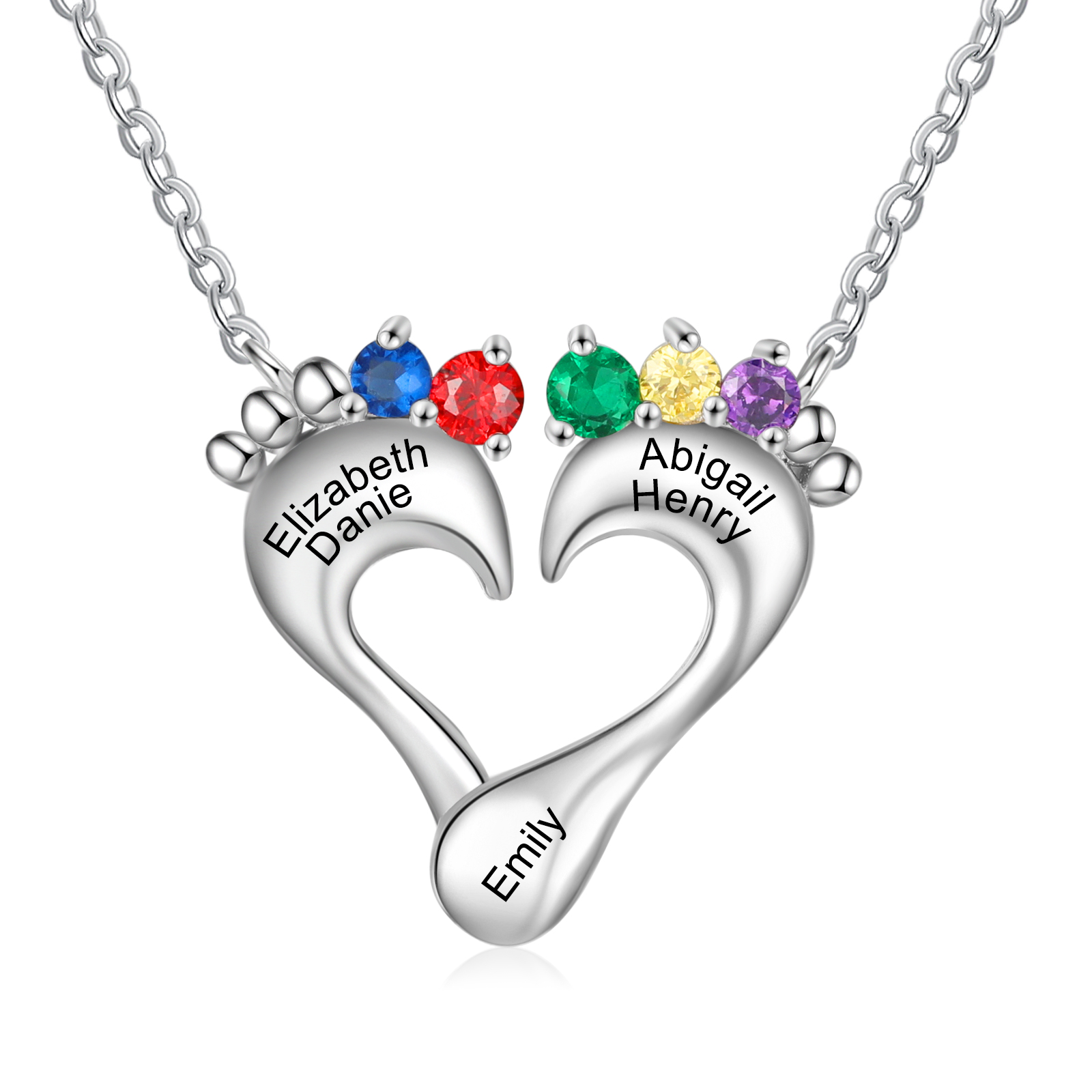 Personalized Baby Feet Necklace Custom 5 Birthstones Heart Necklace Gifts for Women