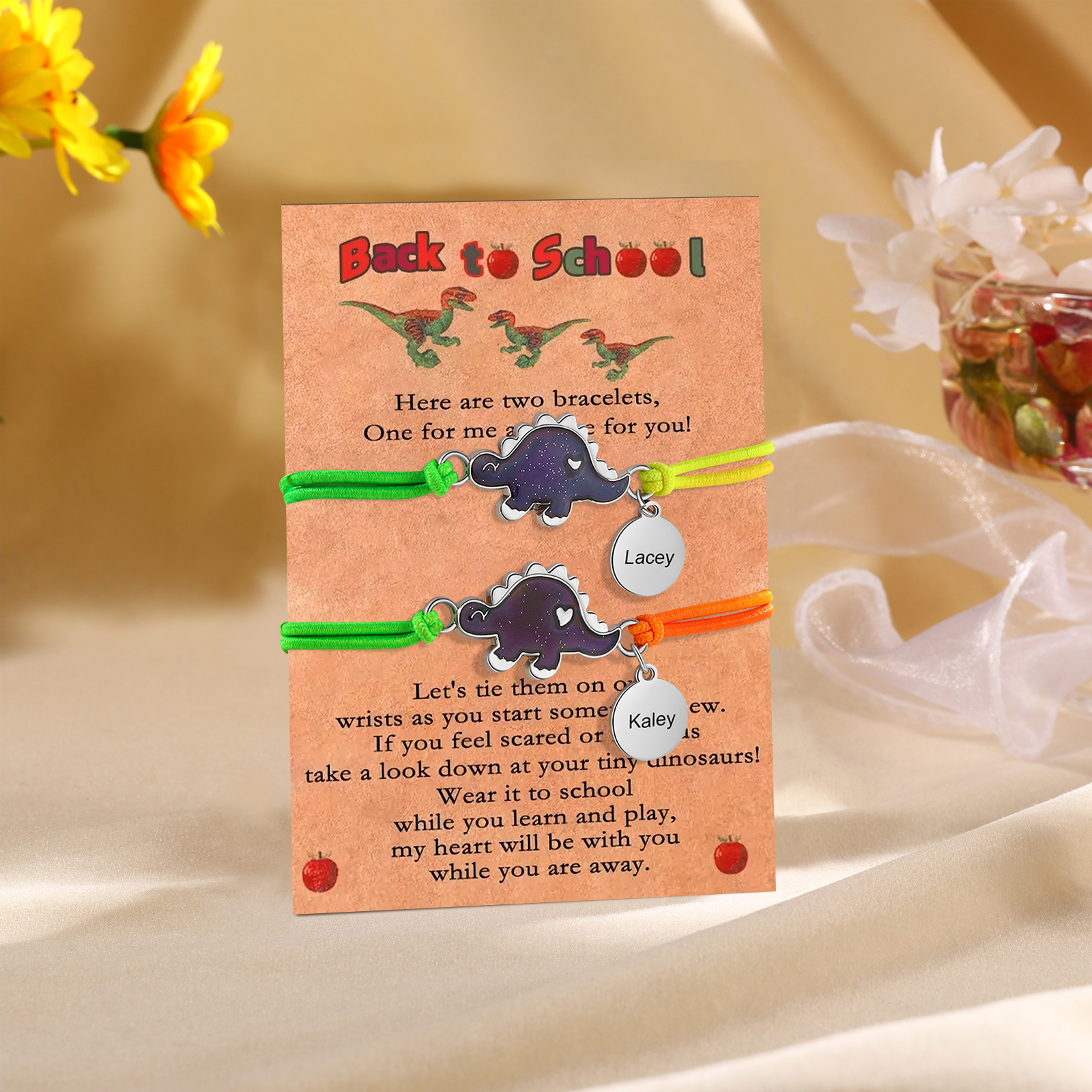 2 Pcs Dinosaur Bracelet Set Adjustable Bracelets with Gift Card First Day of School Mommy & Daughter Gifts