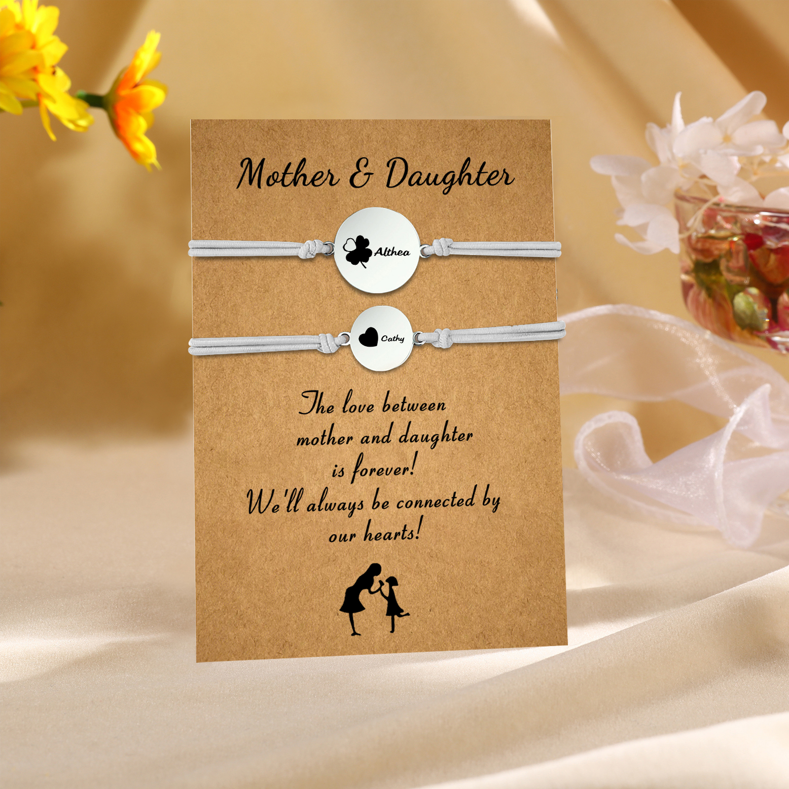2PCS Personalized 2 Birthflowers and 2 Names Elastic Stainless Steel Bracelet Mother and Daughter Back to School Gift for Daughter