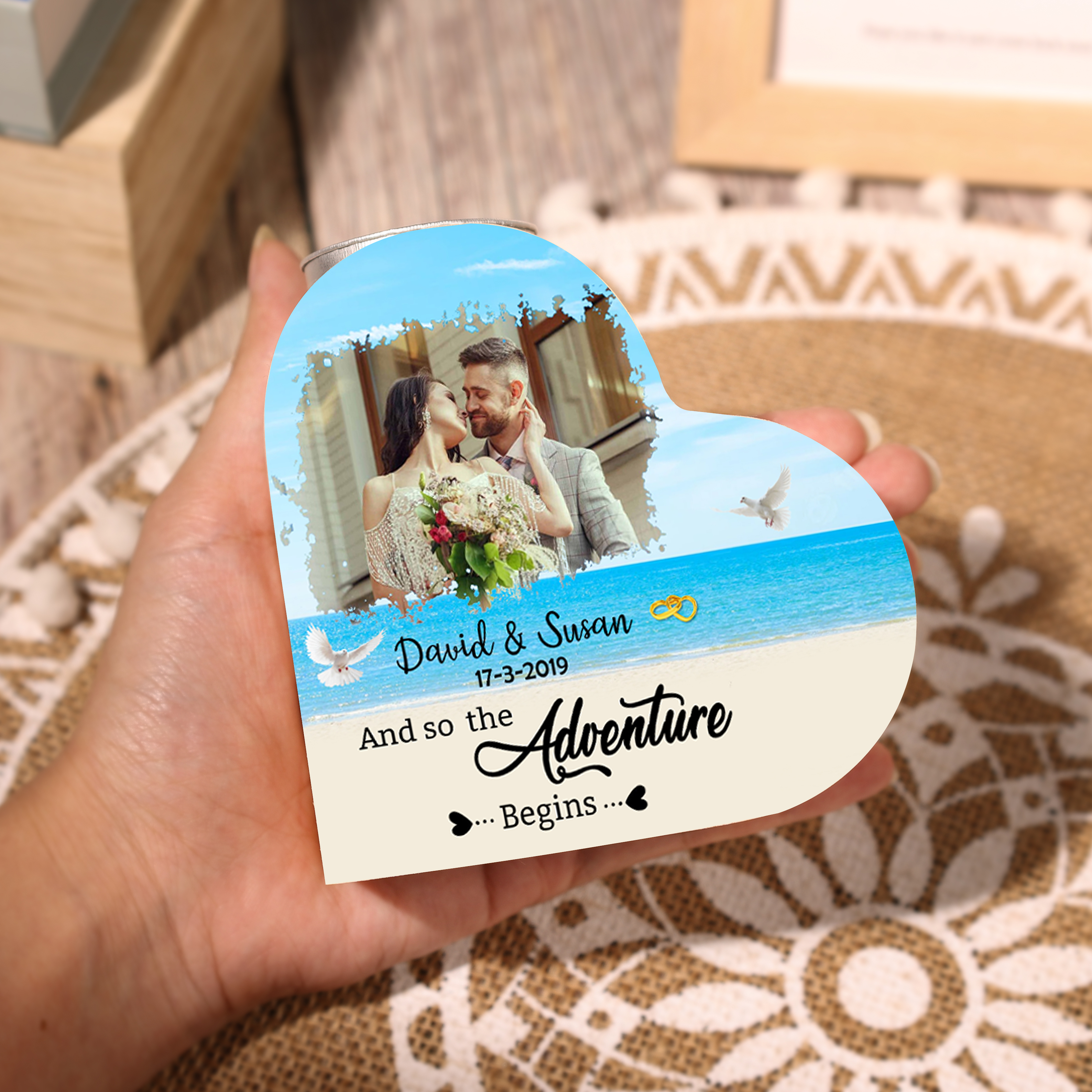 Personalized Love Couple Heart Candle Holder Engrave Photo Wooden Candlesticks Valentines Gift