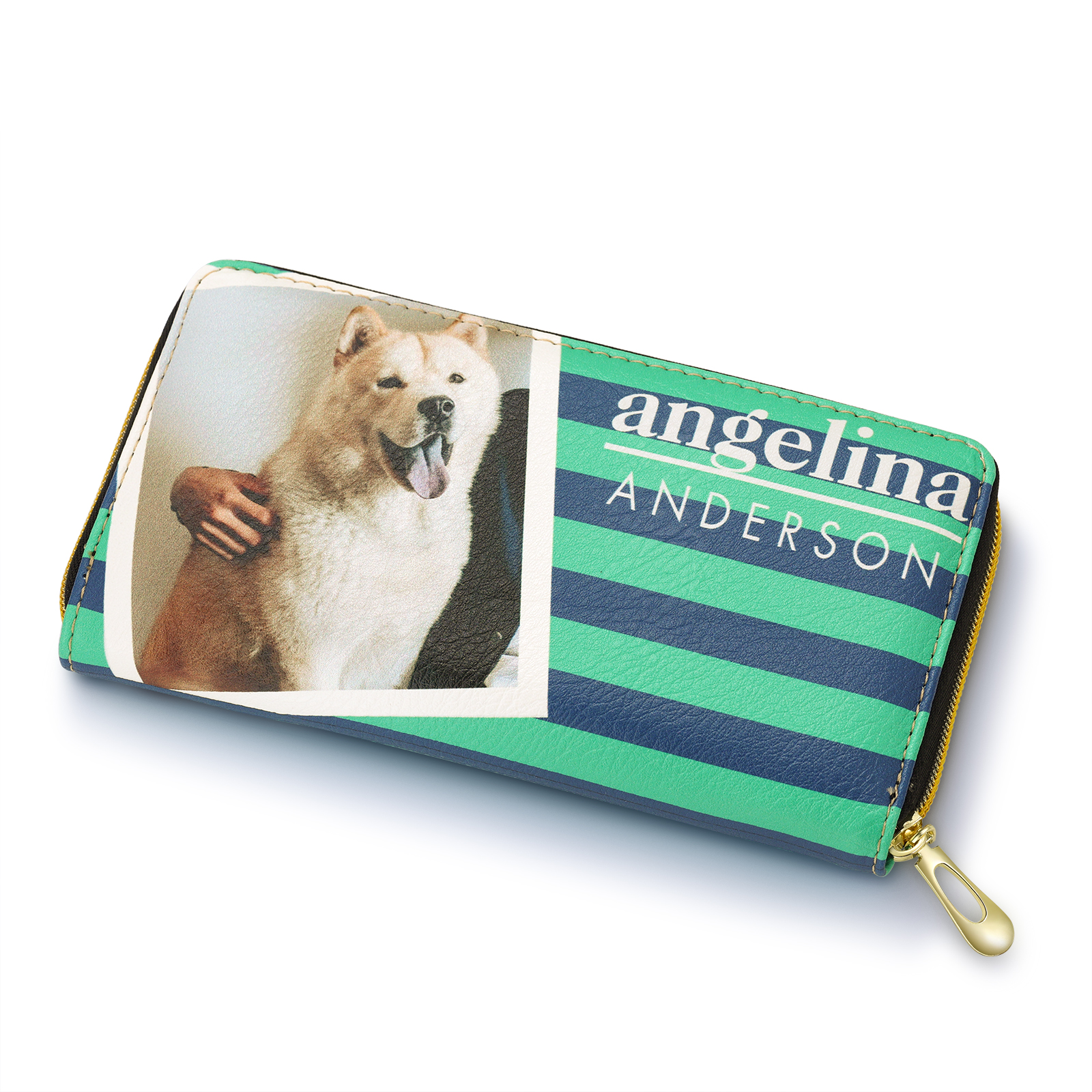 Long Purse Personalized Stripe Leather Wallet Engraved 1 Photo Zip Wallet Gifts for Her