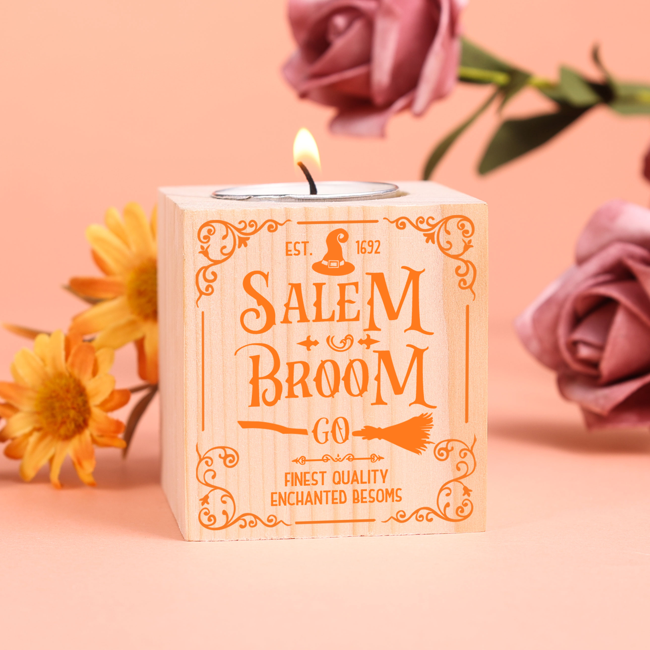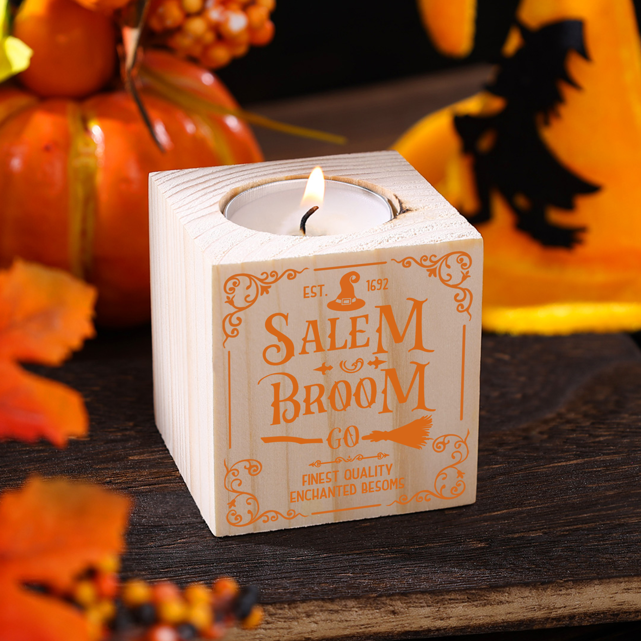 Halloween Wooden Candle Holder Block Candlesticks Salem Broom Candle Holder Halloween Decoration Gift for Family Friends