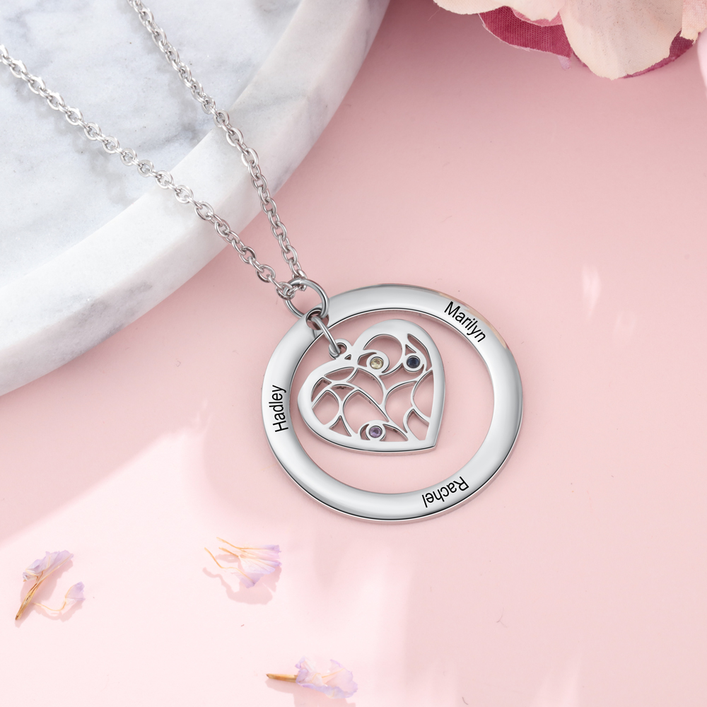 Customized Family Tree Necklace with Birthstones Engraved 3 Names Circle Heart Necklace for Women