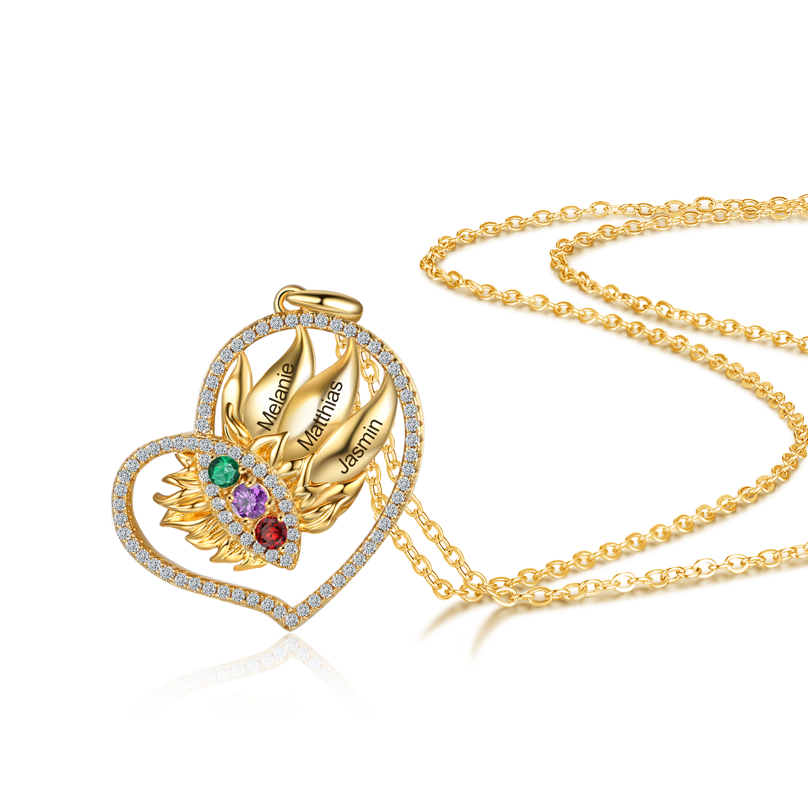 Personalized Heart Necklace With 3 Birthstones Engraved Names Gift For Women