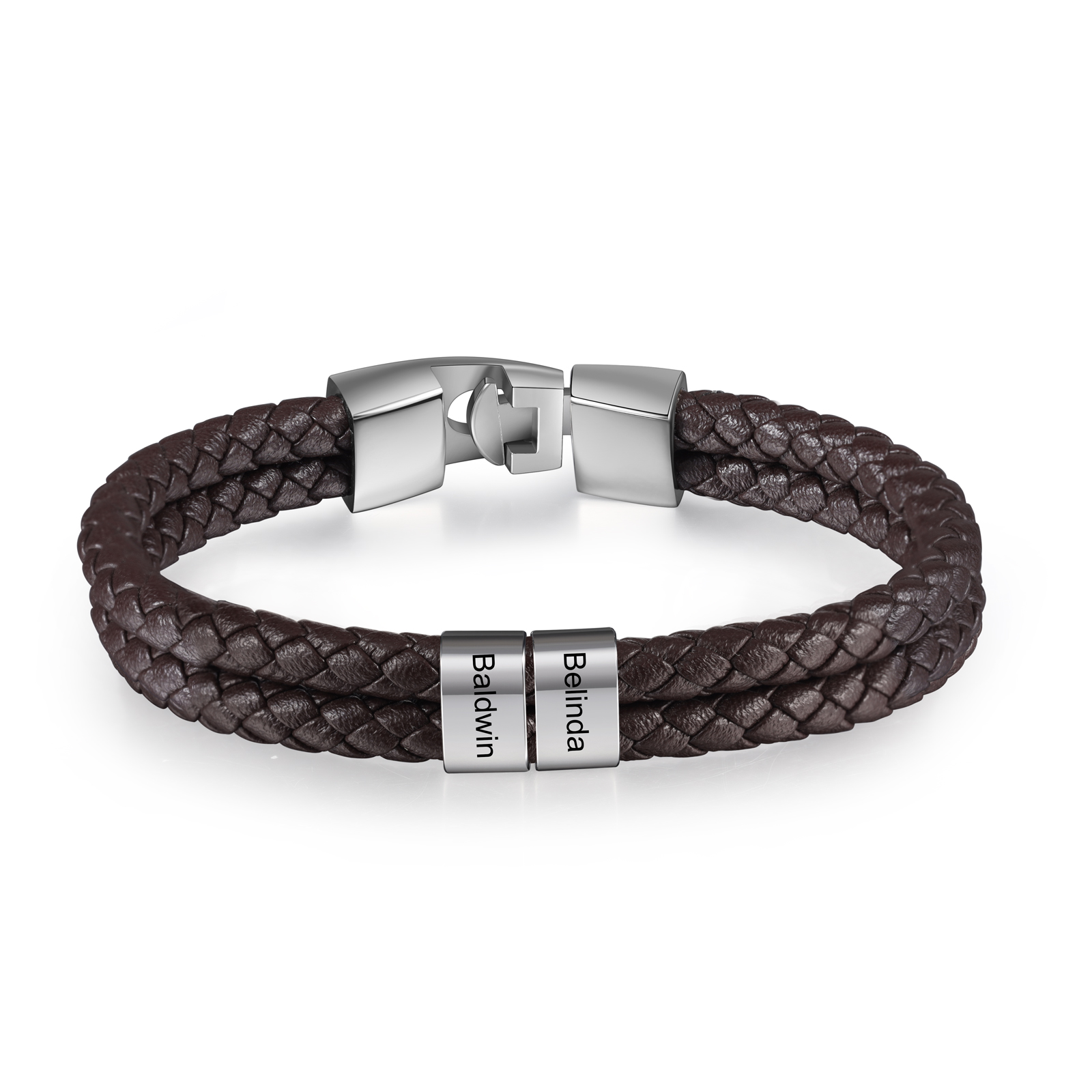 Brown Personalized Double Layered Braided Leather Bracelet Engraved 2 Names Mens Bracelet for Him