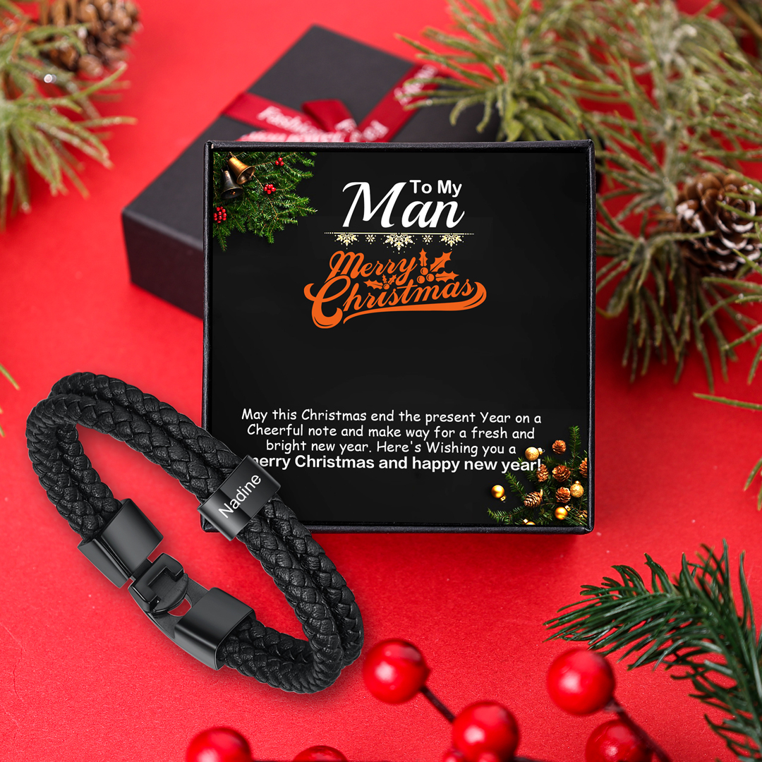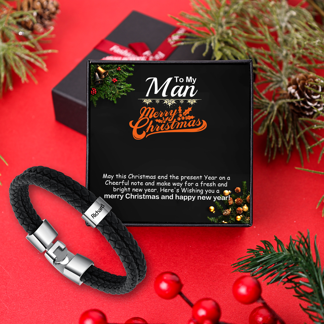 1 Name-Personalized Braided Leather Bracelet Set With Gift Box-Custom Men's Bracelet Engraved 1 Name for Him