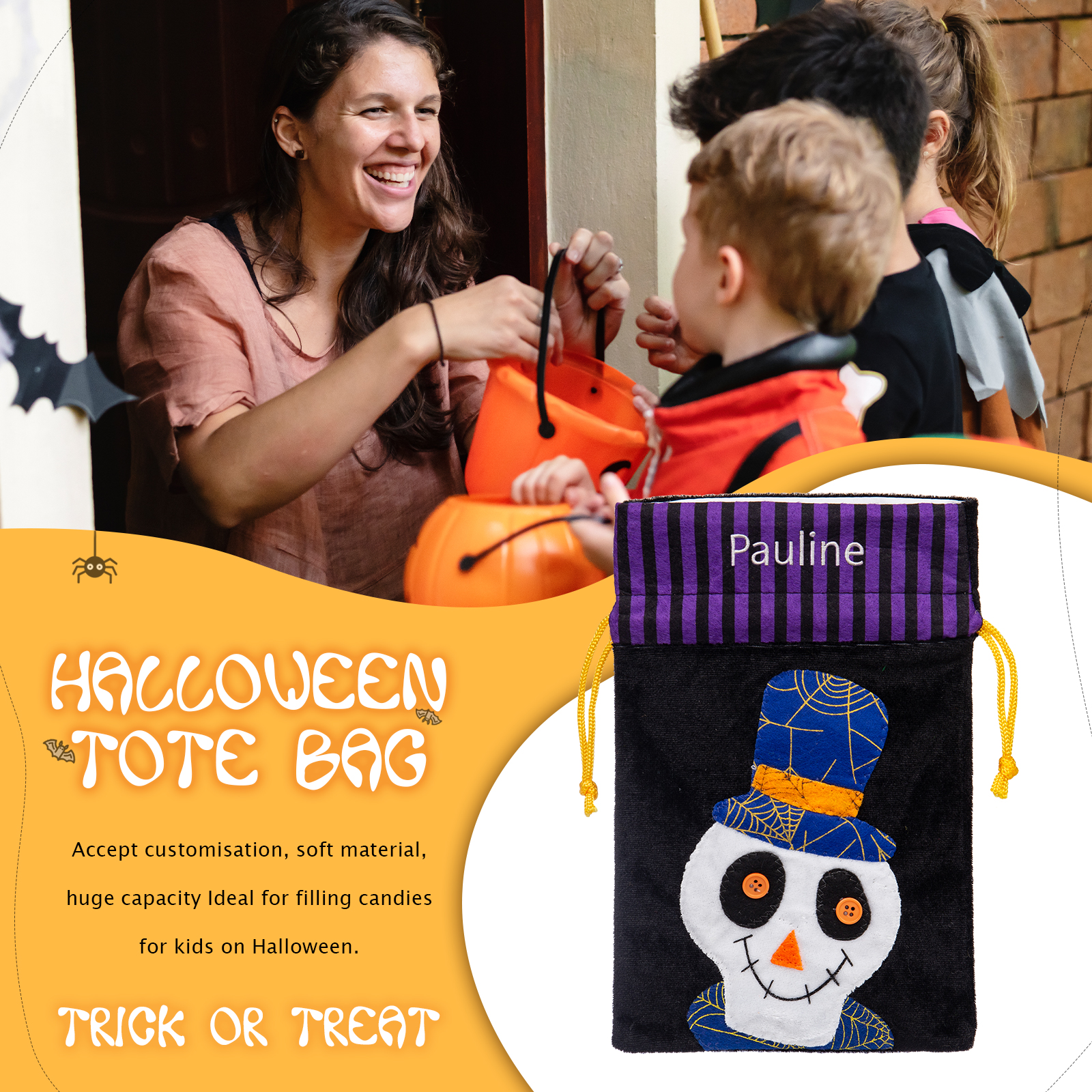 🎃Introducing our latest Halloween Candy Bag, now available with customizable names! This spooktacular candy bag is the perfect accessory for trick-or-treating and Halloween parties. Made from durable materials, it ensures your candies stay safe and secure throughout the night.