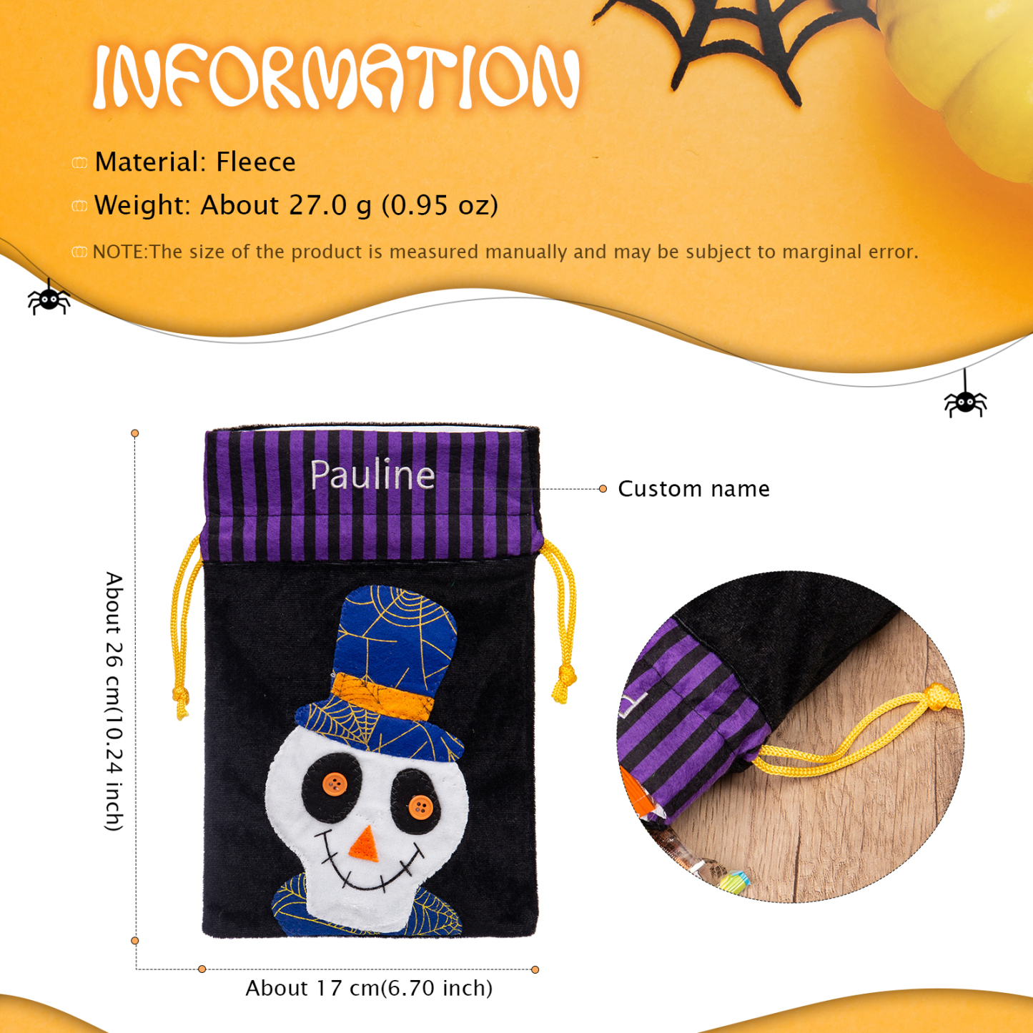 With our unique customization option, you can add your desired name to make this candy bag truly one-of-a-kind. Whether it's your own name, a spooky moniker, or a fun nickname, personalizing your candy bag adds an extra touch of Halloween magic.