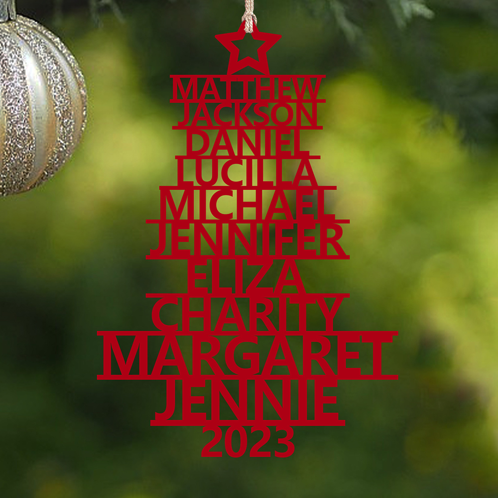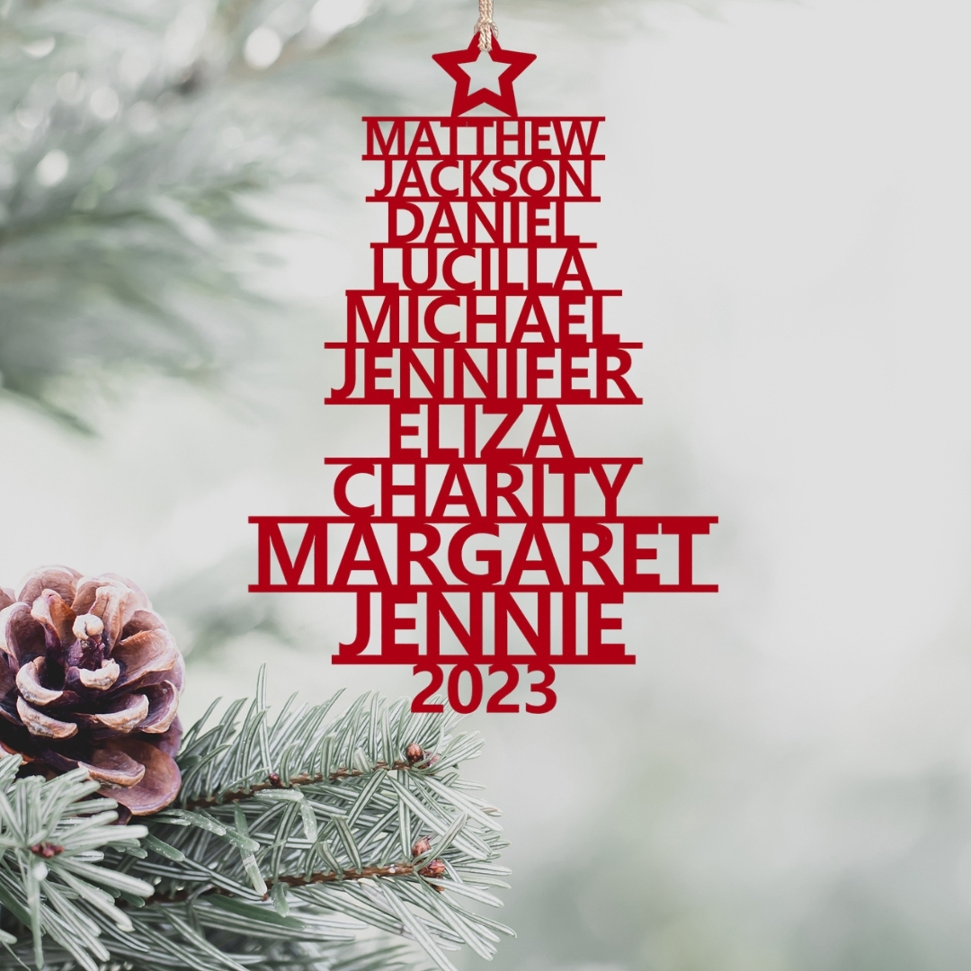 🎁Our customizable Christmas tree ornament, the "Name Tree!" This exquisite ornament allows you to personalize your tree with 2-14 names and a year of your choice. The names elegantly stack upon one another, forming the beautiful shape of a Christmas tree. Choose from three enchanting colors: red, green, and wood.