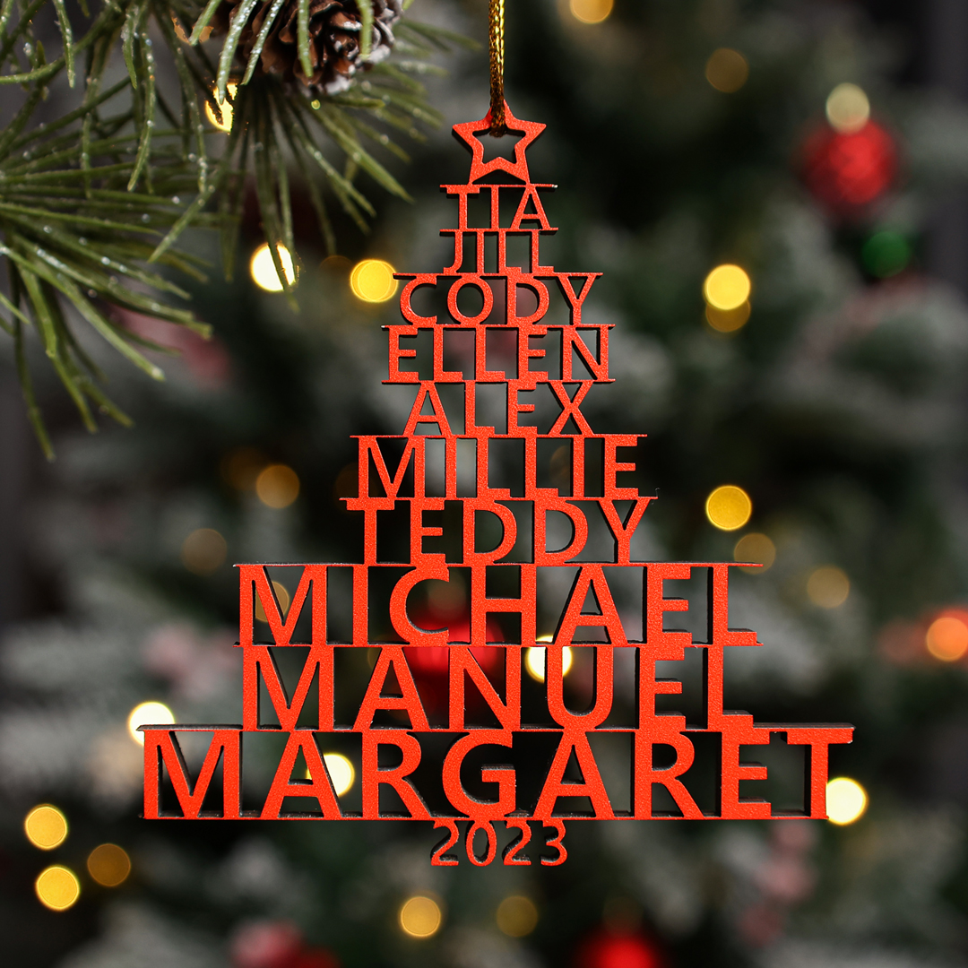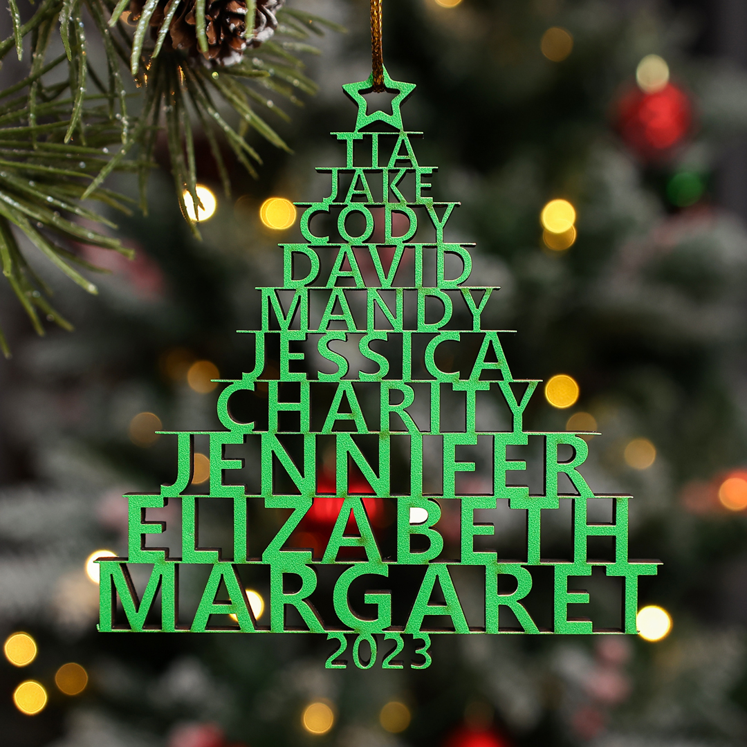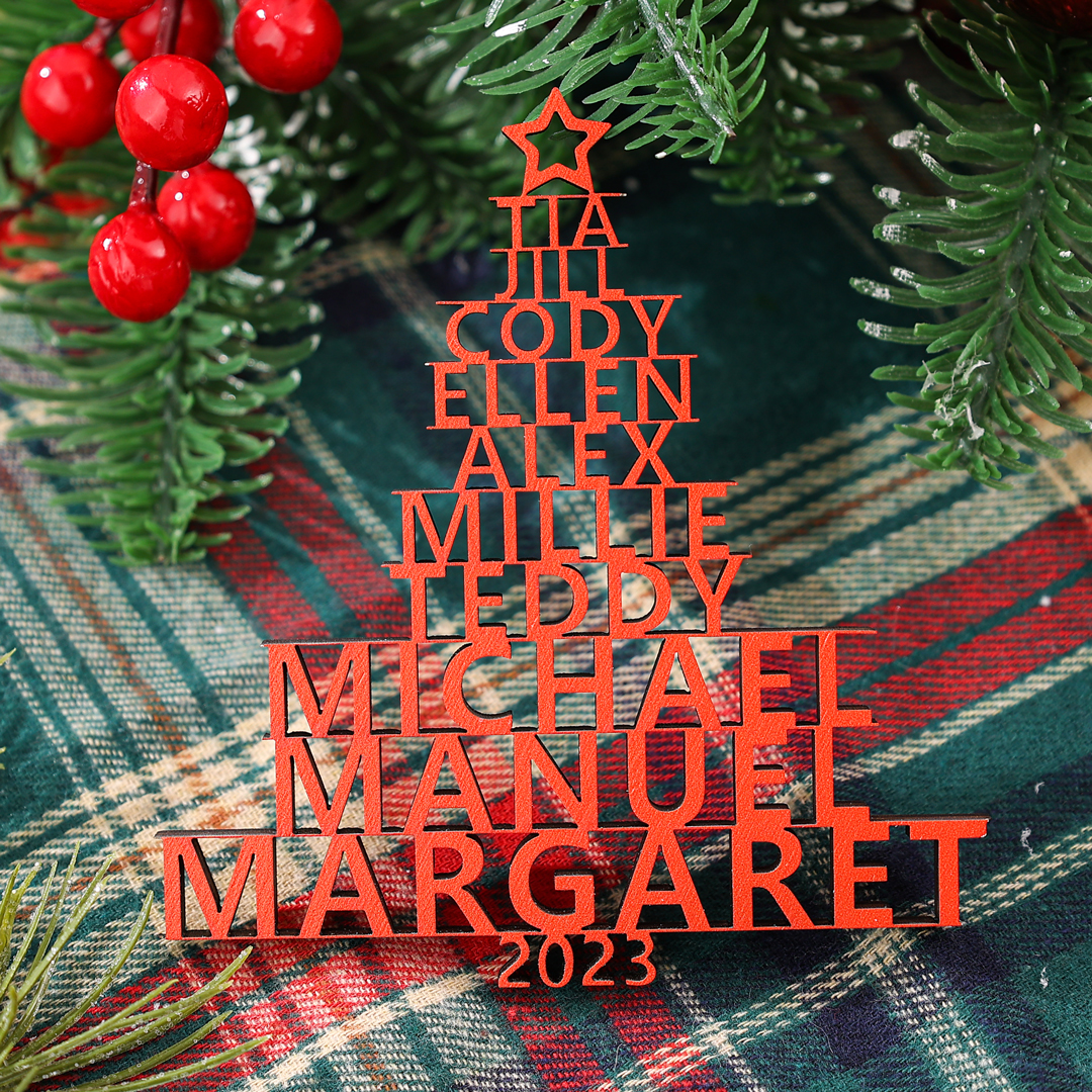 🎁Our customizable Christmas tree ornament, the "Name Tree!" This exquisite ornament allows you to personalize your tree with 2-14 names and a year of your choice. The names elegantly stack upon one another, forming the beautiful shape of a Christmas tree. Choose from three enchanting colors: red, green, and wood.