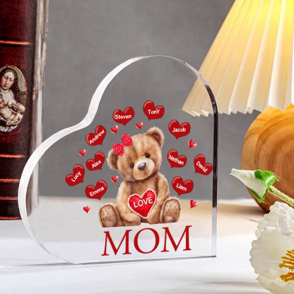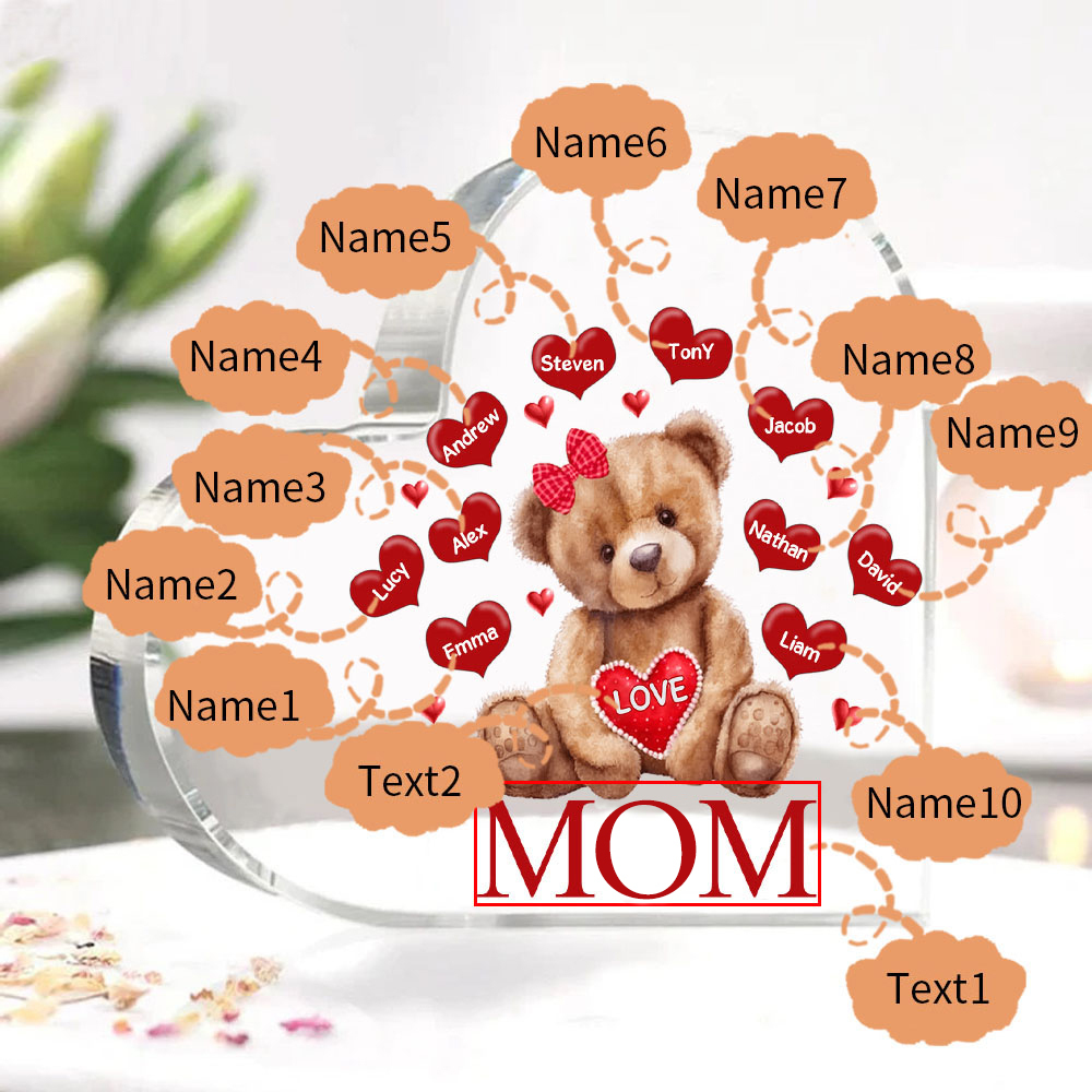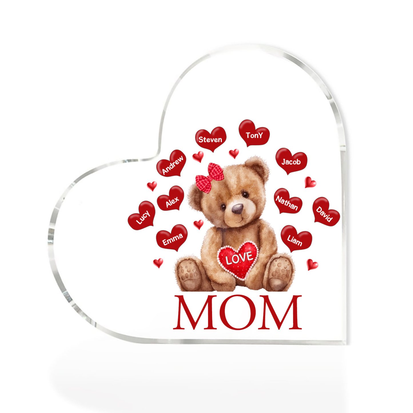 10 Names-Personalized Mom Acrylic Heart Keepsake Custom Text Love Teddy Bear Ornaments Gifts Set With Gift Box for Grandma/Mother