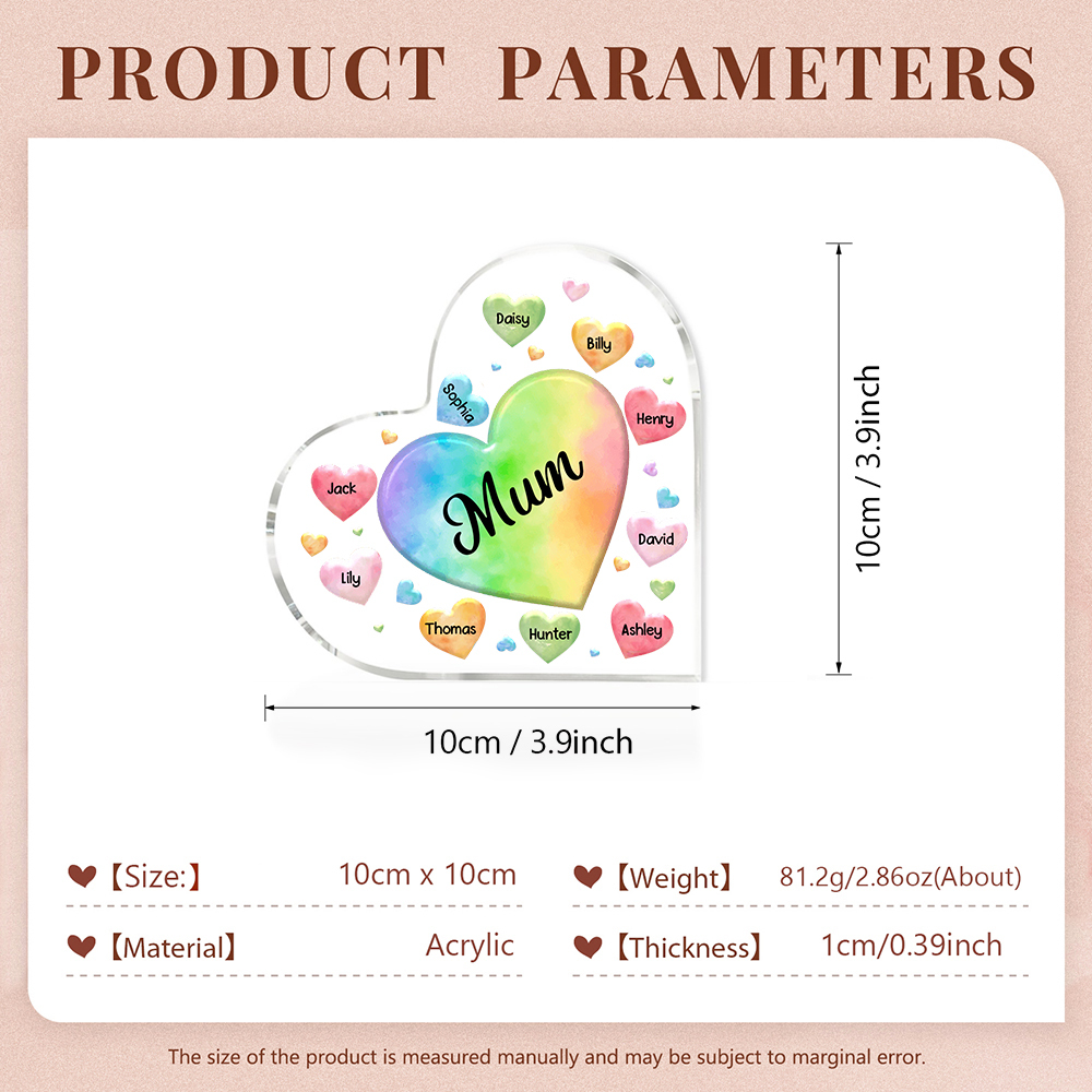 10 Names-Personalized Mum Colorful-Heart Acrylic Heart Keepsake Custom Text Acrylic Plaque Ornaments Gifts Set With Gift Box for Nan/Mother
