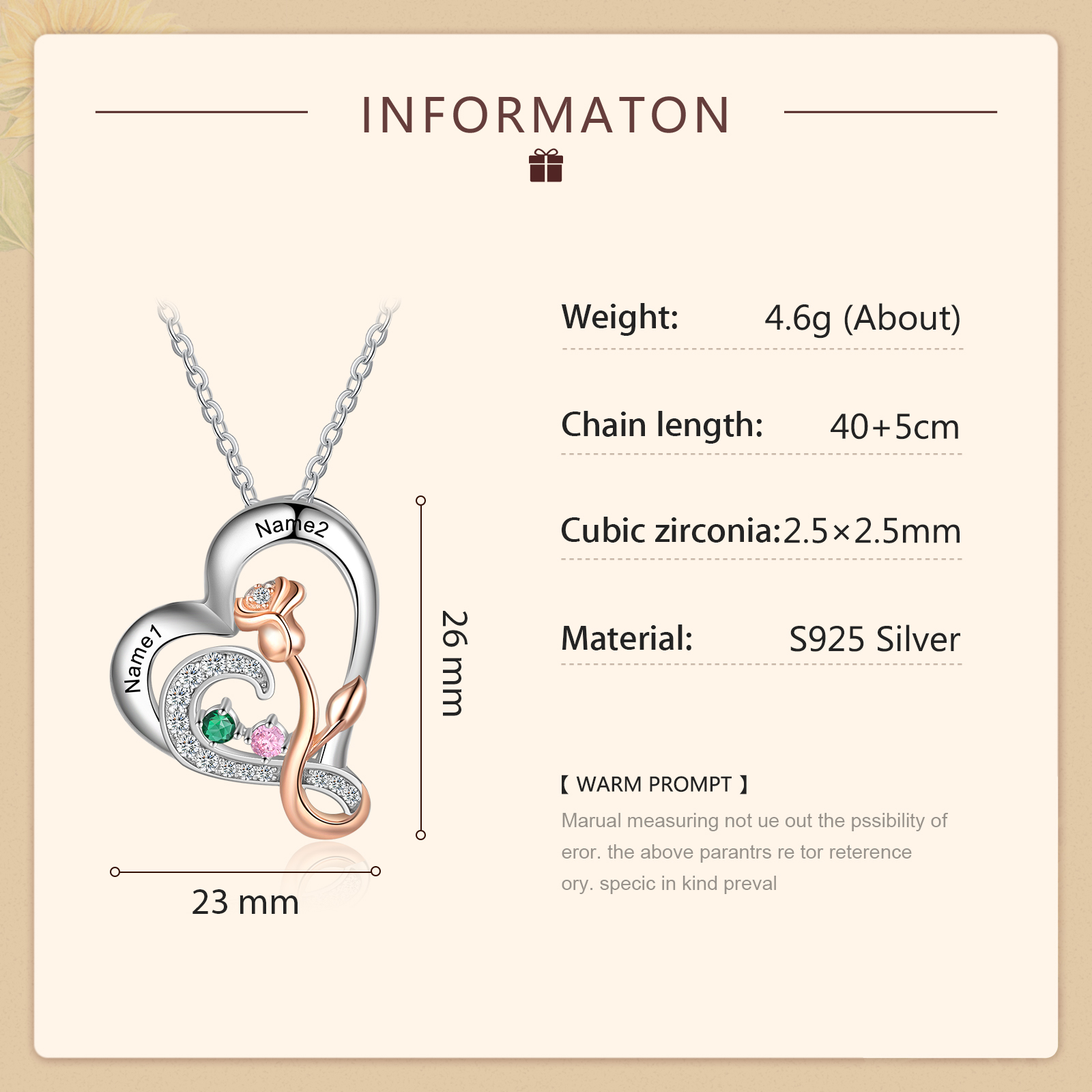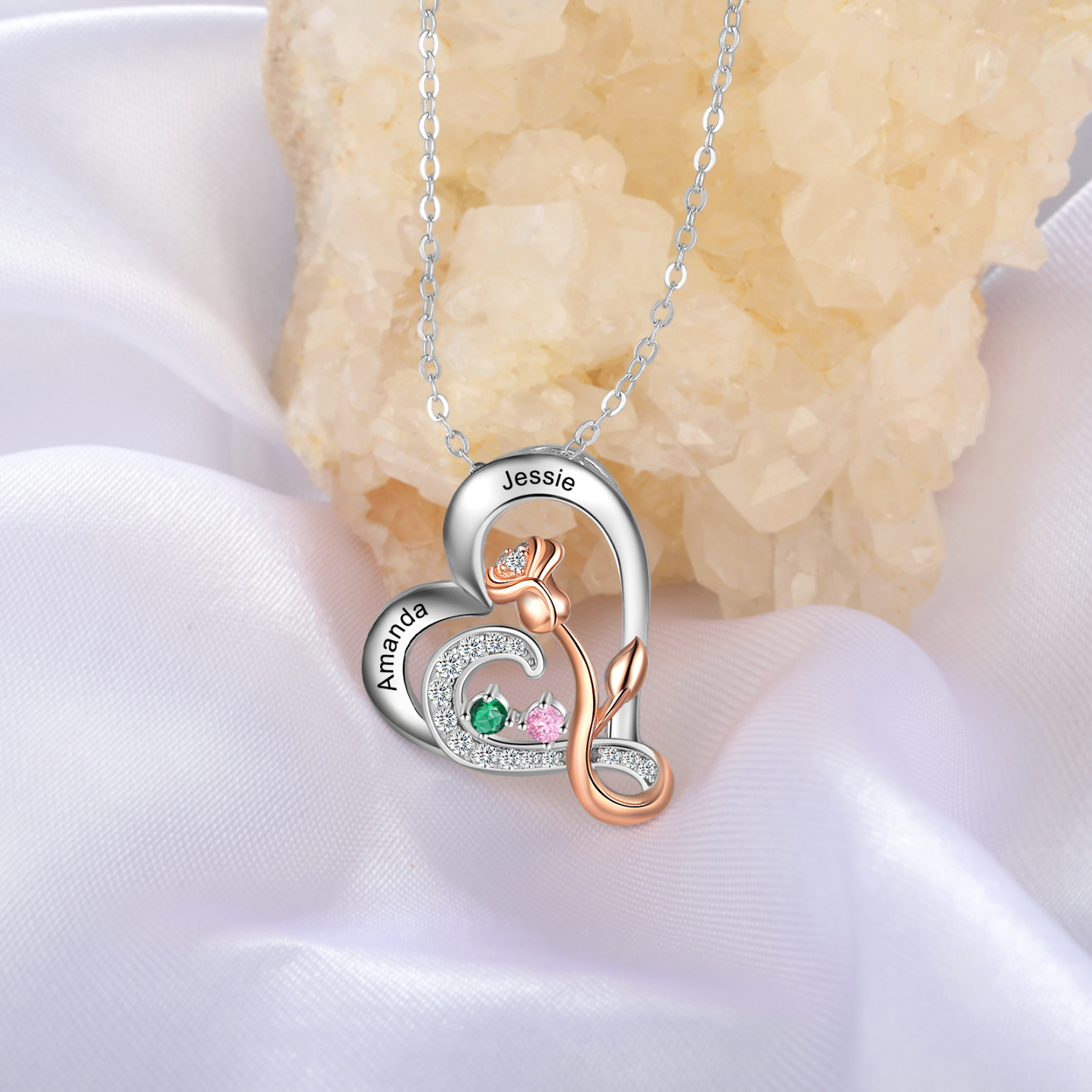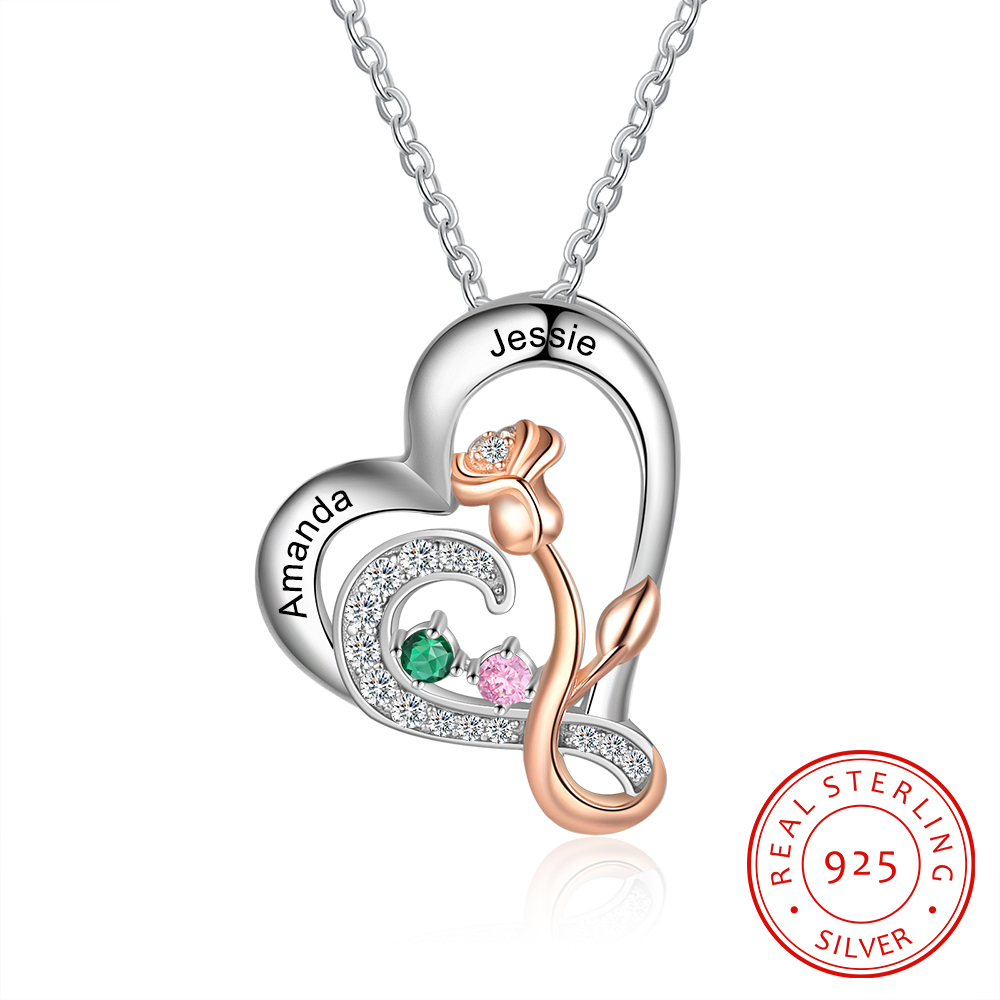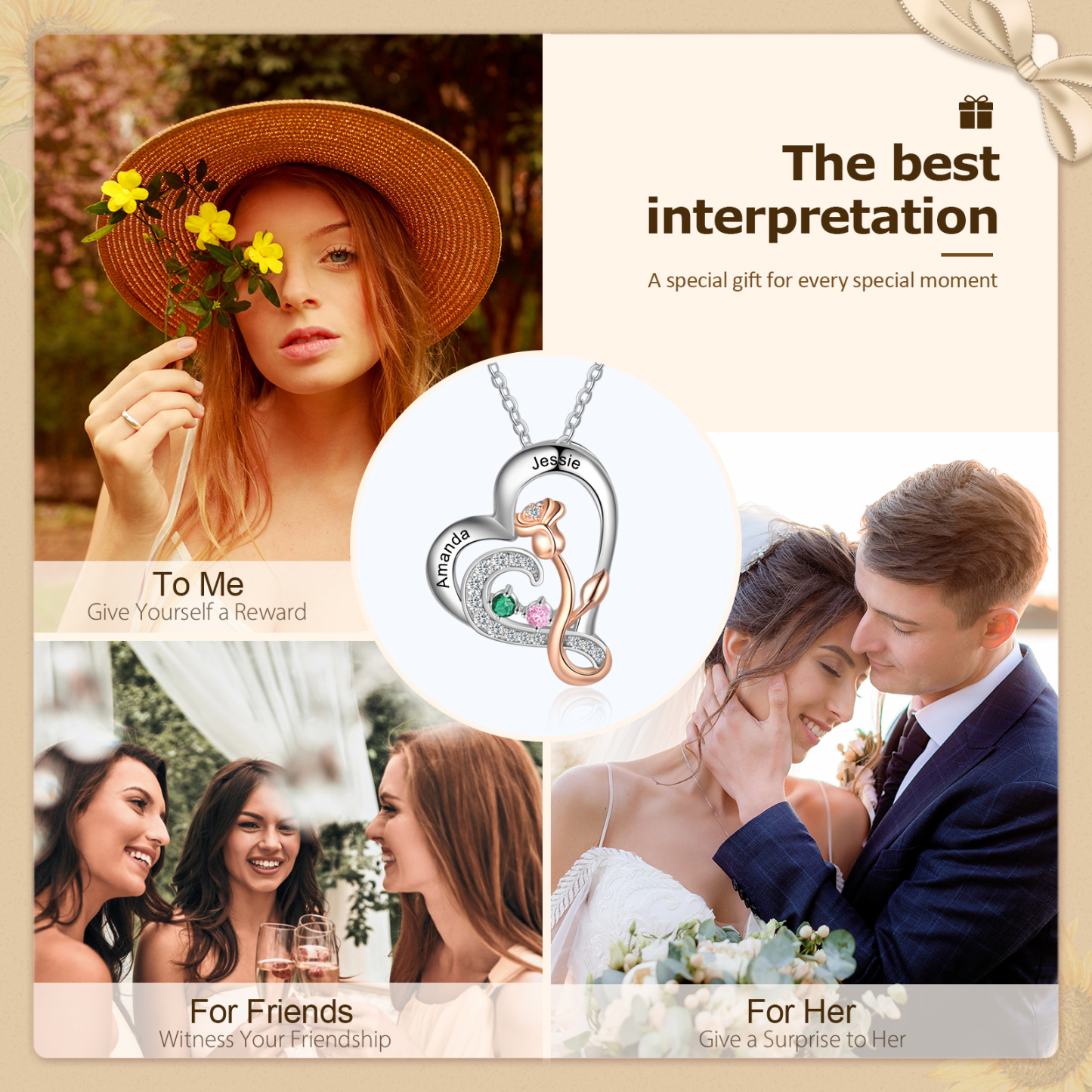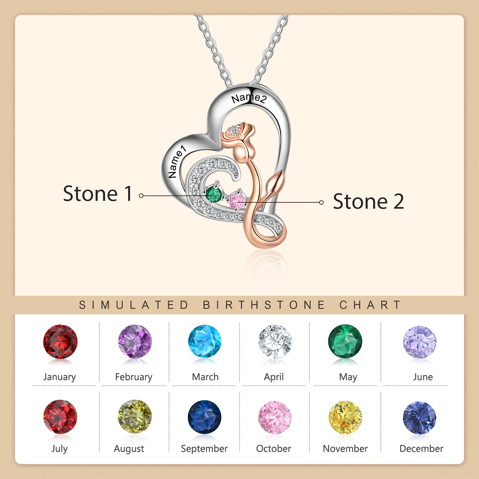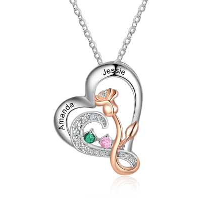 Personalized Flower Necklace With 2 Birthstones Engraved Names Necklace Gift For Women