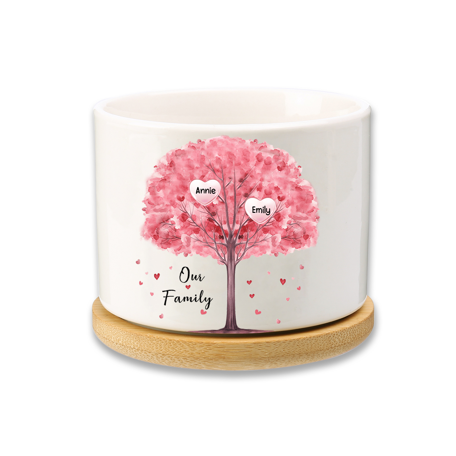 2 Names-Personalized Ceramic Flowerpot with Wooden Base Custom 2 Names & 1 Text Pink Family Tree Flowerpot Gift for Mother