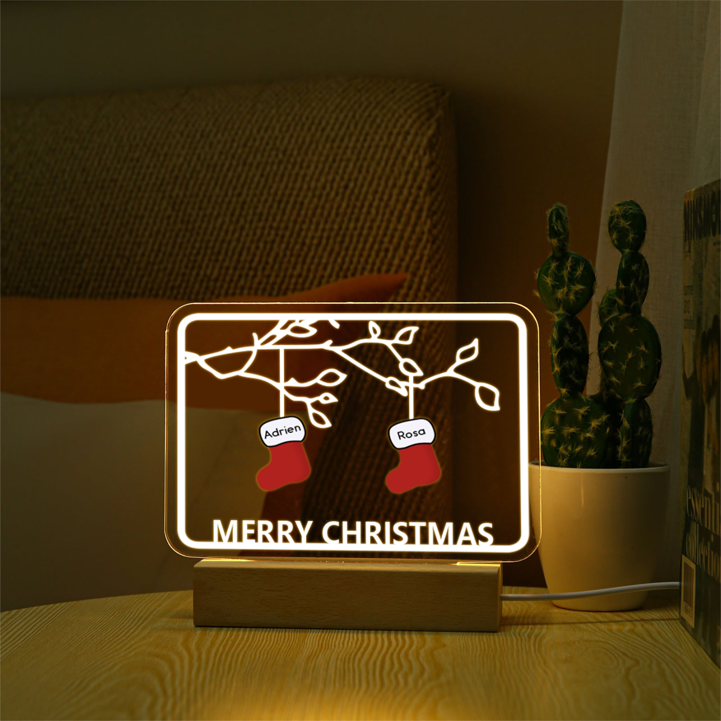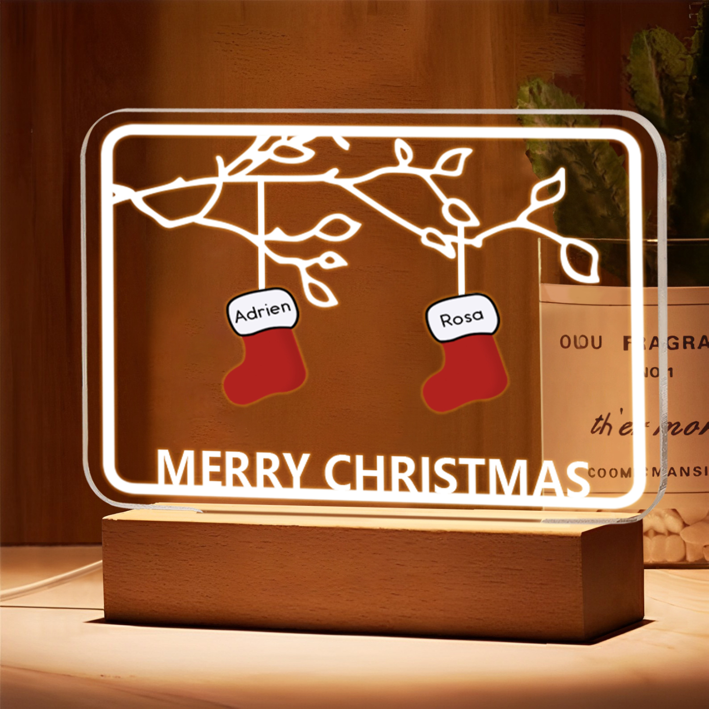 🎄Crafted with a blend of premium acrylic and a sturdy wooden base, this night light emanates warmth and charm. Add a touch of personalization and festive cheer to your home decor with this enchanting Christmas Tree Night Light.