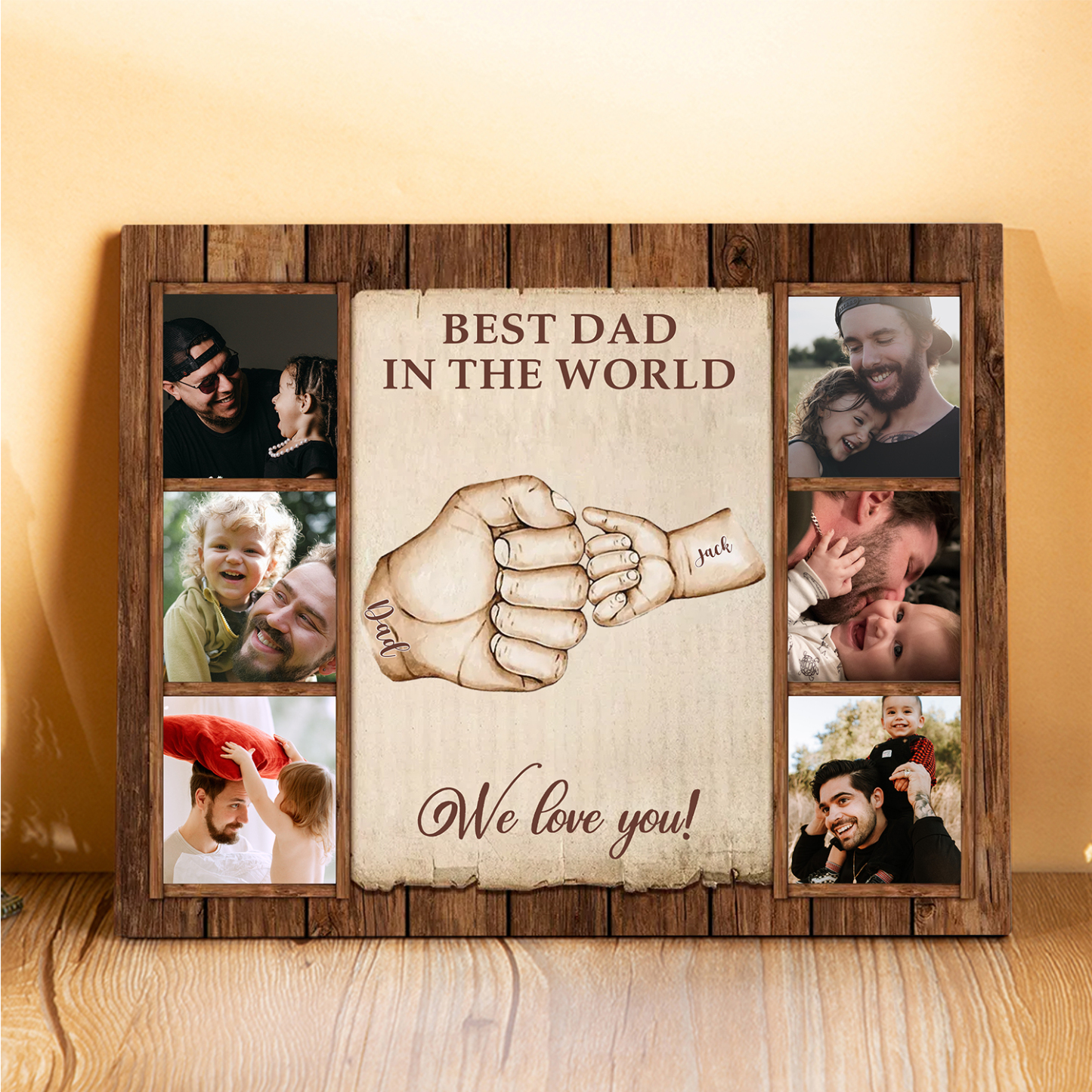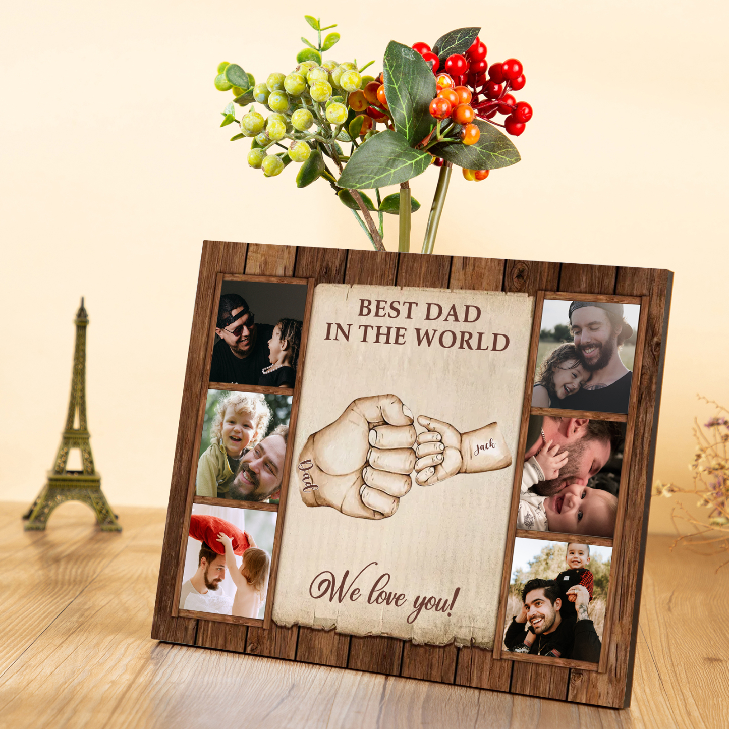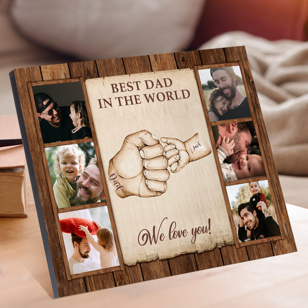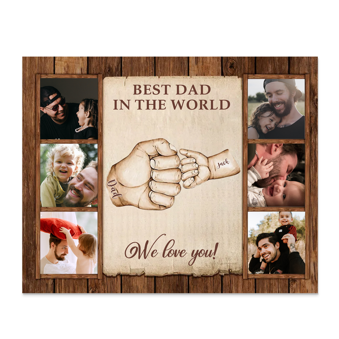 2 Names-Personalized Dad Family Fist Bump Frame Engaged 6 Photos Wooden Ornament Custom Texts Plaque Home Decoration for Father