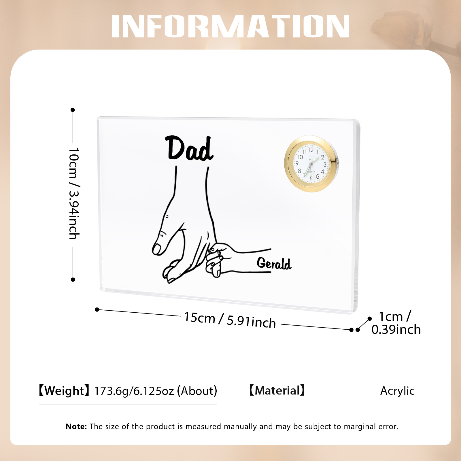 2 Names - Personalized Holding Hands Pattern Custom Name Acrylic Rectangular Clock Ornament Father's Day Gift