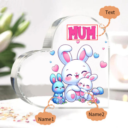 2 Names-Personalized Mum Rabbit Acrylic Heart Keepsake Custom Text Acrylic Plaque Ornaments Gifts Set With Gift Box for Nan/Mother for Easter