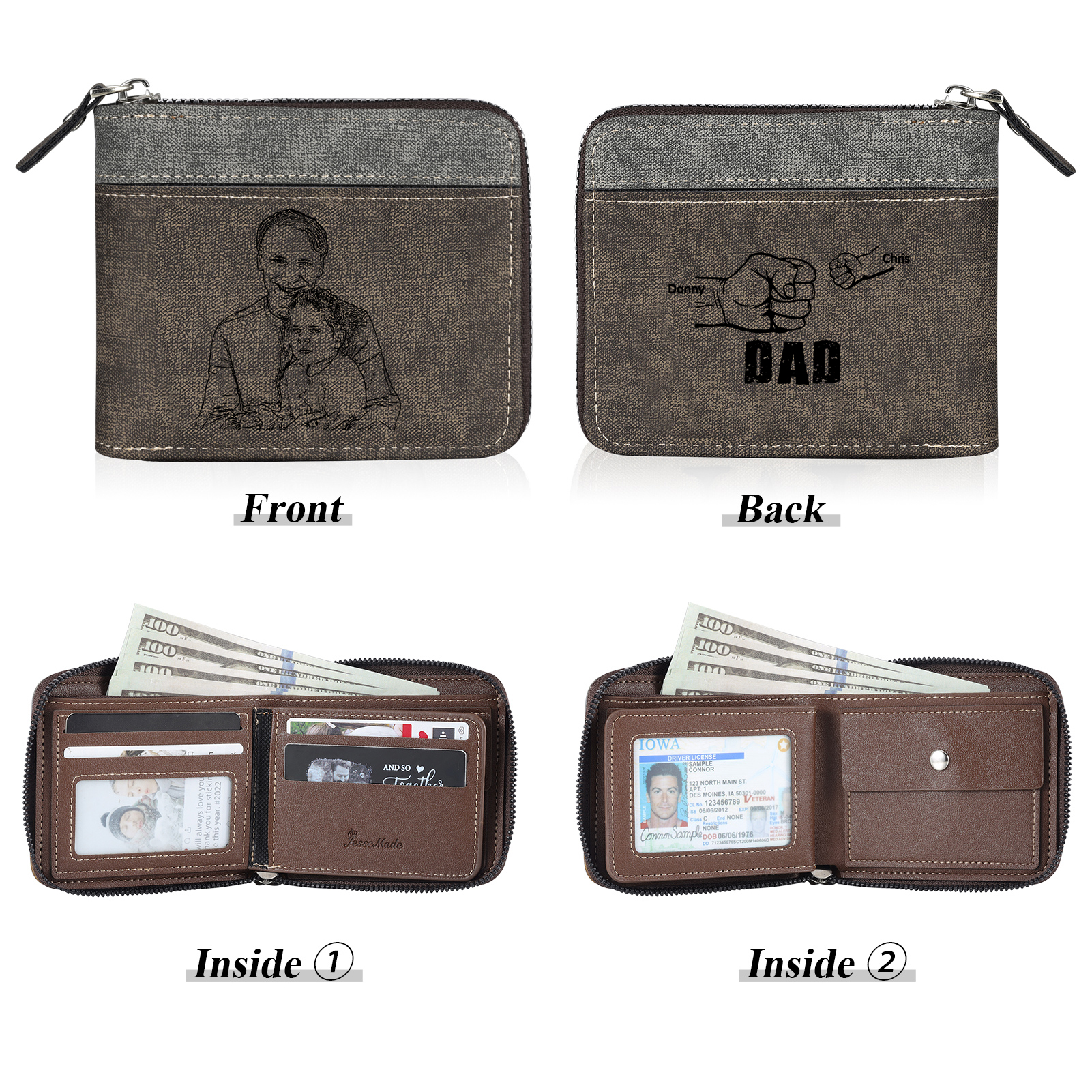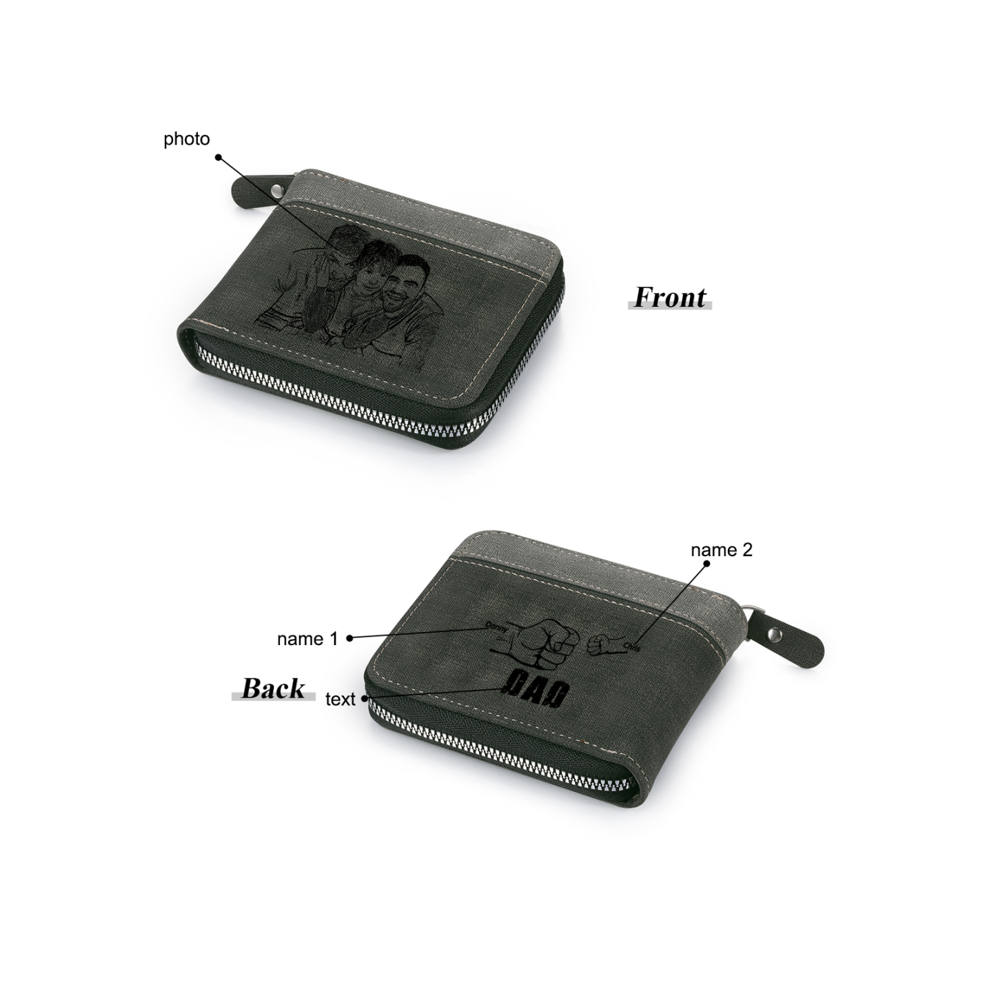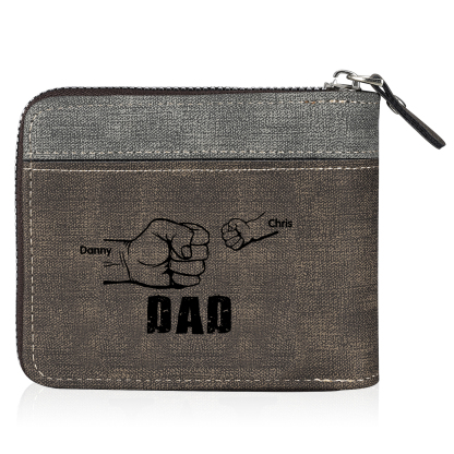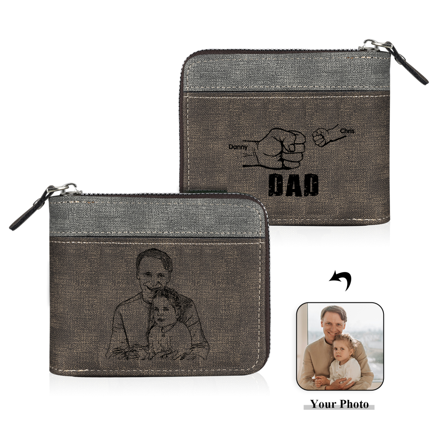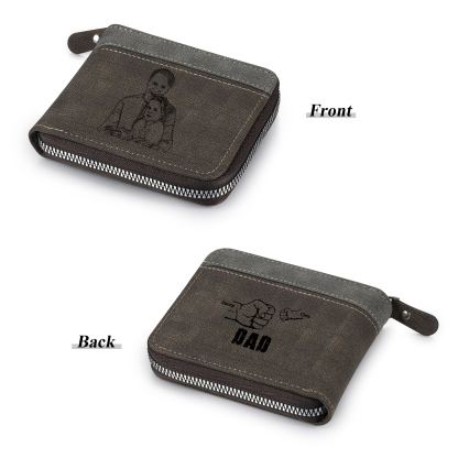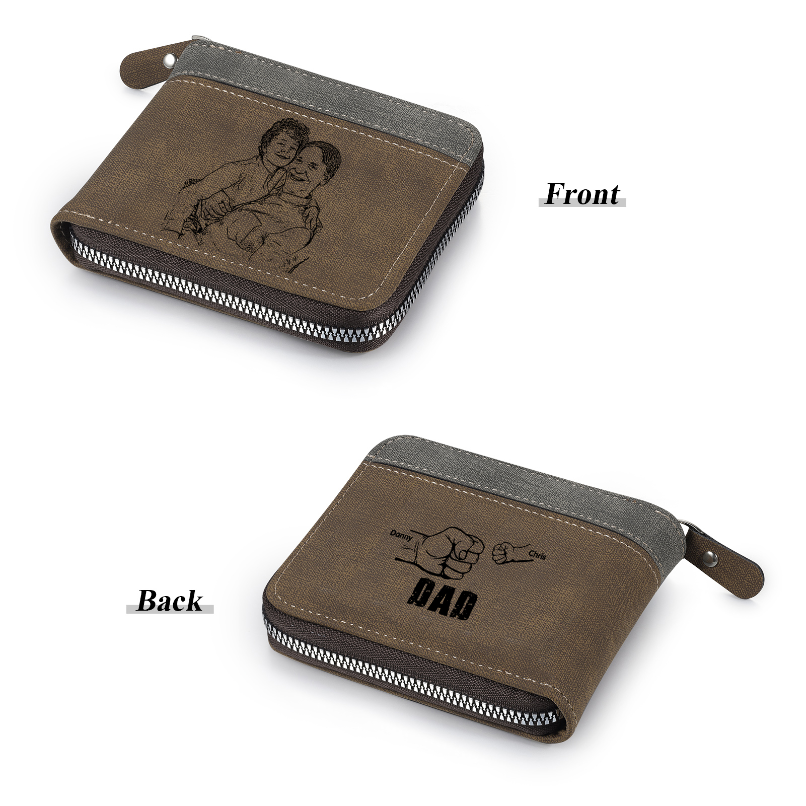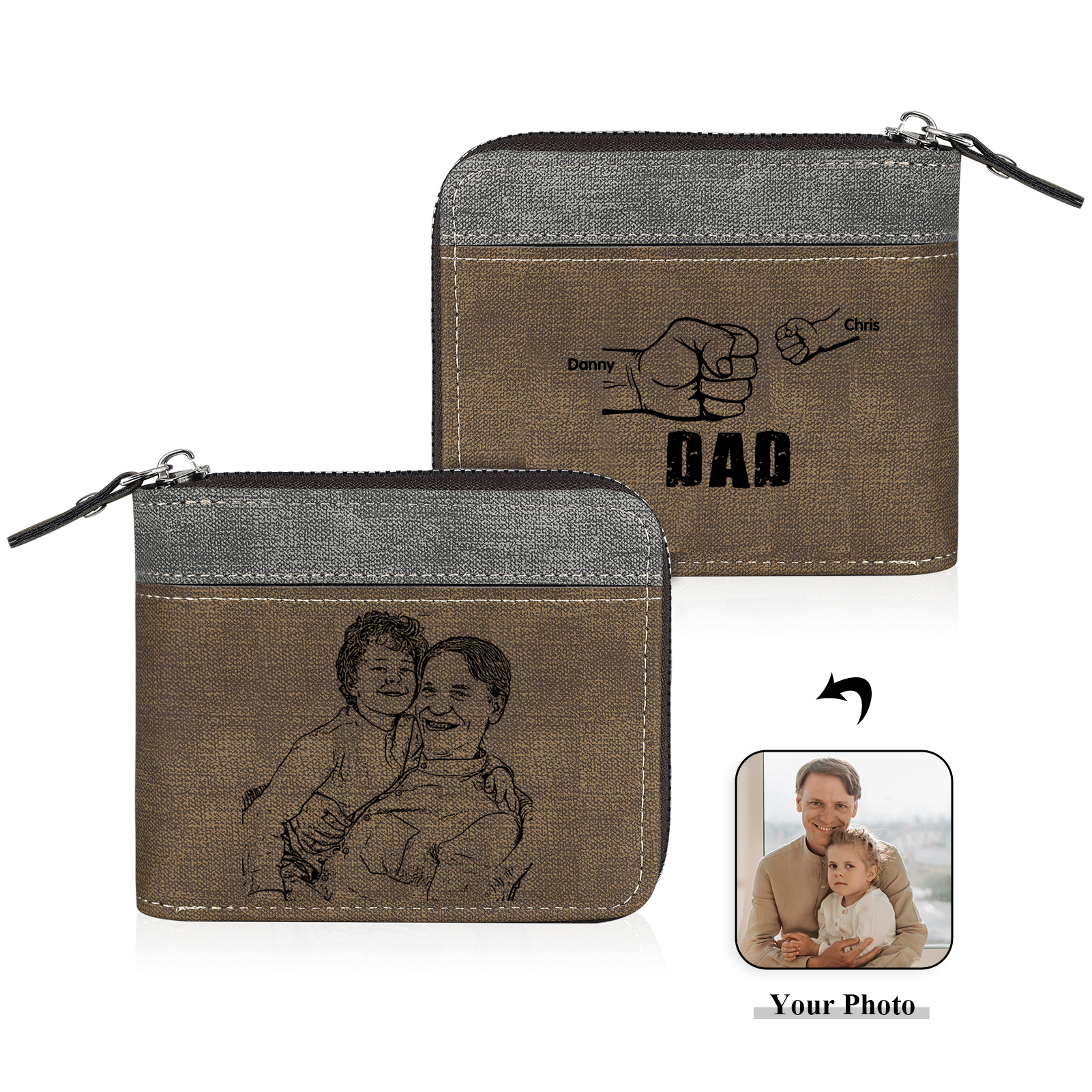 2 Names - Personalized Photo Custom Leather Men's Zipper Wallet as a Father's Day Gift for Dad