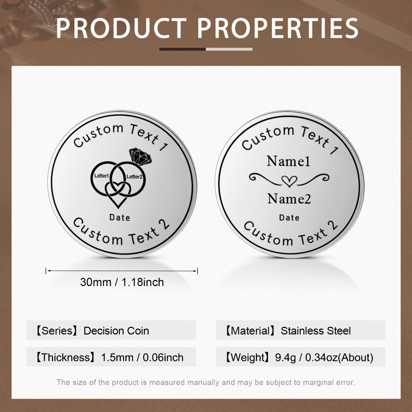Romance is forever, love is fixed. We bring you a new stainless steel coin customization service. Whether it's an important anniversary, a birthday, or just a token of love, this customizable coin will be a testament to your love story. Beautiful and durable, these coins are crafted from high-quality stainless steel to ensure long-lasting luster and texture. You can choose to have your name, date, or special text engraved on the coin to make it even more personal. Give love a deeper meaning and start customizing your own coins today, using them to forever engrave the true feelings between you and your loved one.