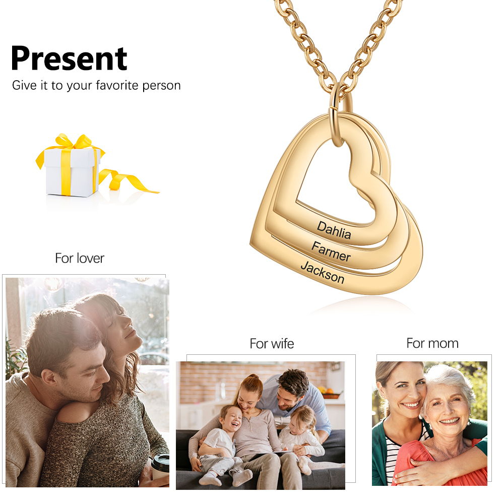 - Personalization : 3 Names, Dates, ID, Phrases Engraved (Less than 10 letters) on the Heart pendants.