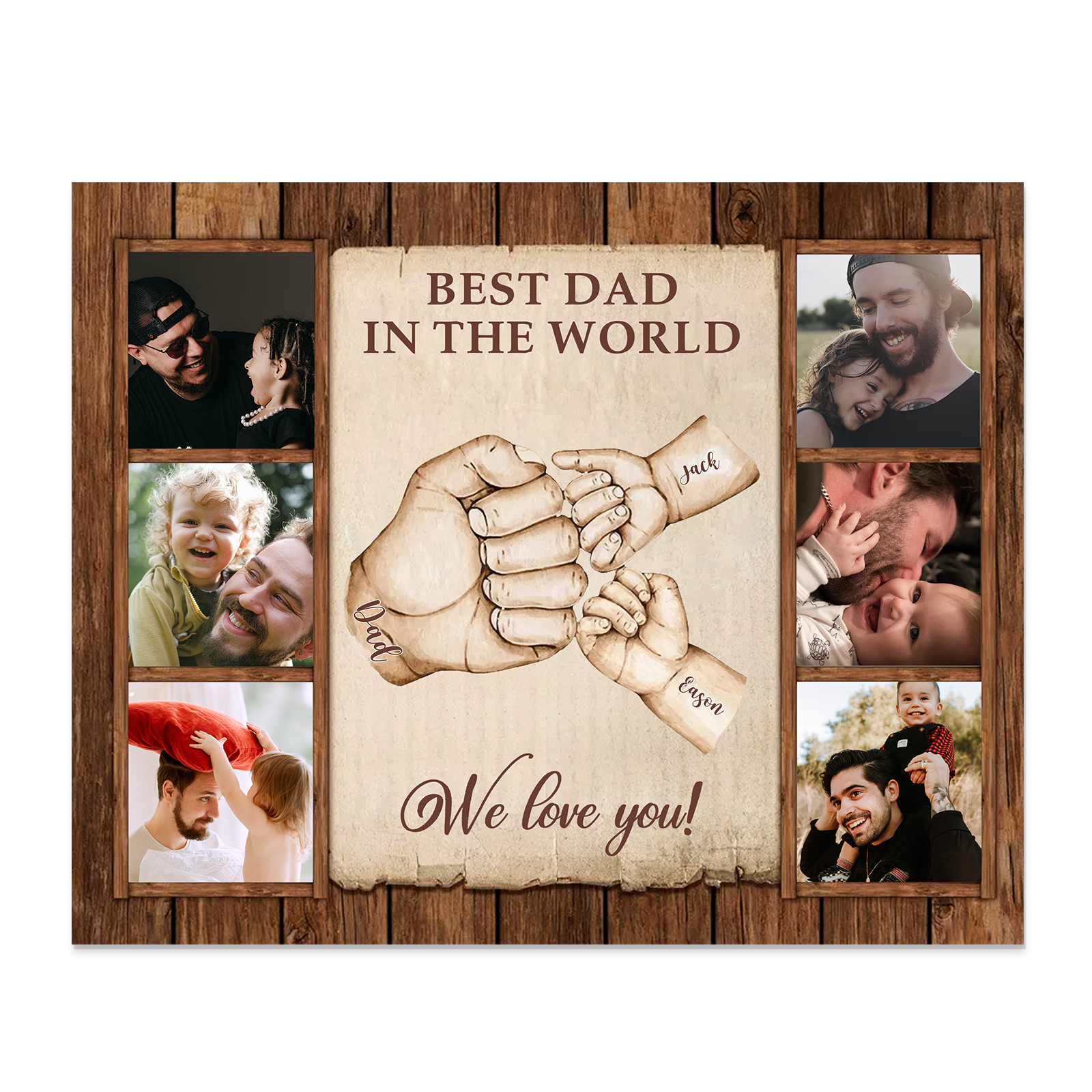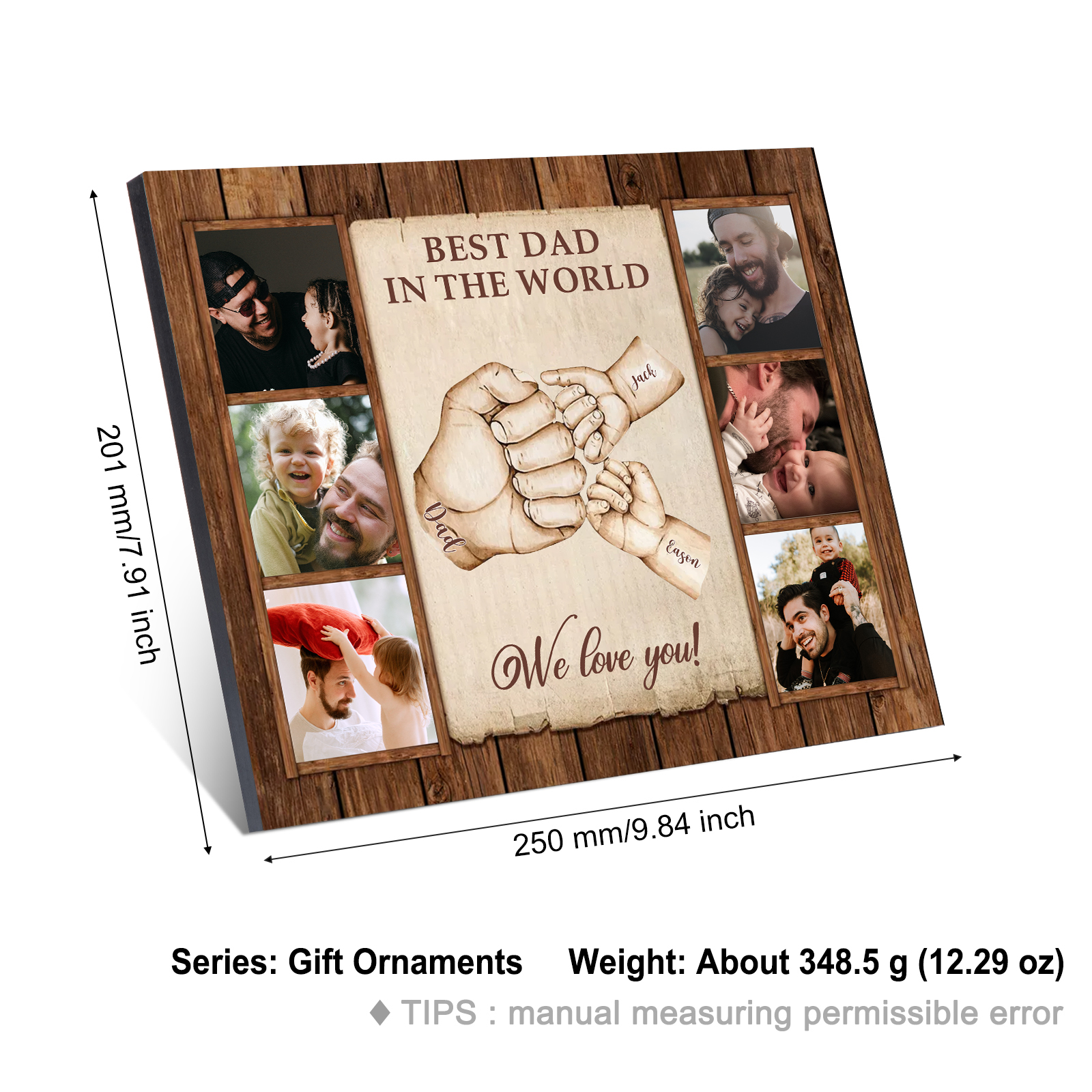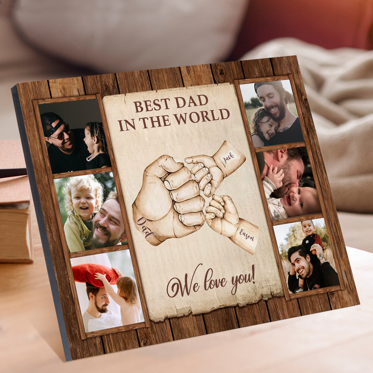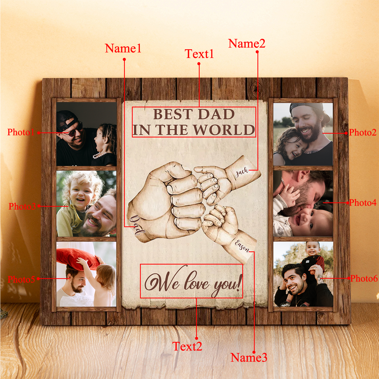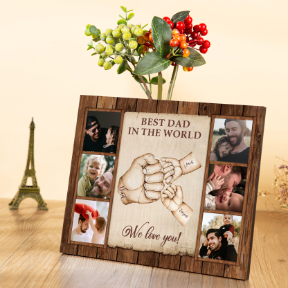 3 Names-Personalized Dad Family Fist Bump Frame Engaged 6 Photos Wooden Ornament Custom Texts Plaque Home Decoration for Father