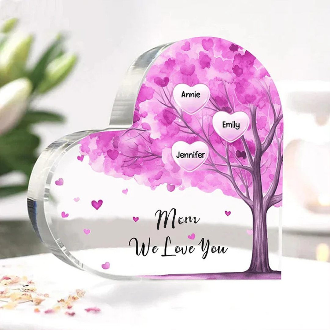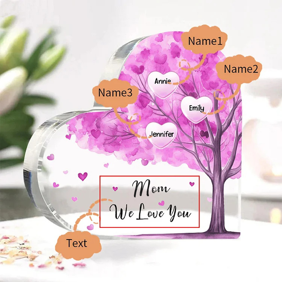 3 Names-Personalized Mom Acrylic Heart Keepsake Custom Text Pink Tree Ornaments Gifts Set With Gift Box for Grandma/Mother