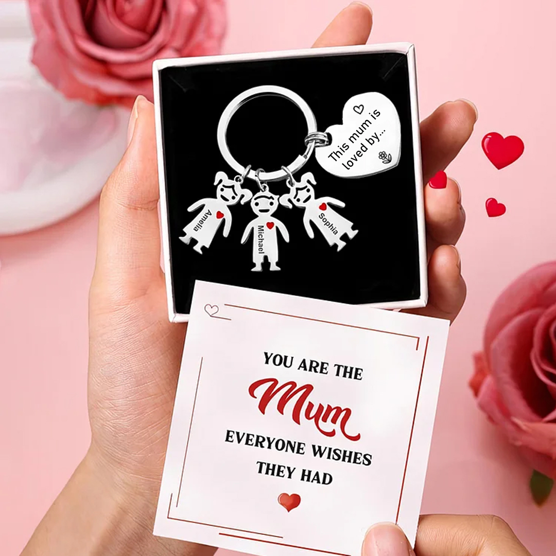 3 Names-Personalized Mum Keychain Set Kid Charm Keychain Heart Shaped Tag Gift Set This Mum is loved by Engrave Special Gift For Mother