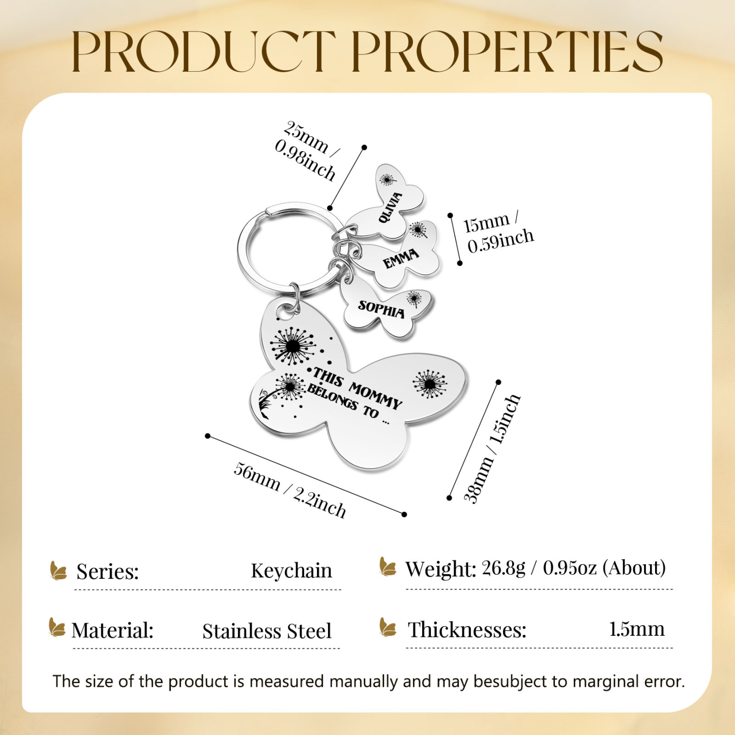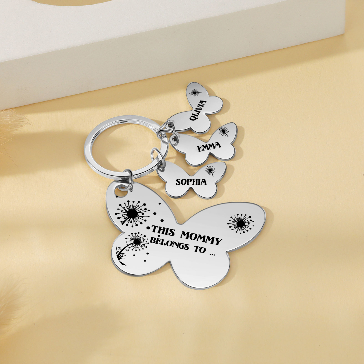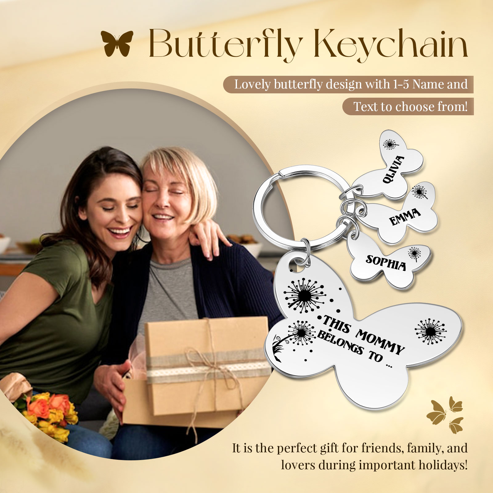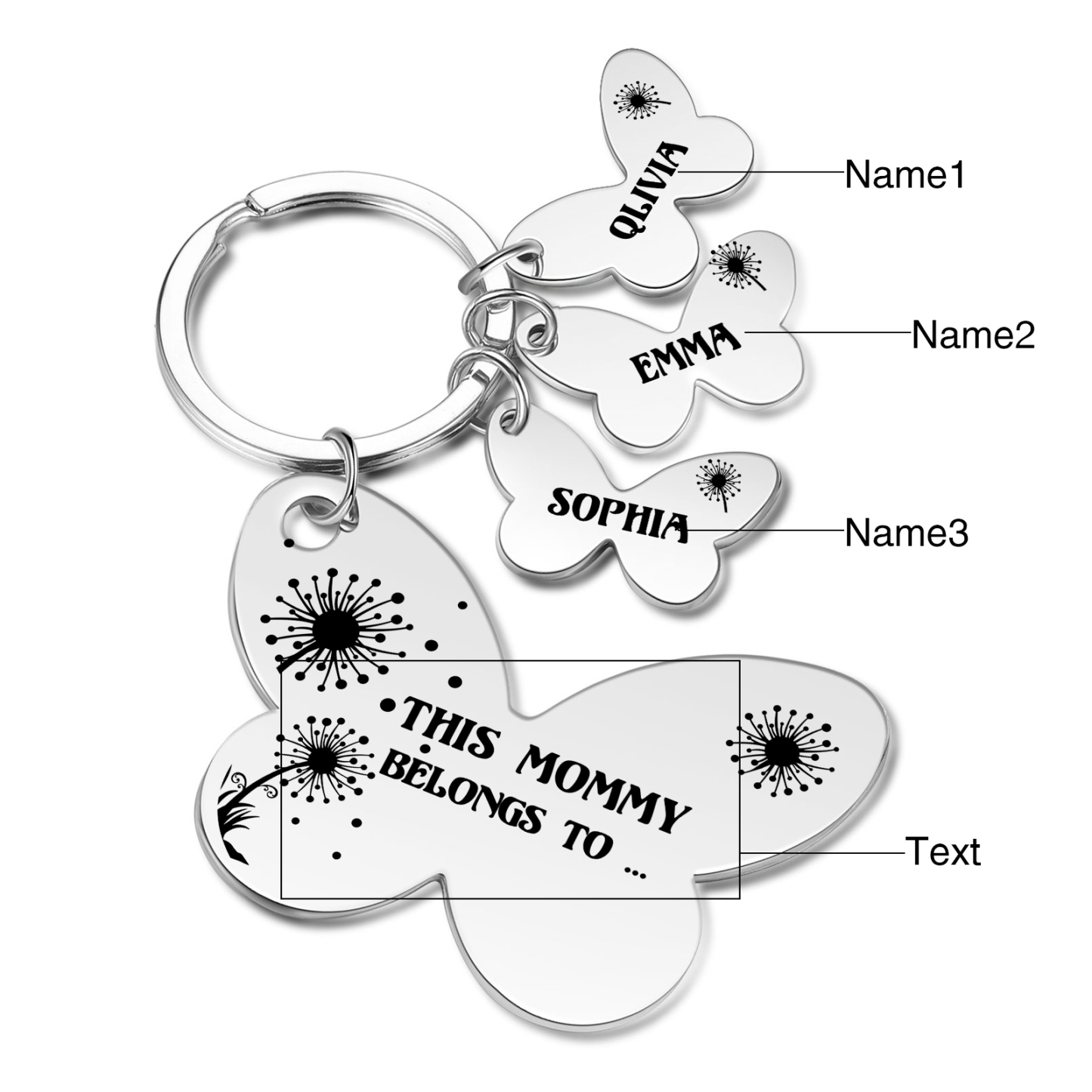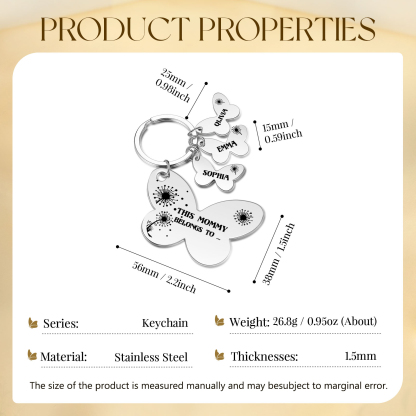 3 Names - Personalized Text Stainless Steel Butterfly Shape Keychain For Her