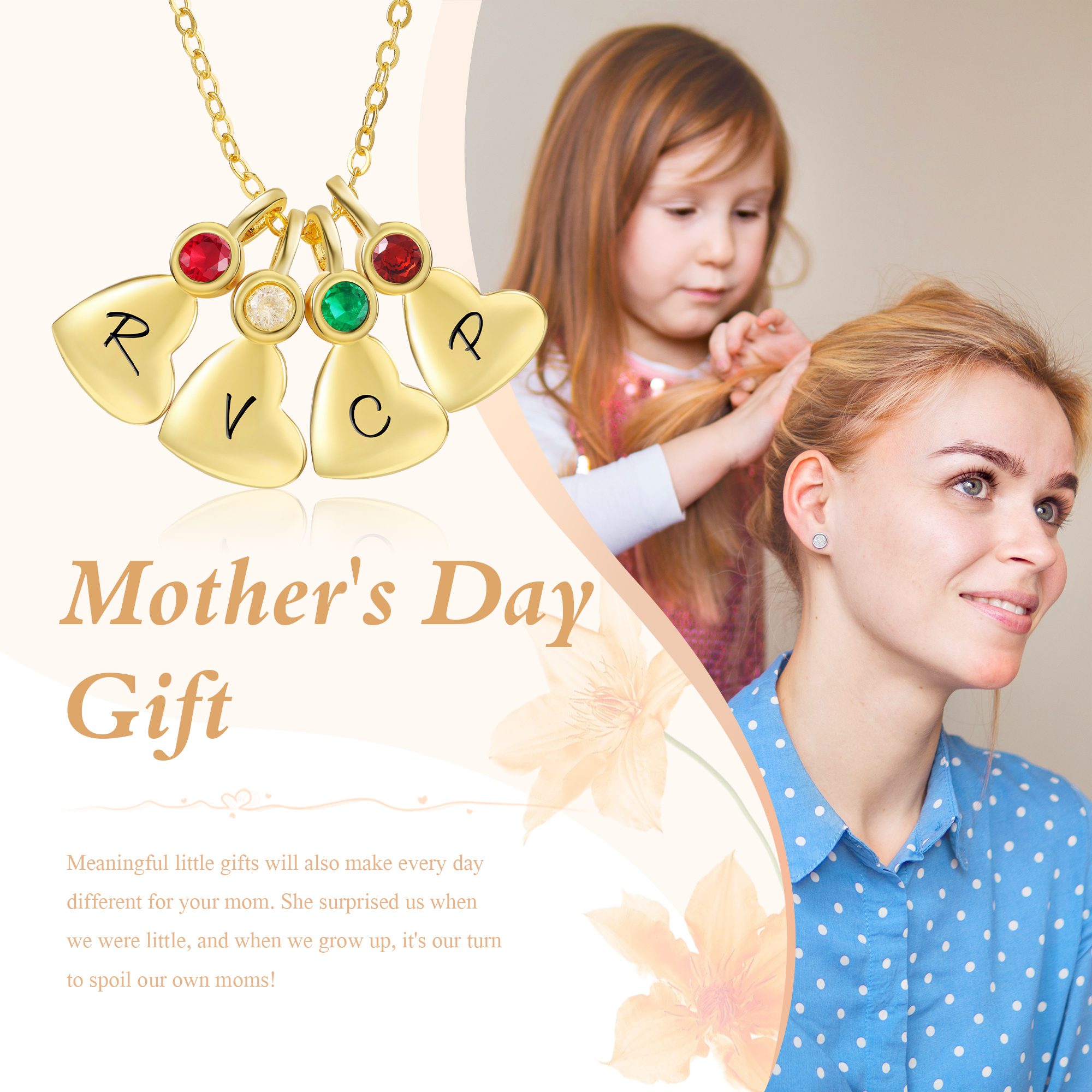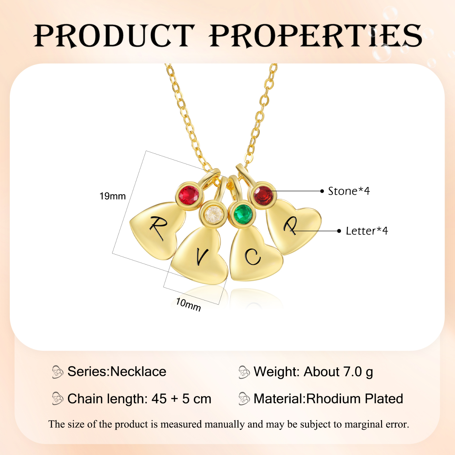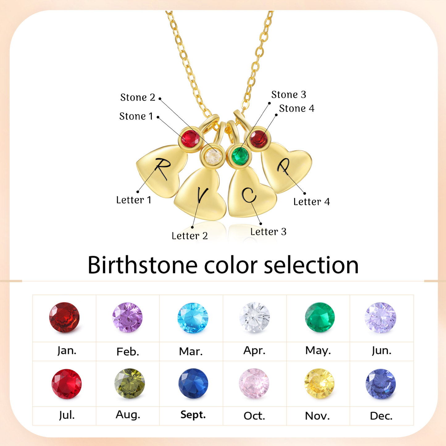 4 Birthstones Personalized Necklace Engraved 4 Heart Letters Special Gift For Women