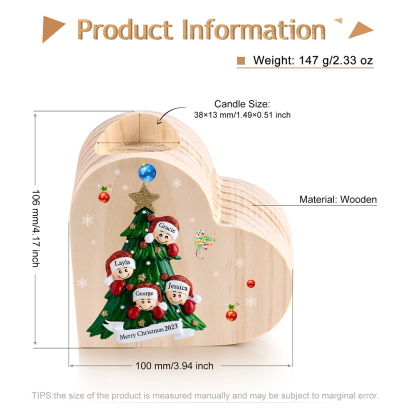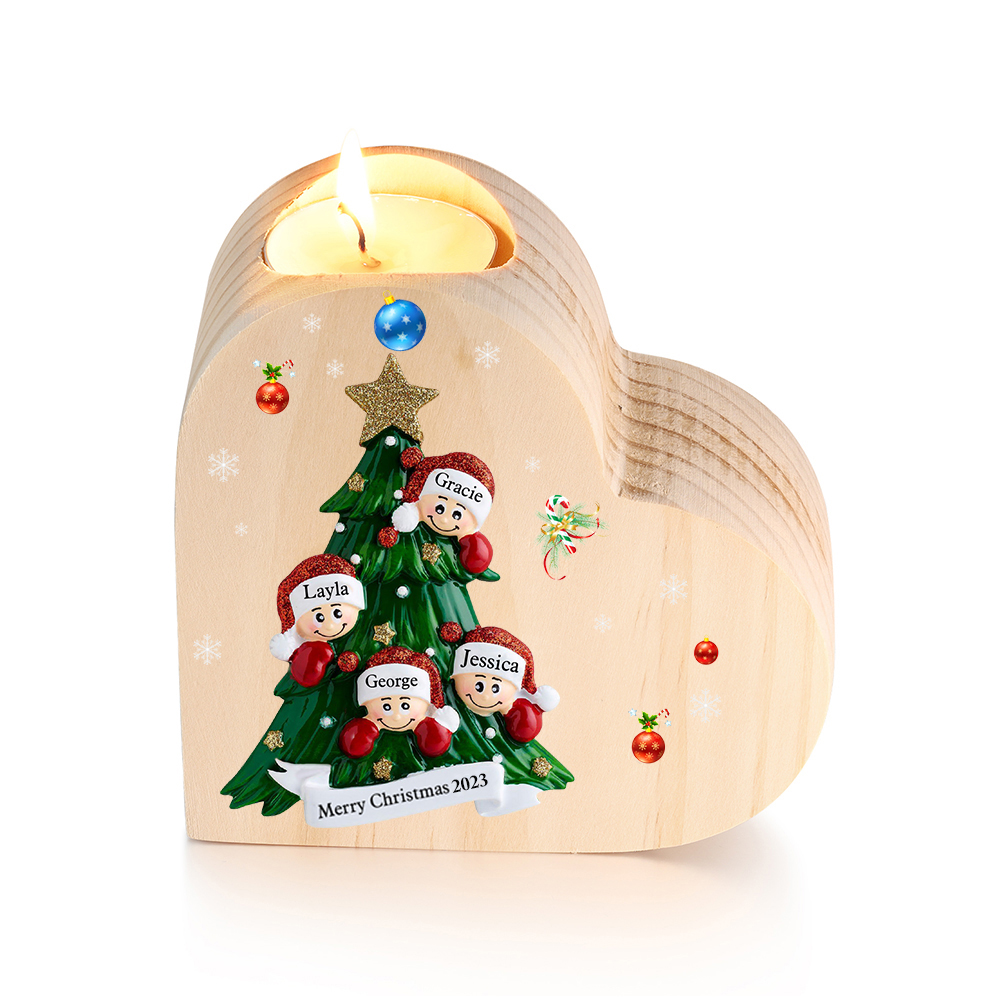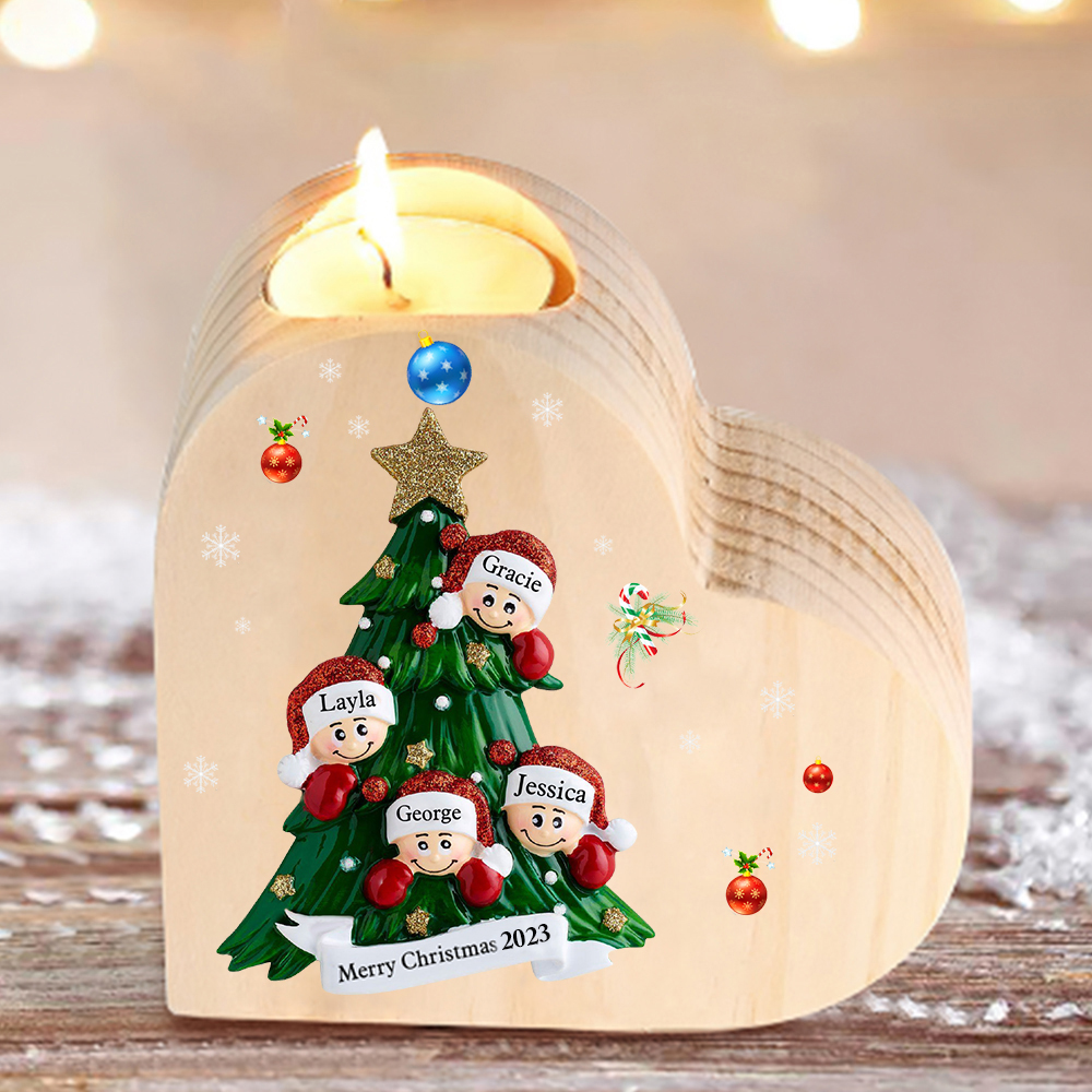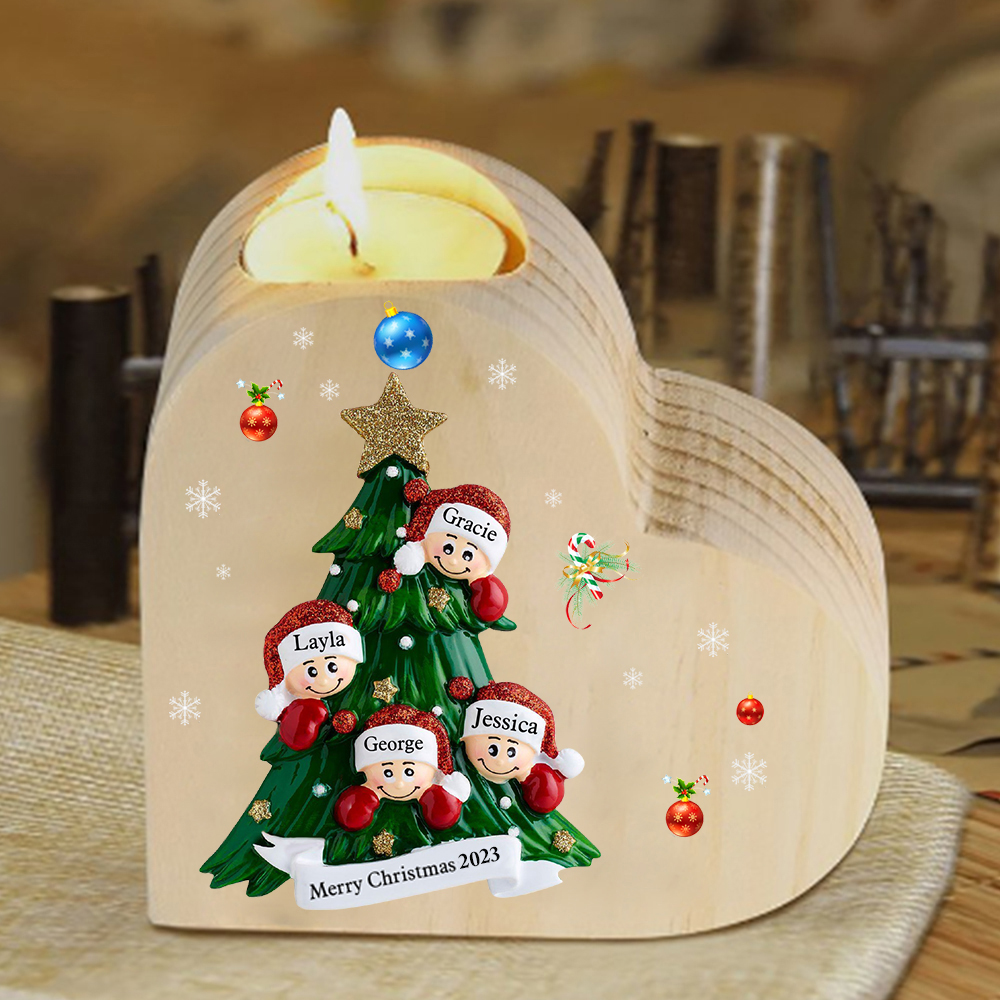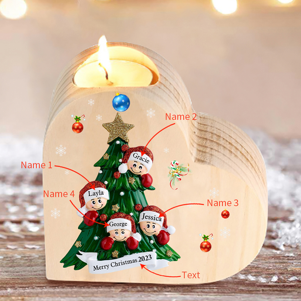 4 Names-Custom Christmas Tree Wooden Candlestick-Personalized Names Heart Candle Holder Christmas Gift for Family