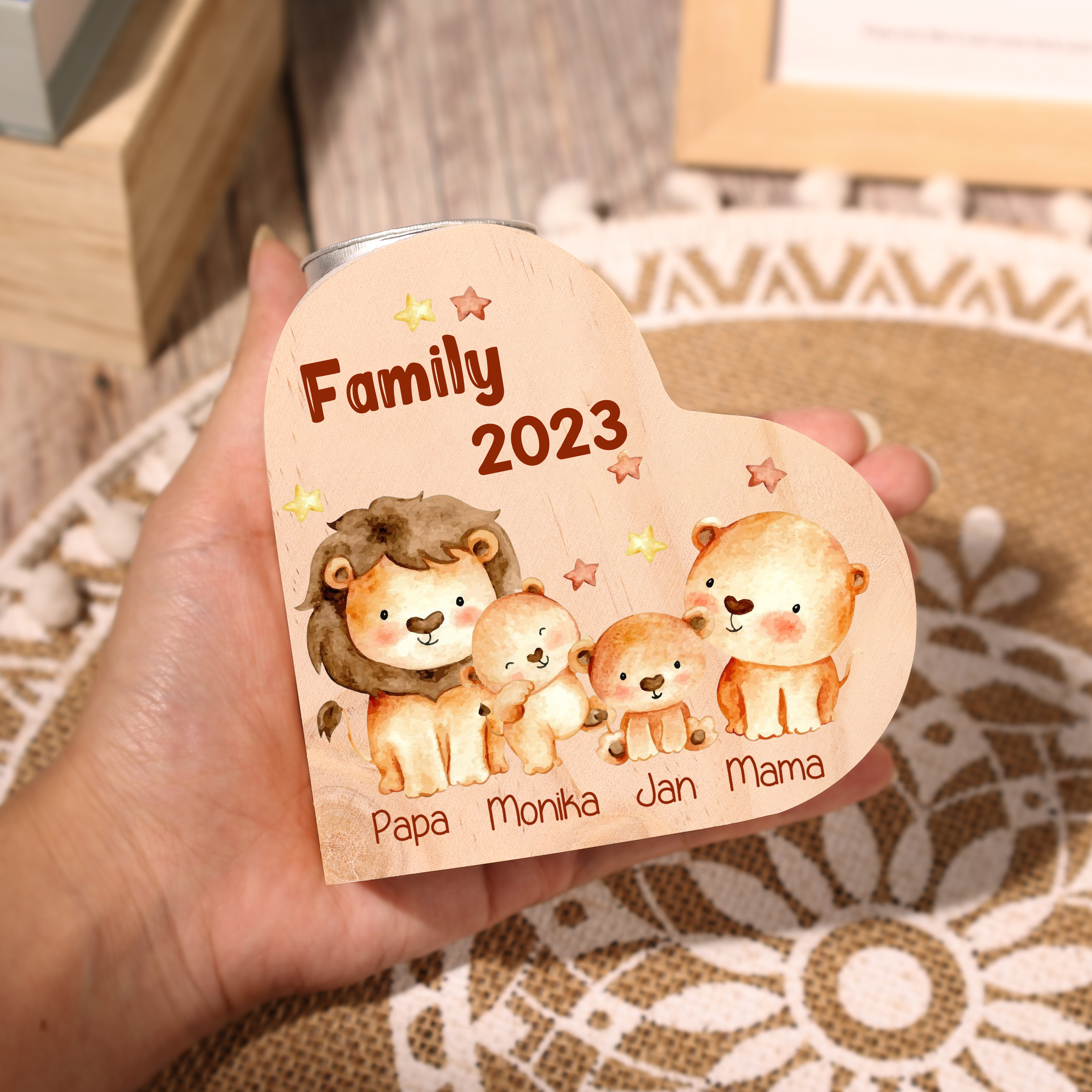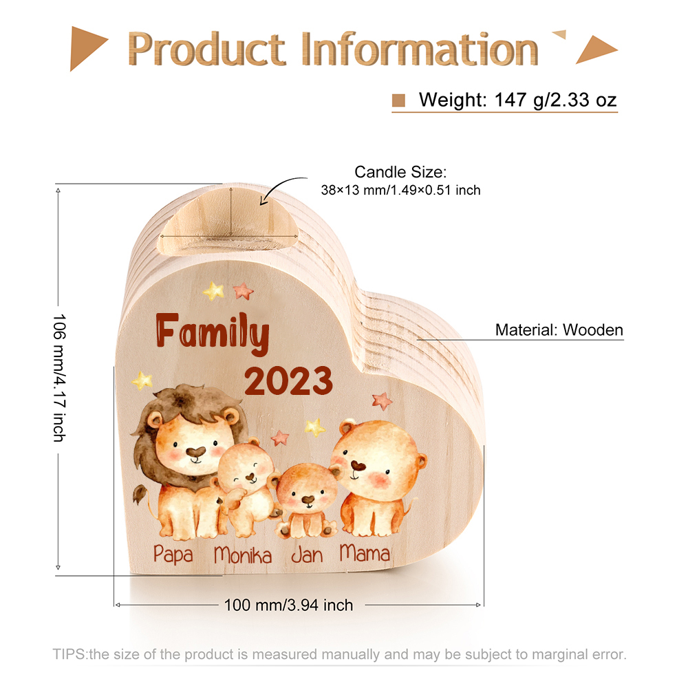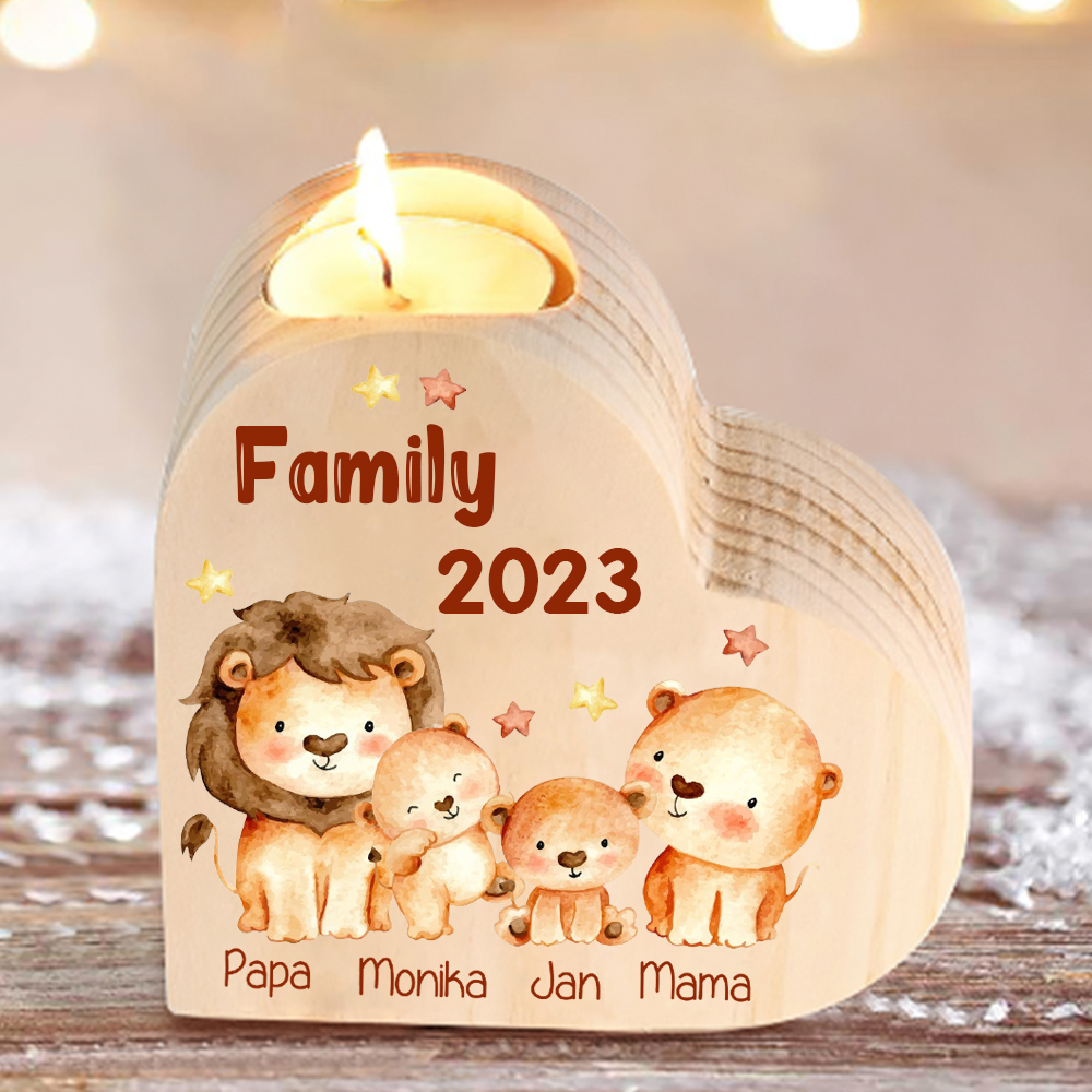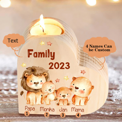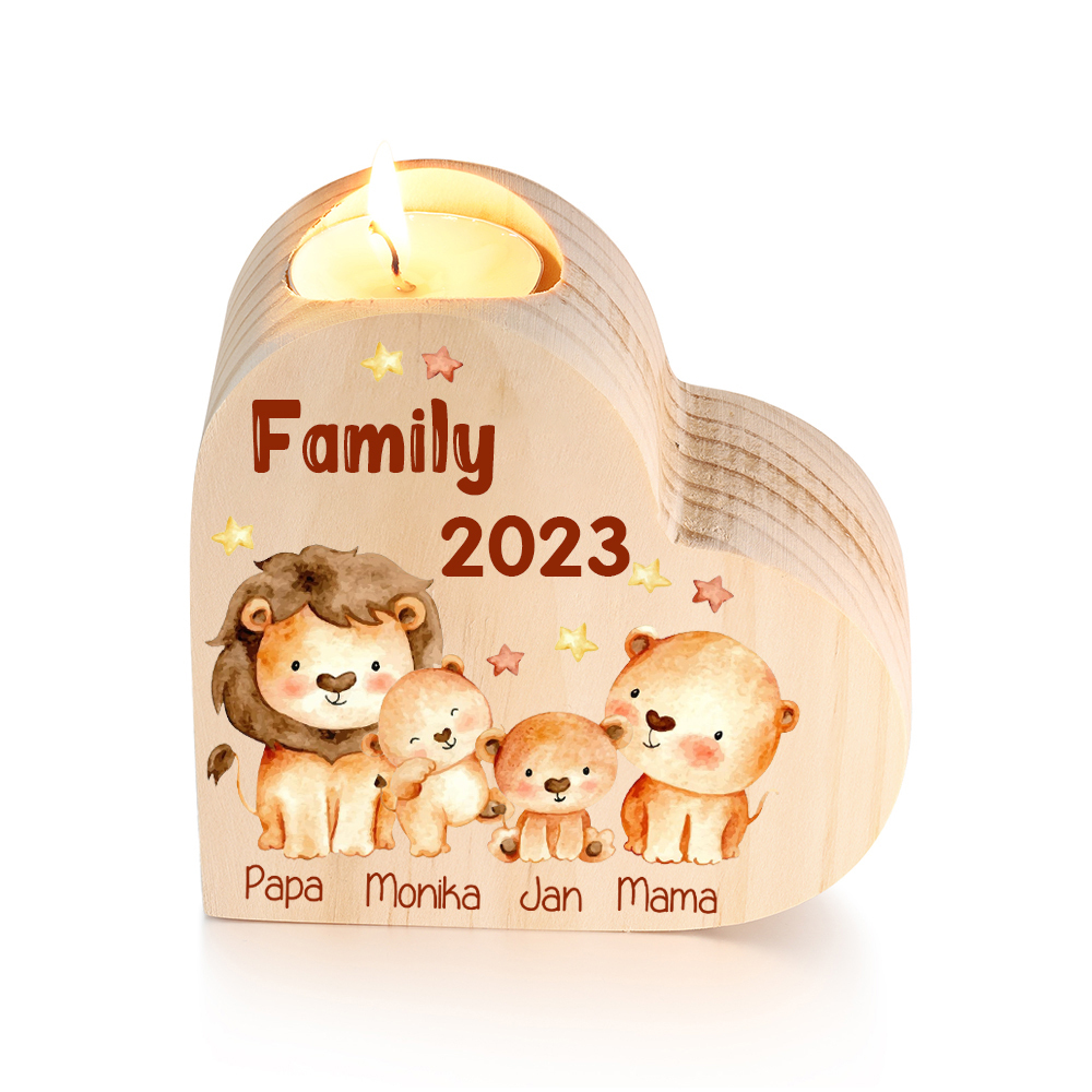 4 Names-Custom Family Lions Wooden Candlestick-Personalized Names Heart Candle Holder Christmas Gift for Family
