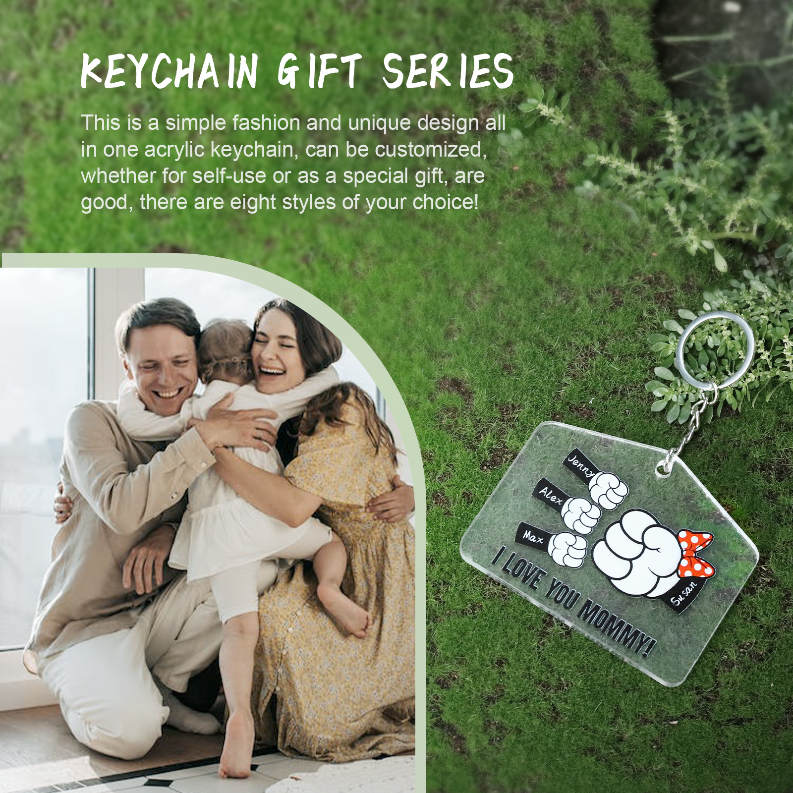 Our Keychain is a special gift for your family! It can be customized with 2-8 names and text.