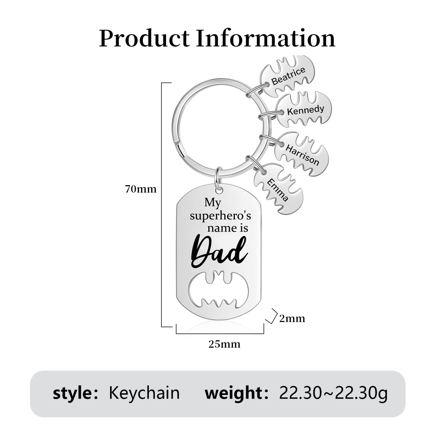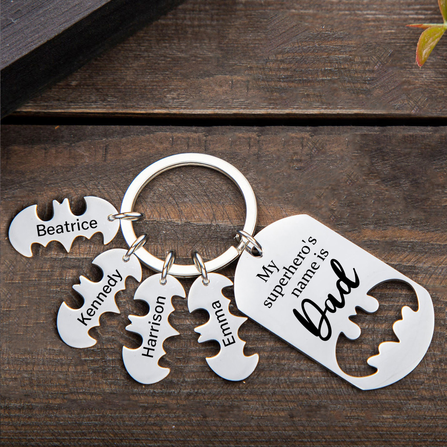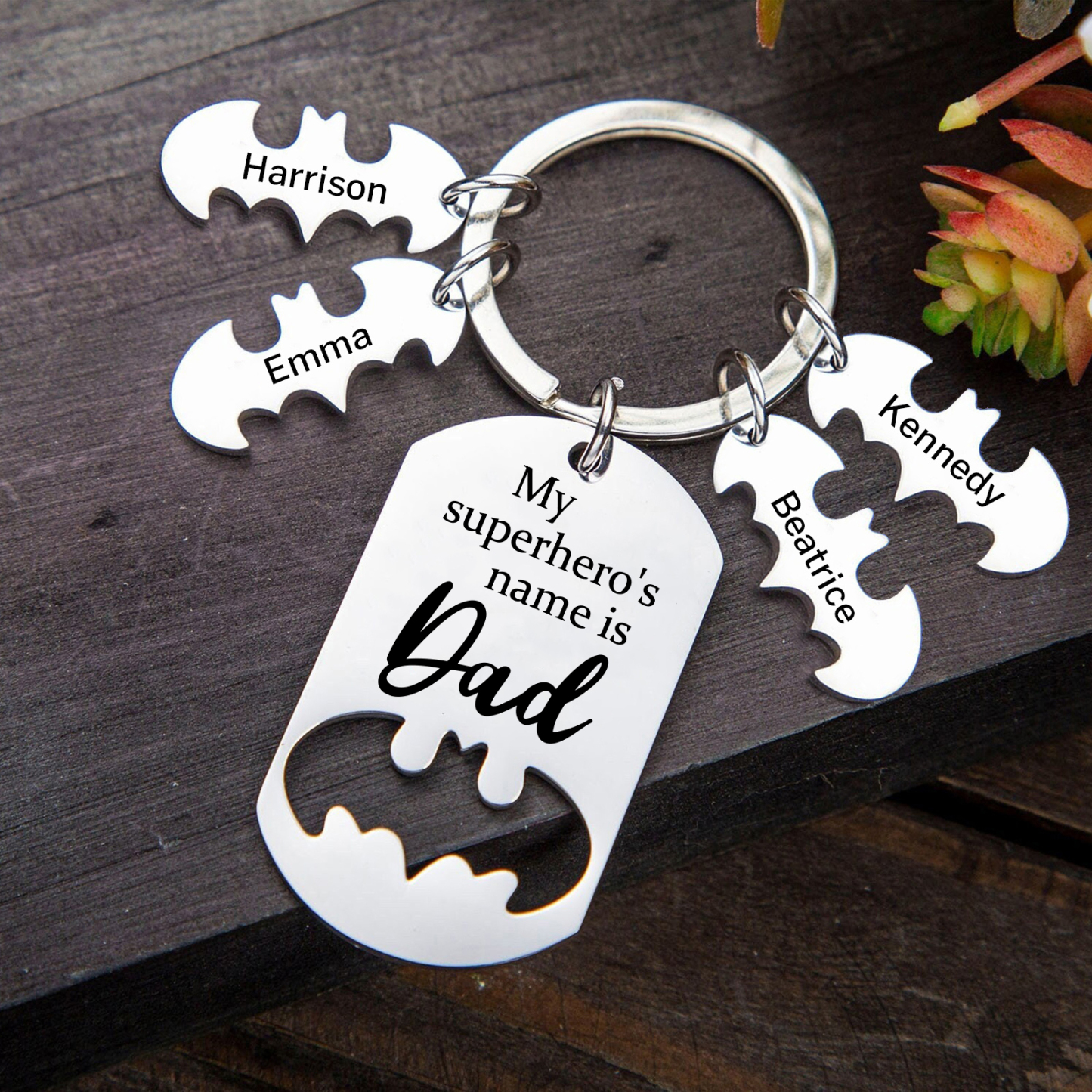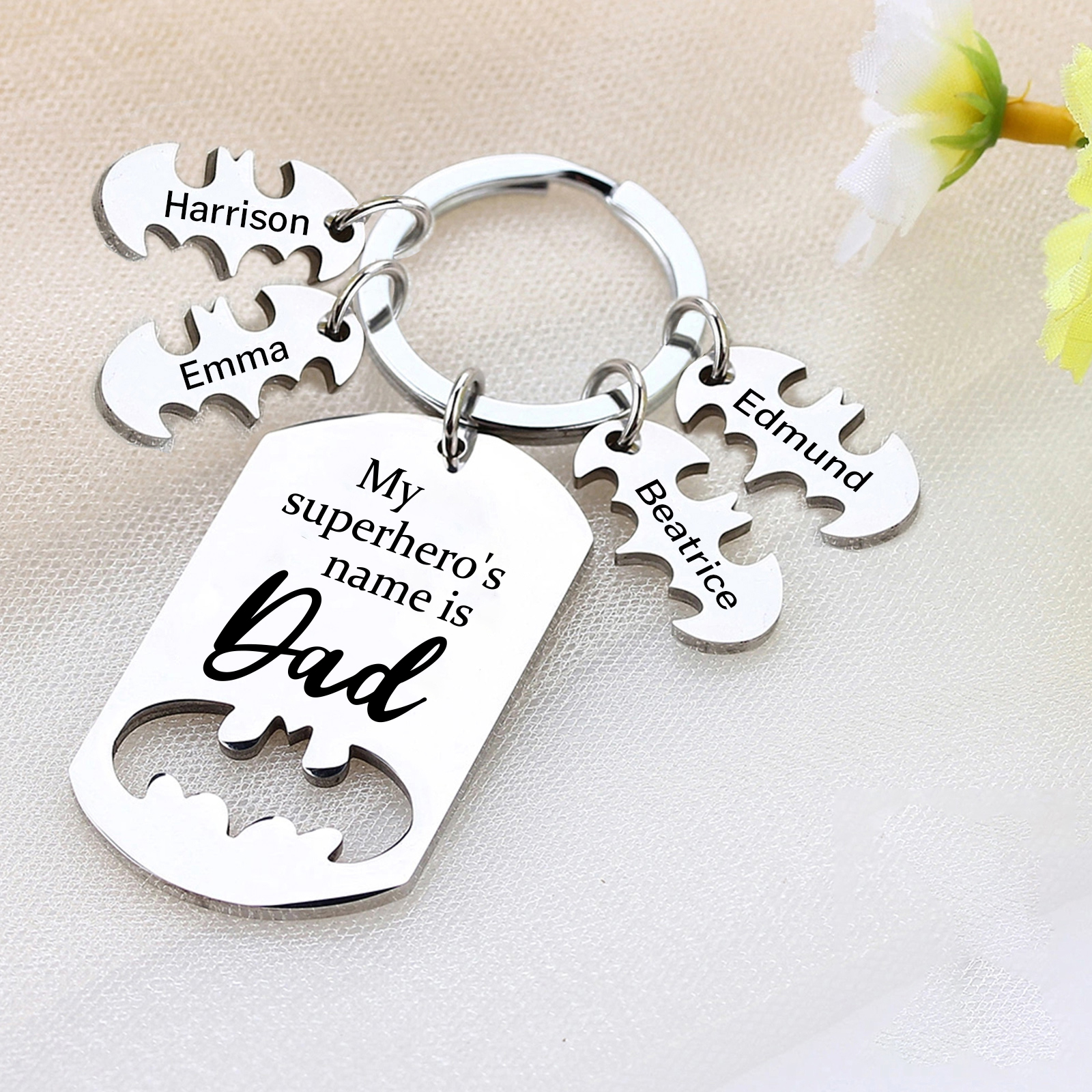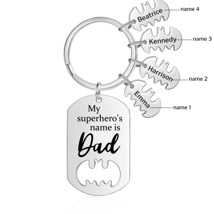 4 Names -Personalized Bat Keychain Father Keychain Gifts for Batman Dad - My Superhero's Name Is Dad