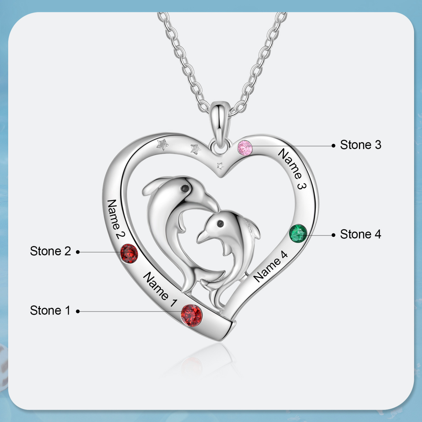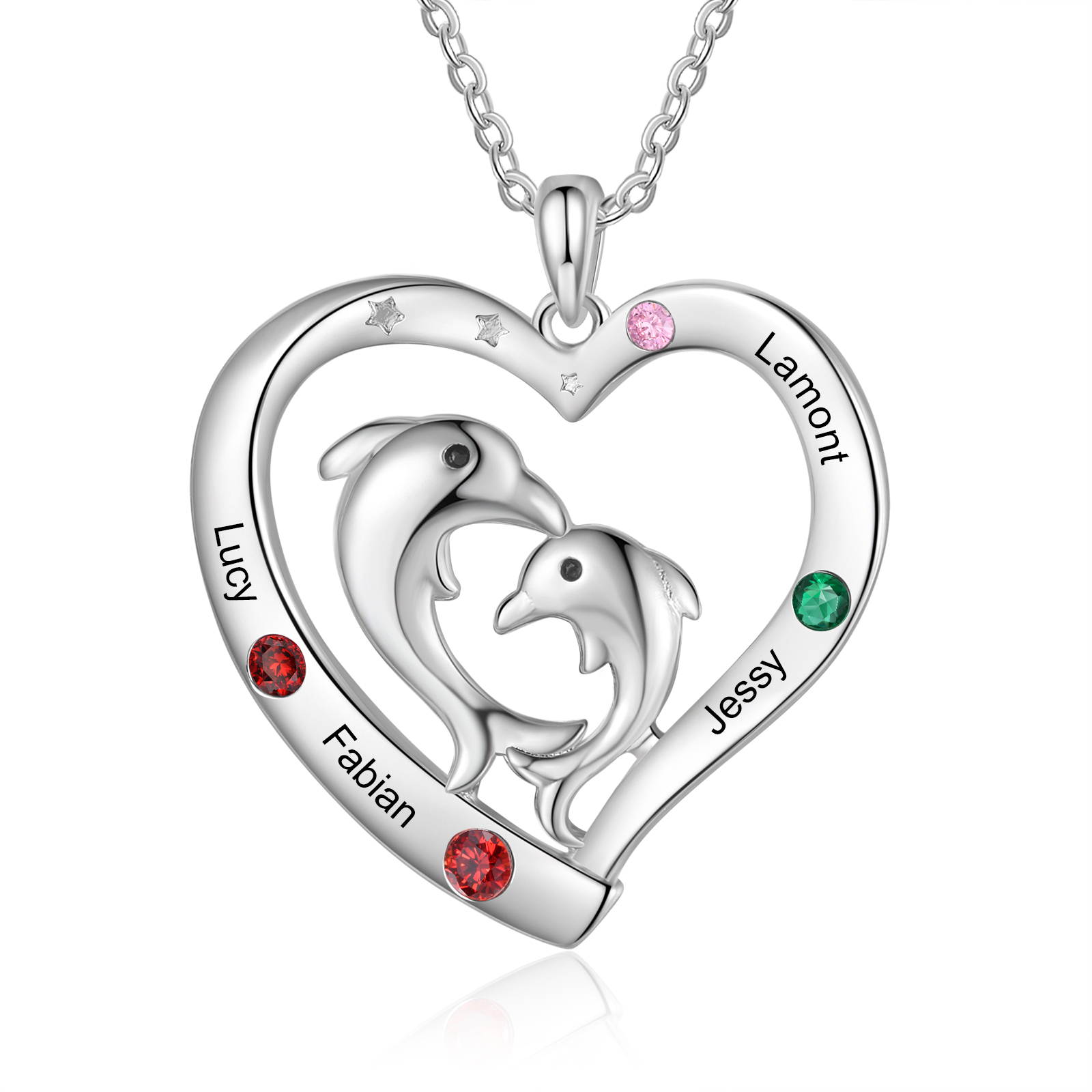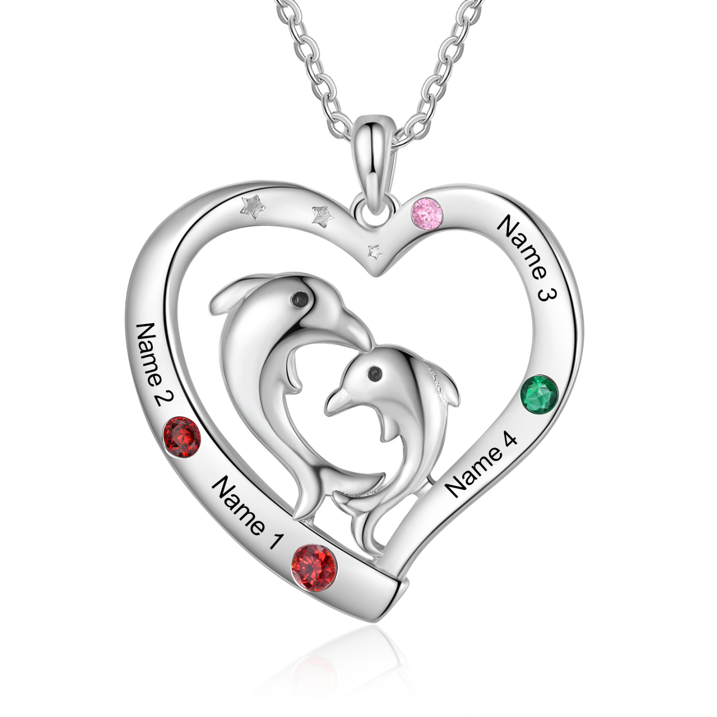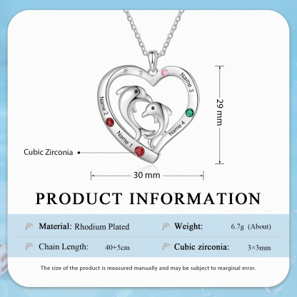 4 Names - Personalized Beautiful Dolphin Heart Necklace with Customized Name and Birthstone Gift for Her