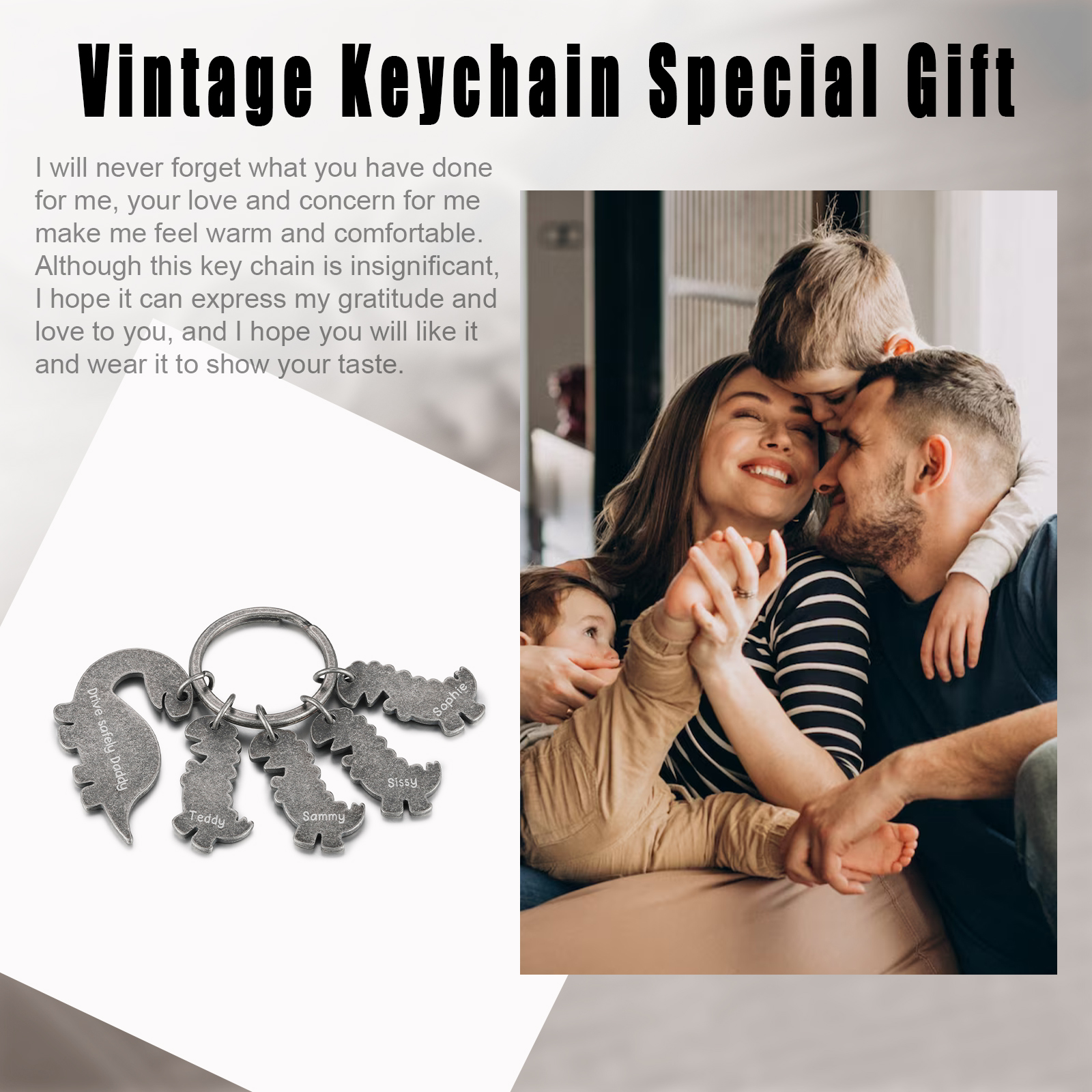 Our Stainless Steel is protected with a tarnish resistance to help it last for years without tarnishing. High-polished finish, hypoallergenic, won't rust, durable, and comfortable to wear. You can customize 2-5 names and text, and customize a keychain exclusively for grandpa and father