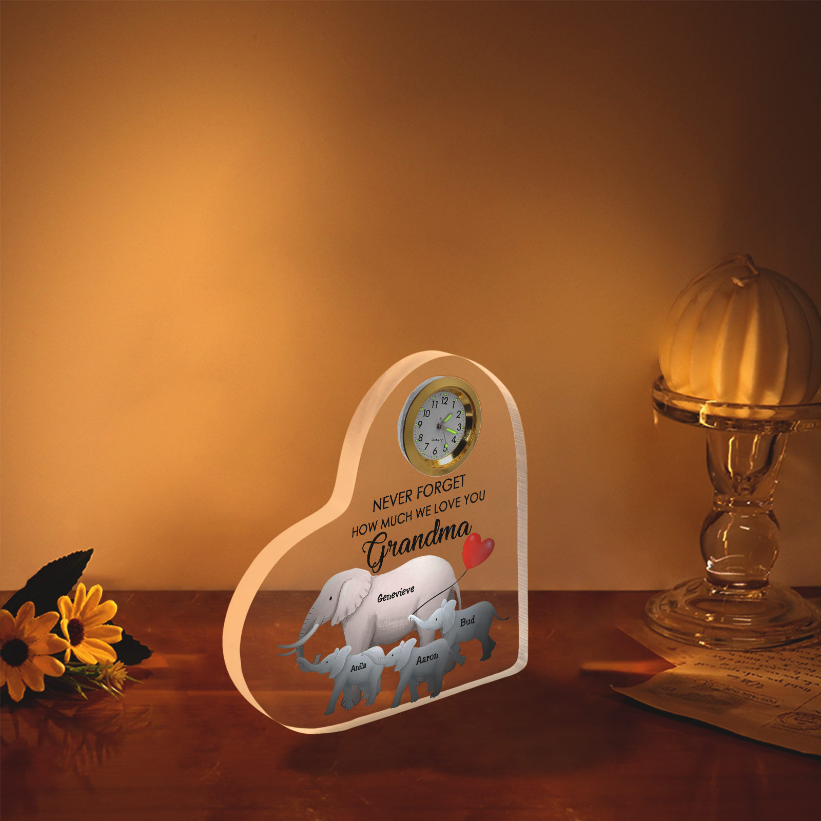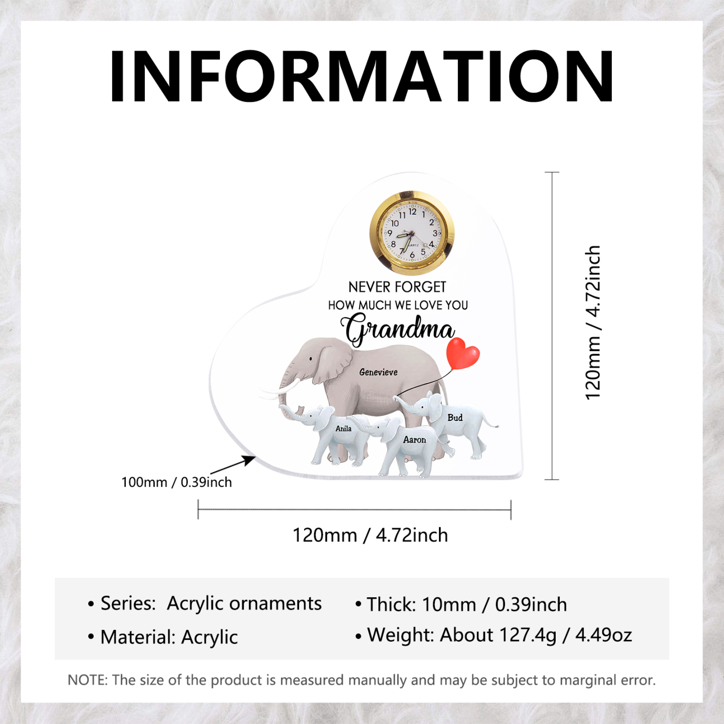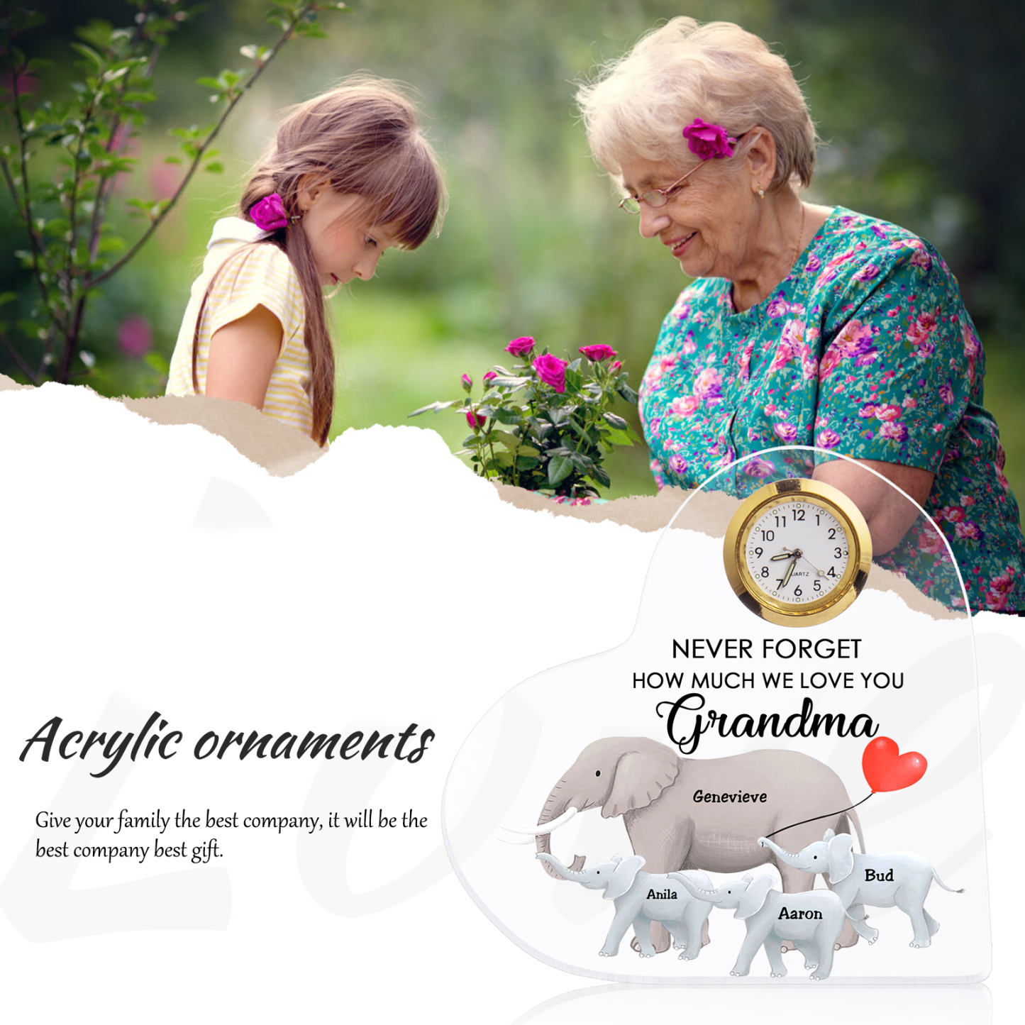 4 Names-Personalized Grandma Name Acrylic Clock Gifts-Custom Acrylic Elephant Heart Keepsake Desktop Ornament