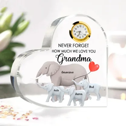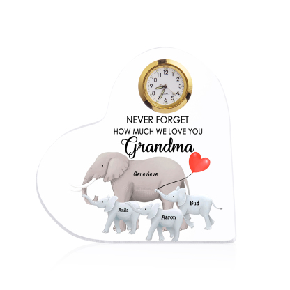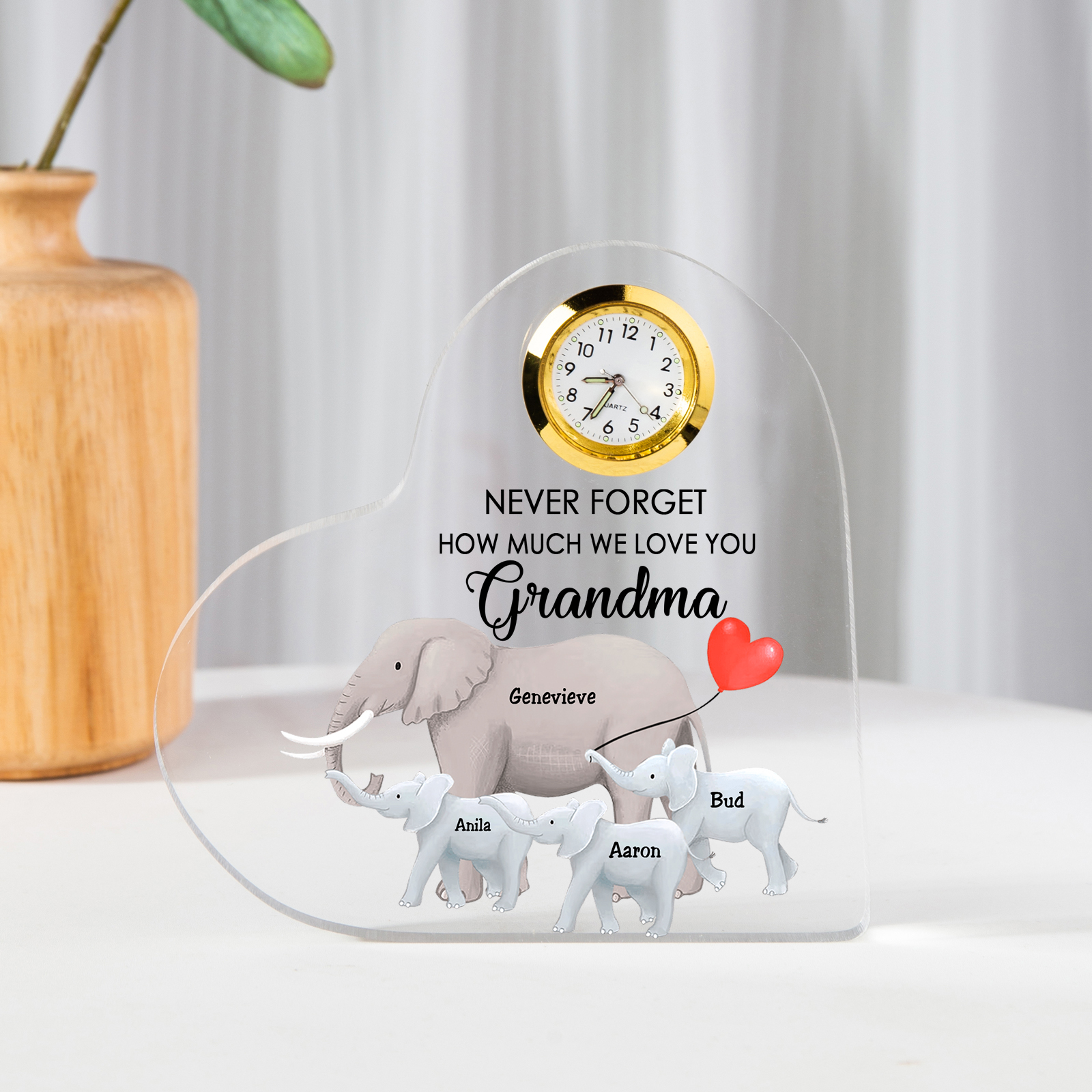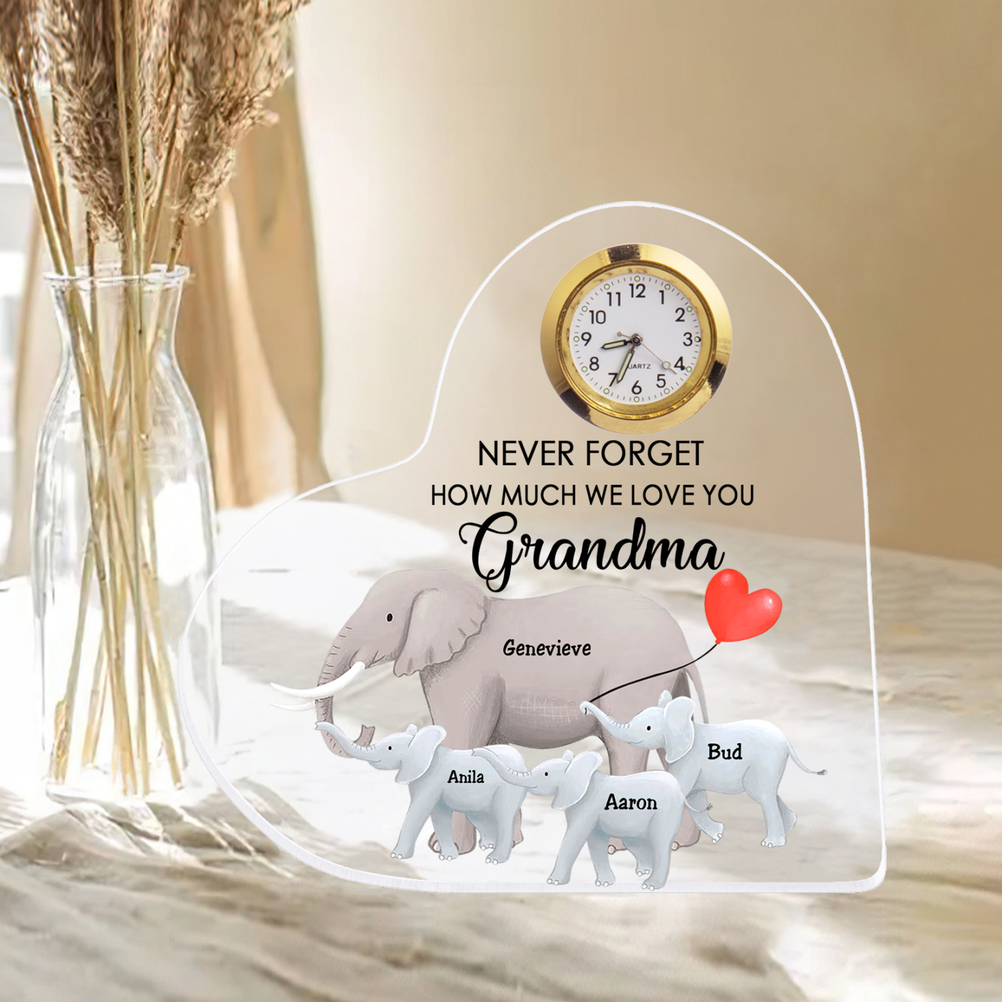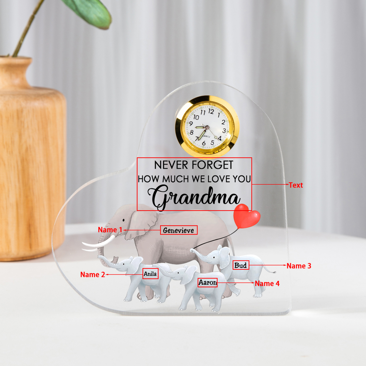 4 Names-Personalized Grandma Name Acrylic Clock Gifts-Custom Acrylic Elephant Heart Keepsake Desktop Ornament