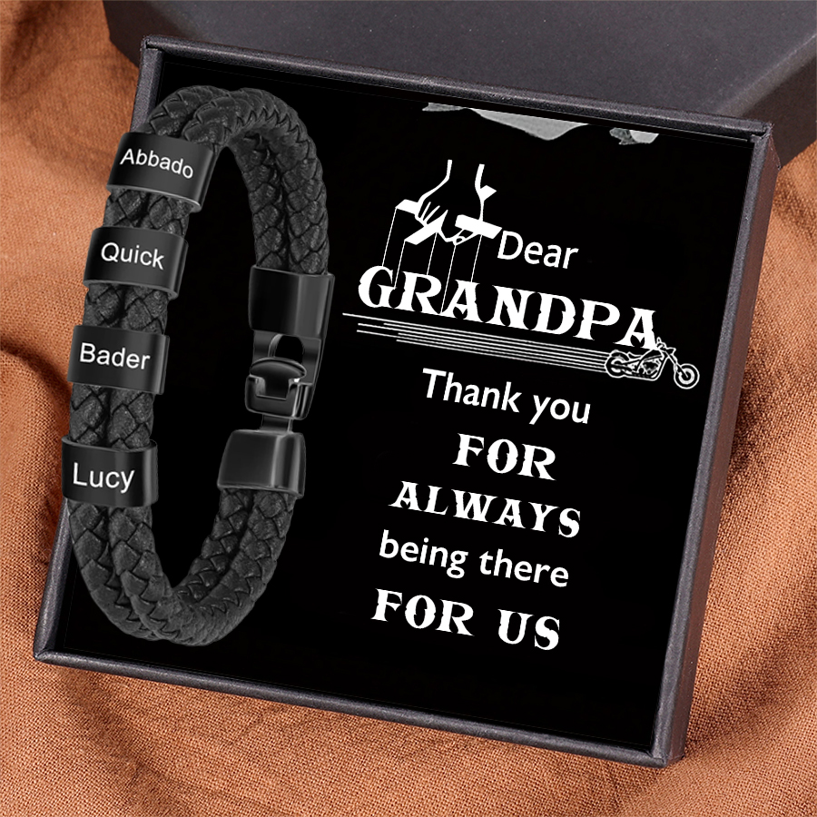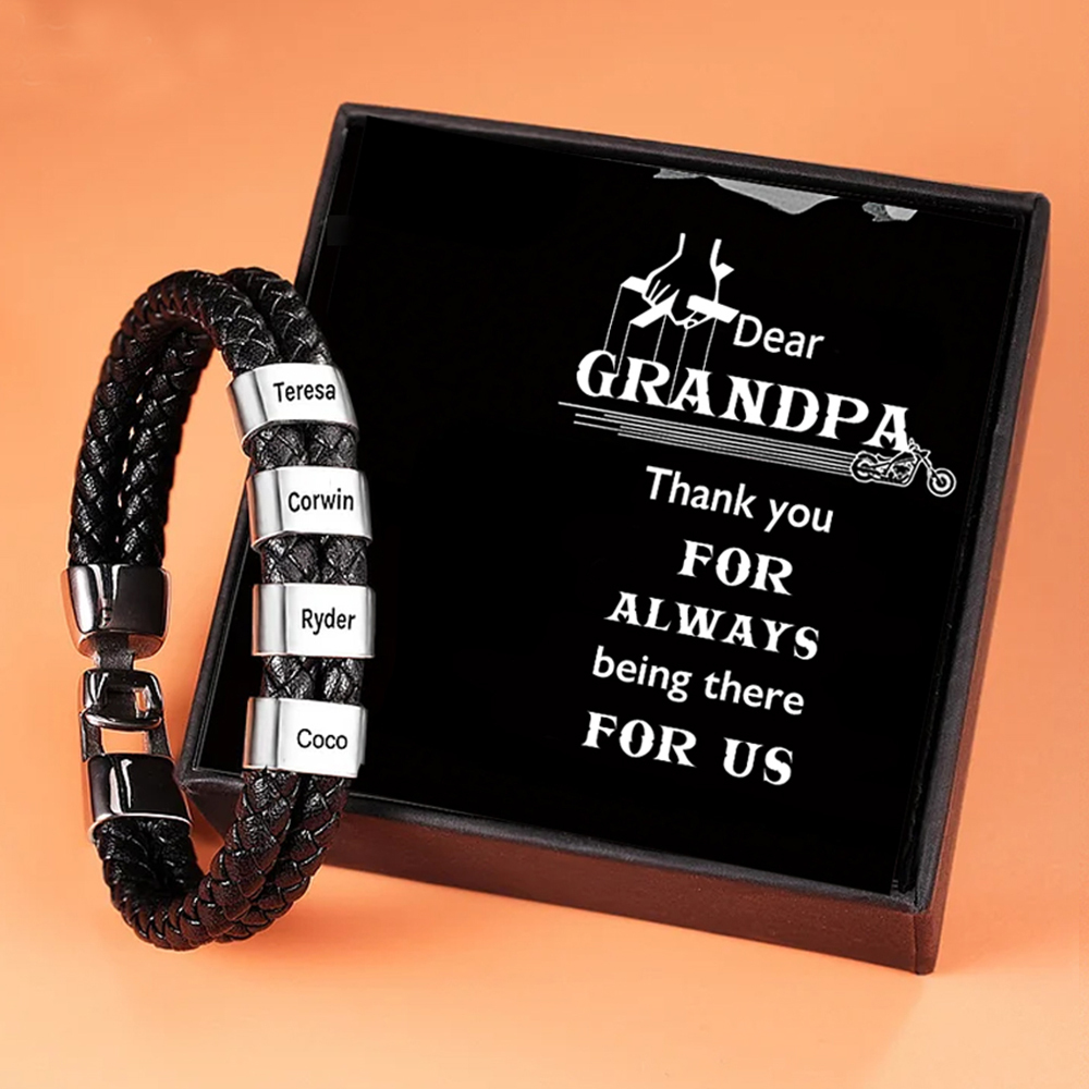 4 Names-Personalized Grandpa Braided Leather Bracelet Card Set, Custom Bracelet Engraved 4 Names Bracelet for Grandpa