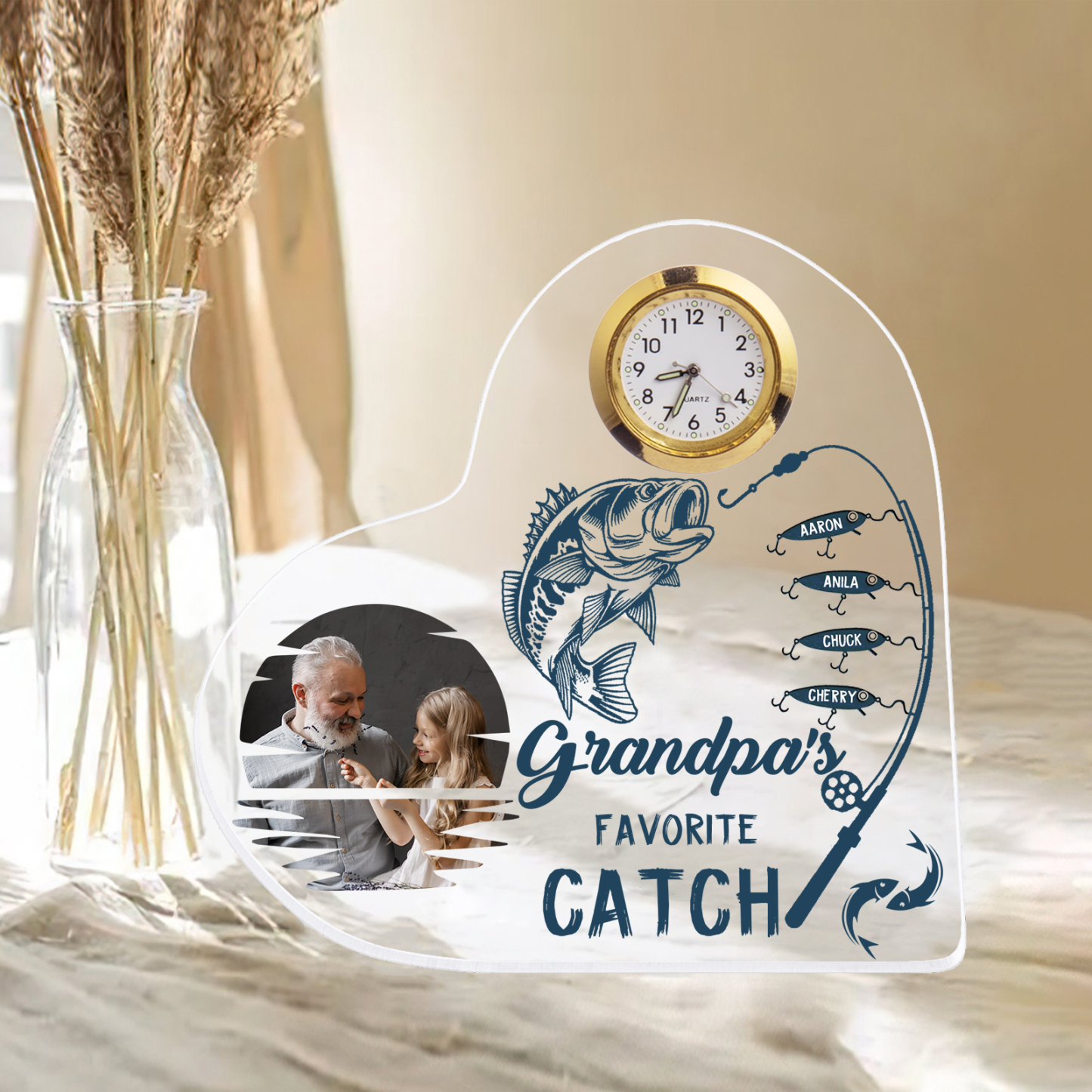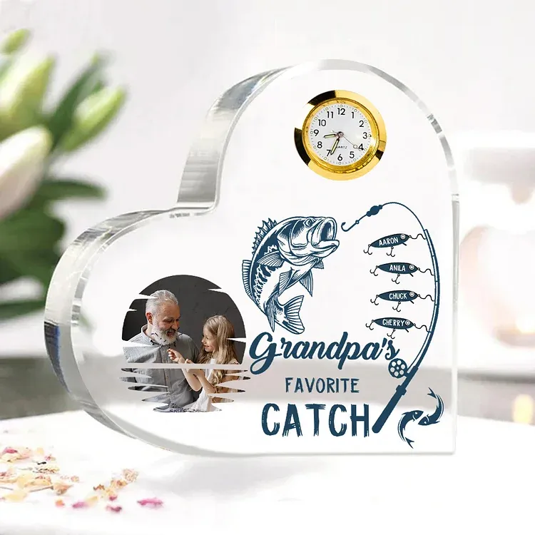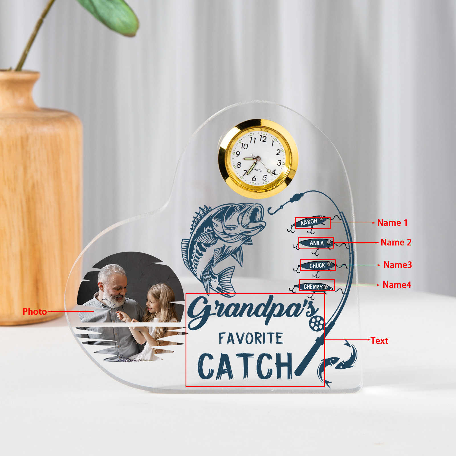 4 Names-Personalized Grandpa Name Acrylic Clock Ornament-Custom Acrylic Fishing Heart Keepsake Desktop for Family