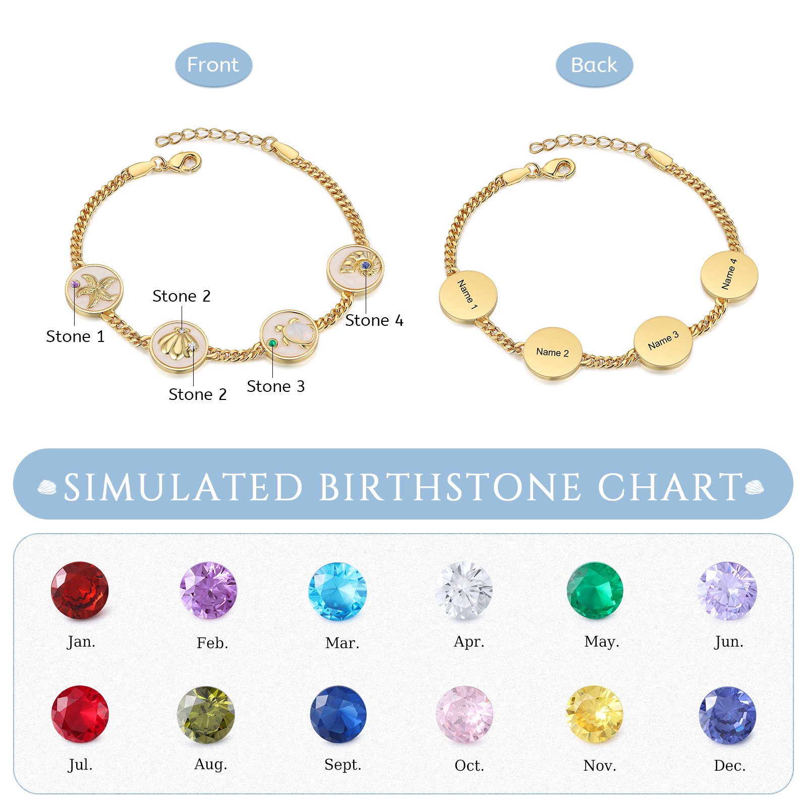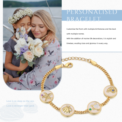 🐚This exquisite bracelet allows you to customize it with up to 5 name and birthstone pendants with marine elements, exquisite three-dimensional shells, starfish, turtle patterns and birthstones are engraved on the pendants, making it a unique and meaningful piece just for you or your loved ones. The adjustable length ensures a perfect fit, catering to various wrist sizes. Crafted with meticulous attention to detail, this bracelet showcases the beauty of fine craftsmanship and personalization.