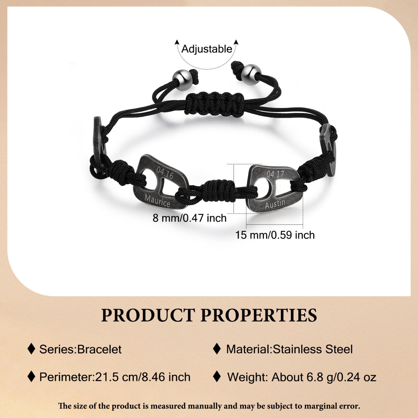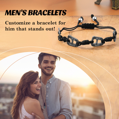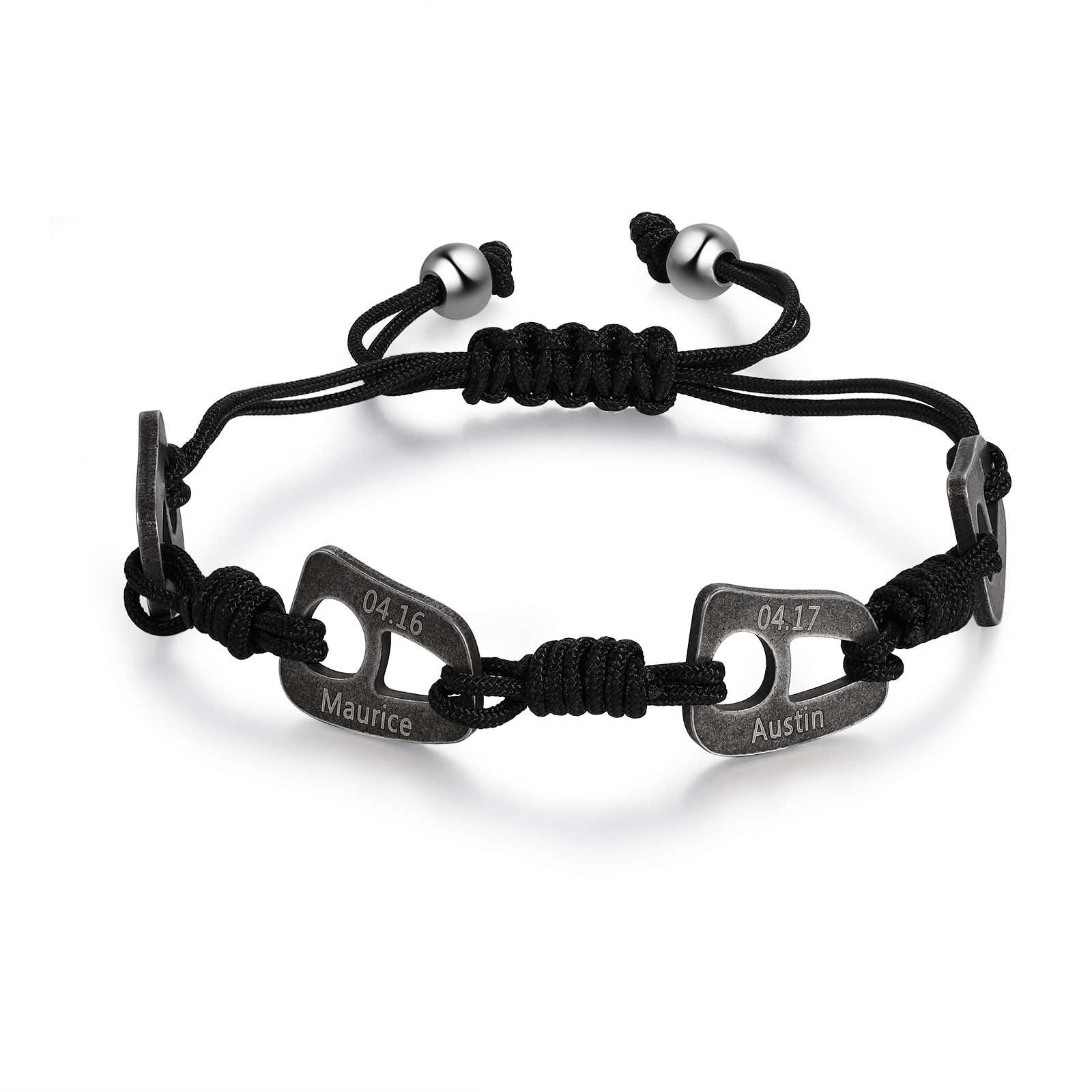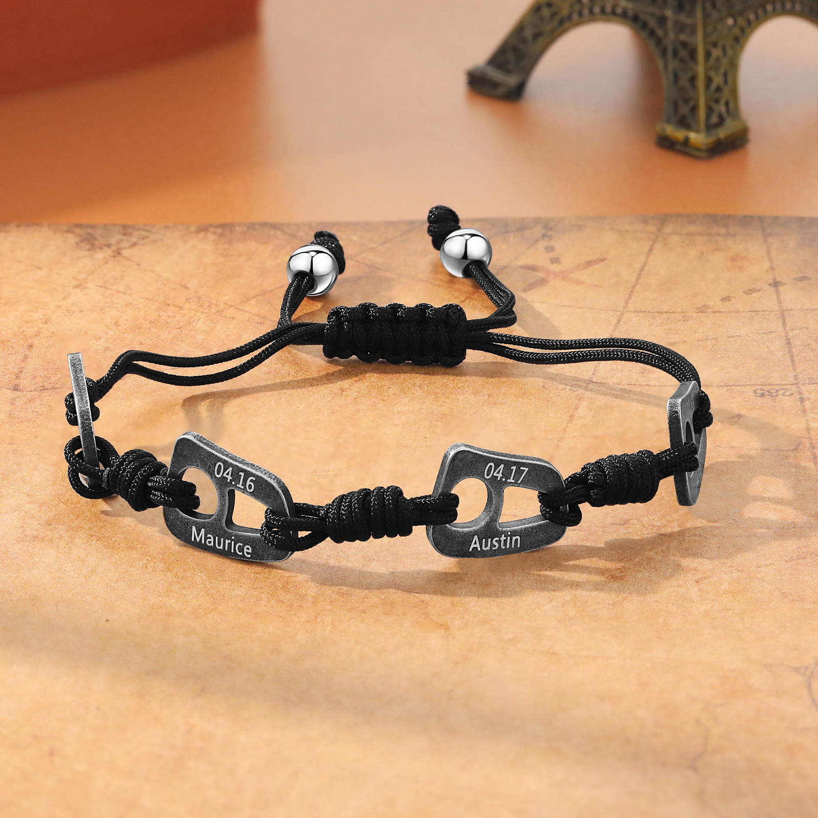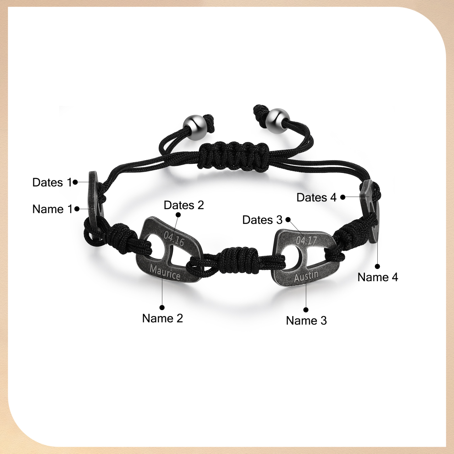 4 Names-Personalized Mens Bracelet Engraved with Names and Date Adjustable Braided Bracelet
