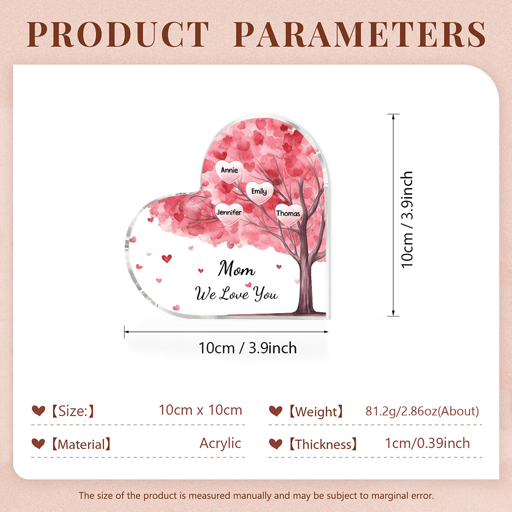 4 Names-Personalized Mom Acrylic Heart Keepsake Custom Text Pink Tree Ornaments Gifts Set With Gift Box for Grandma/Mother