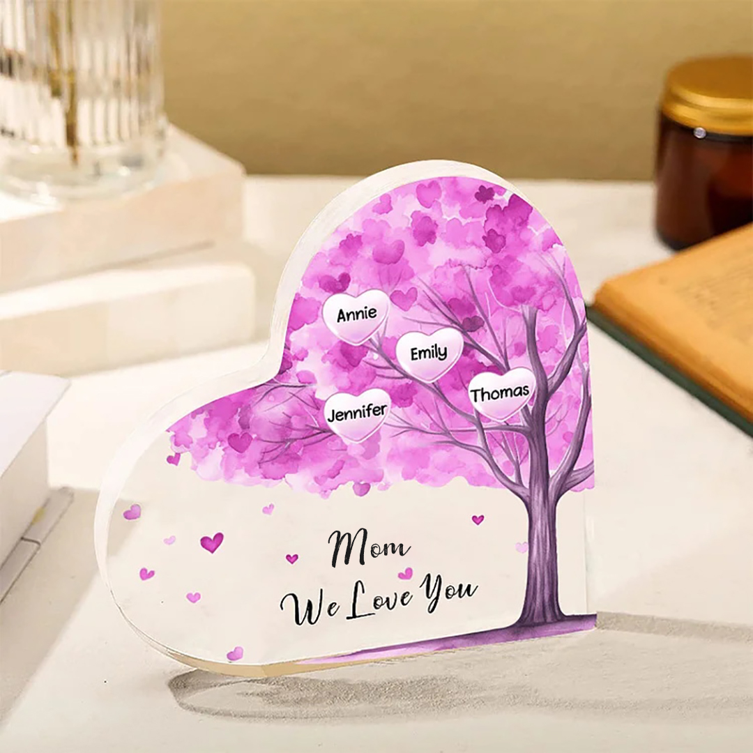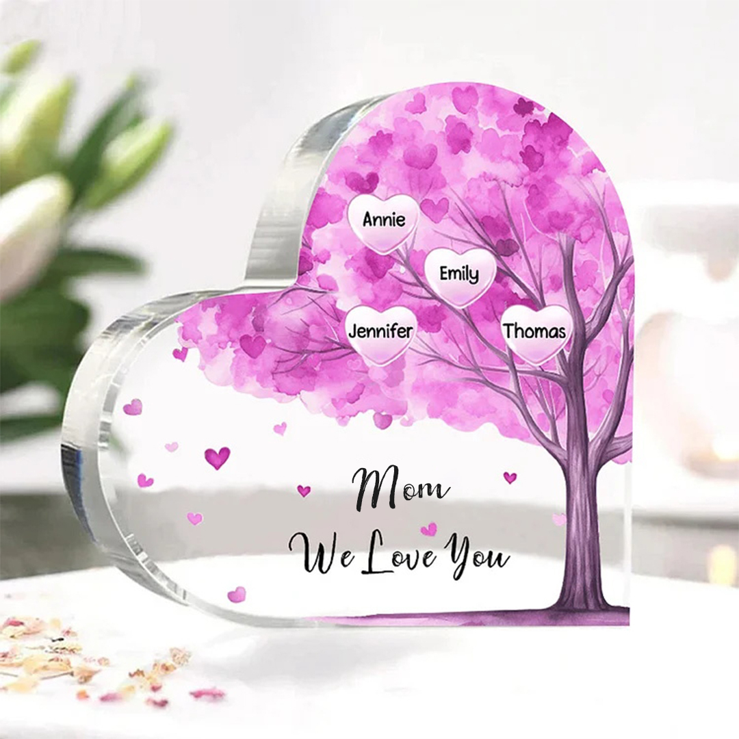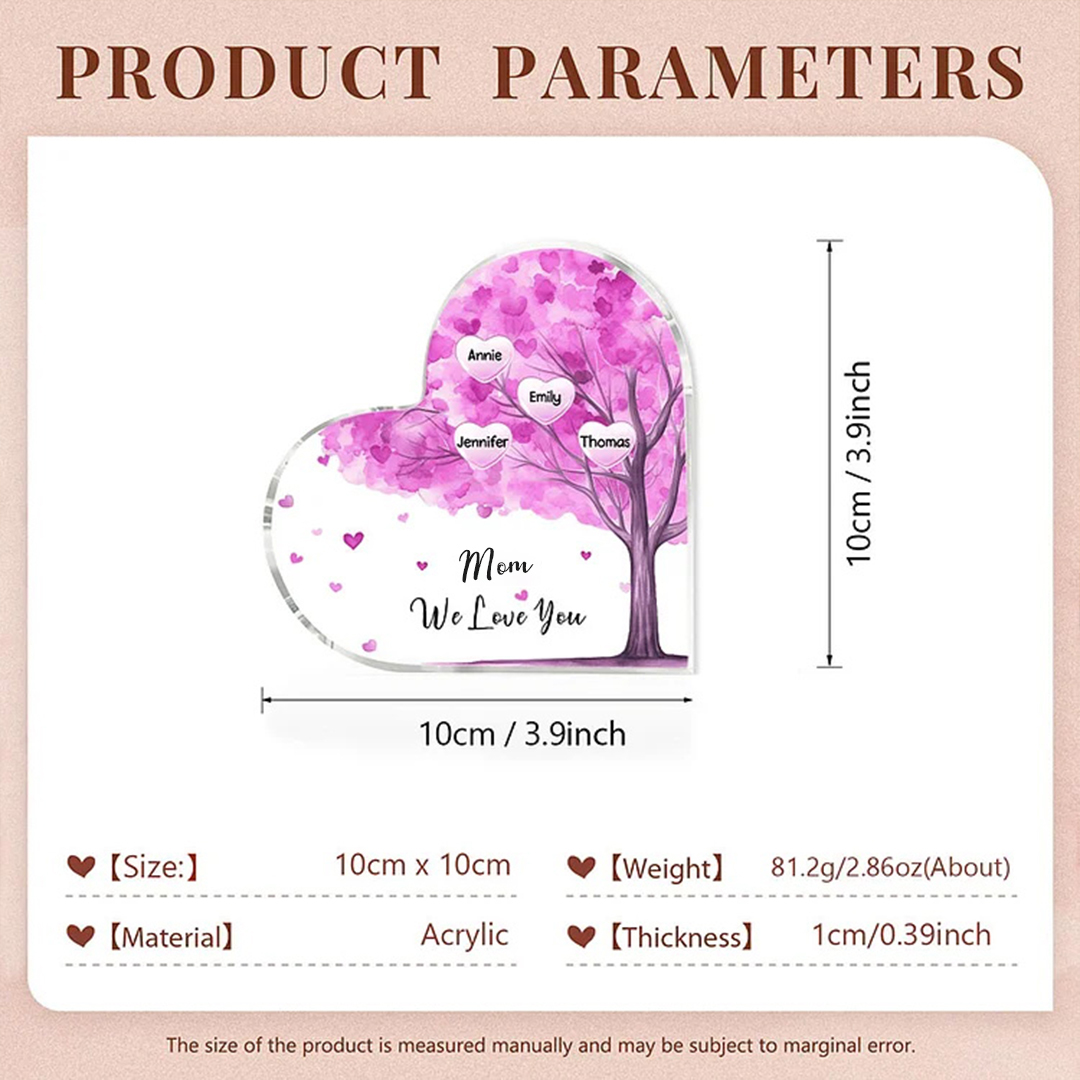 4 Names-Personalized Mom Acrylic Heart Keepsake Custom Text Pink Tree Ornaments Gifts Set With Gift Box for Grandma/Mother