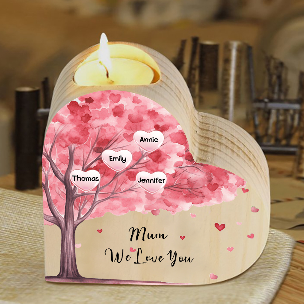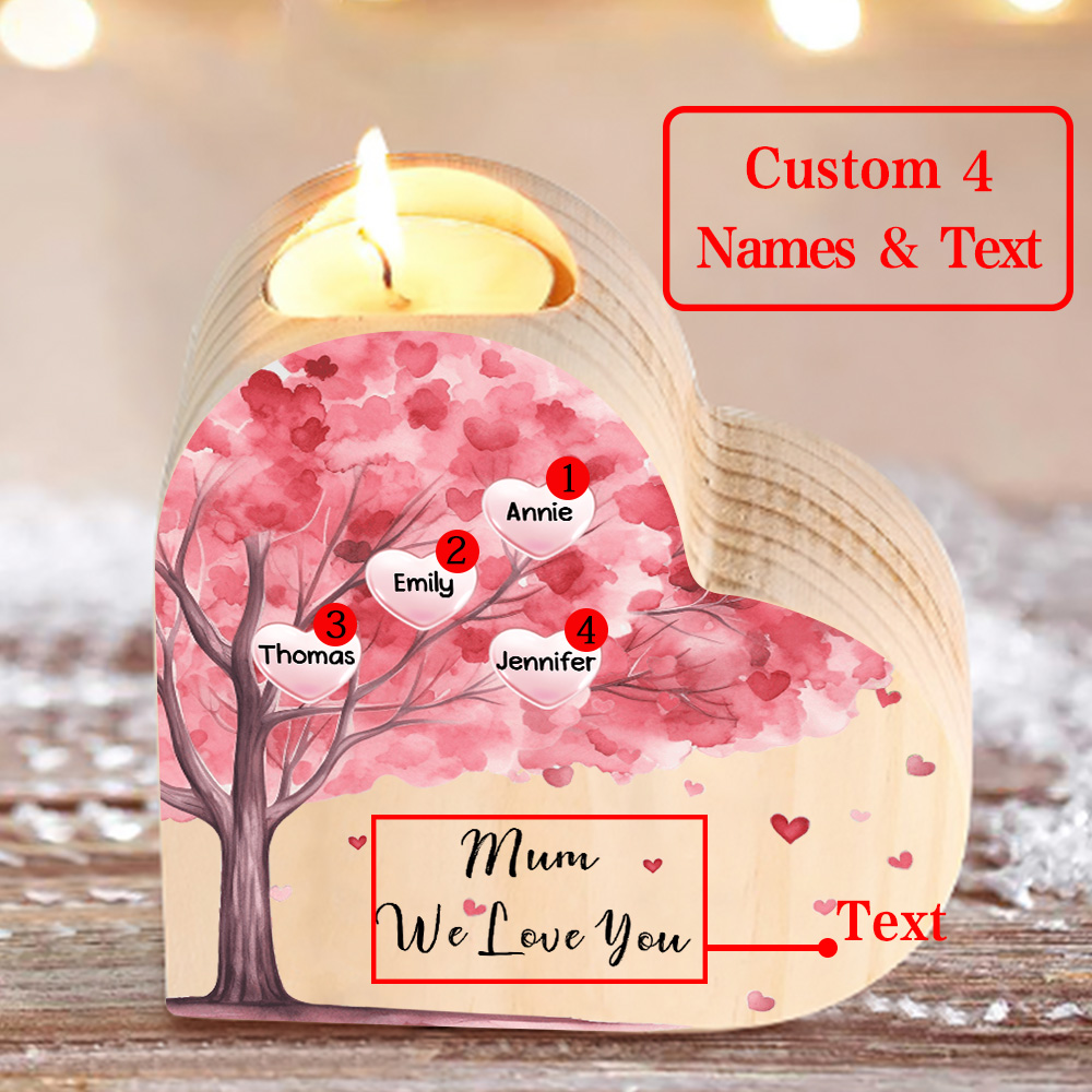 4 Names-Personalized Pink Heart Tree Heart-Shape Candlestick Set With Gift Box Custom Text Mother's Day Gift Wooden Custom Candle Holder For Family