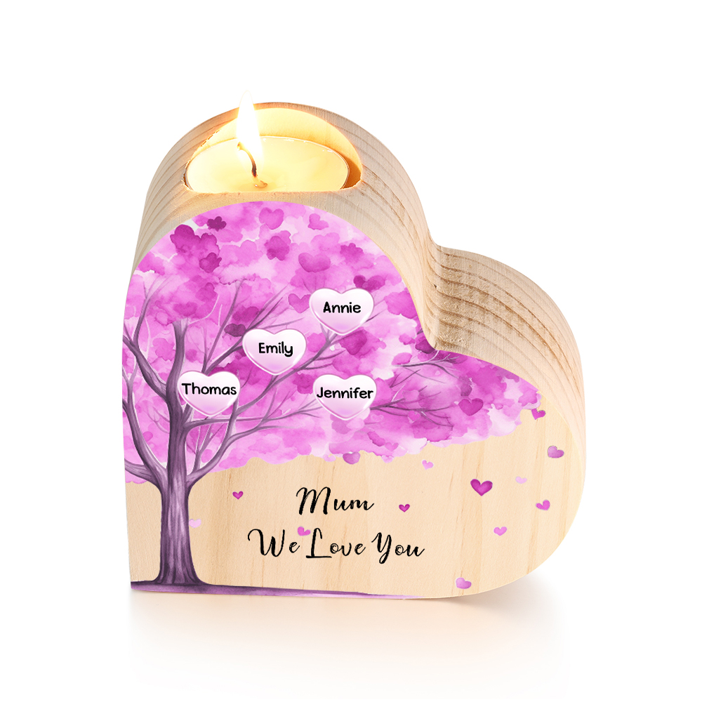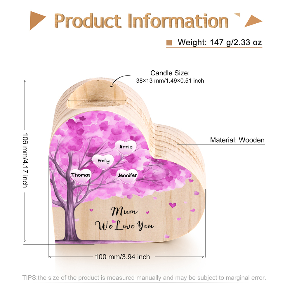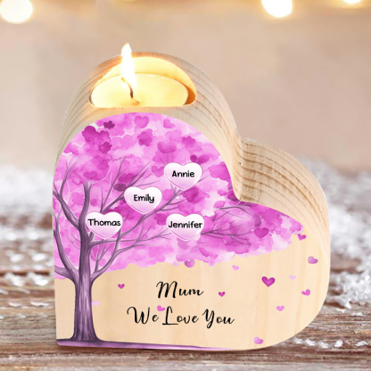 4 Names-Personalized Purple Heart Tree Heart-Shape Candlestick Set With Gift Box Custom Text Mother's Day Gift Wooden Custom Candle Holder For Family